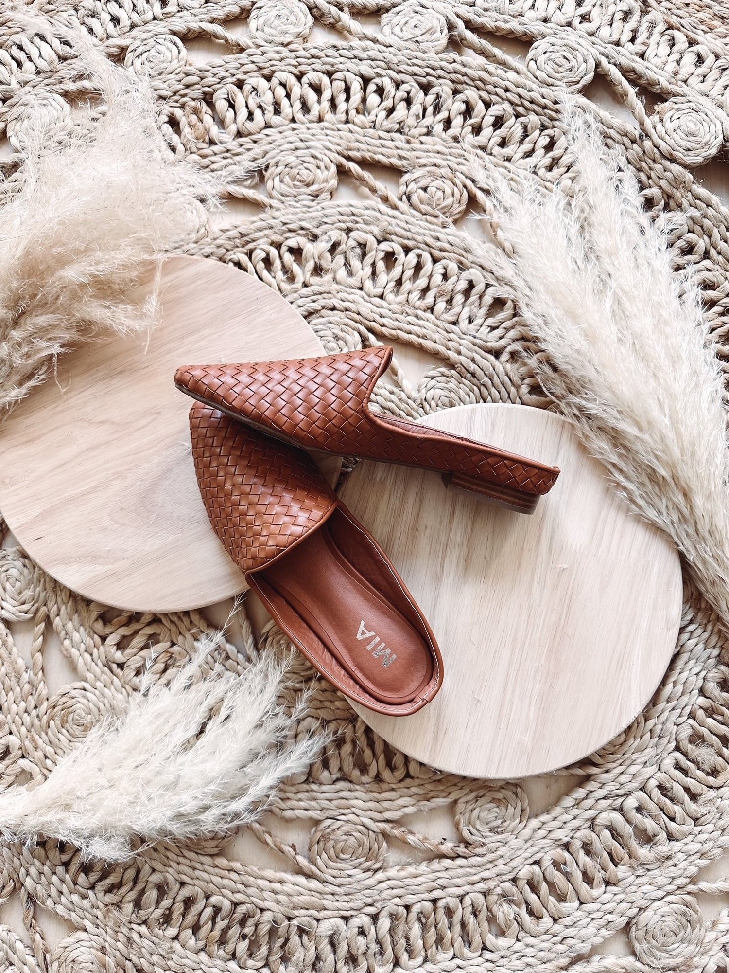 Warm brown woven mule with a slight backing. Super comfy, runs slightly big.