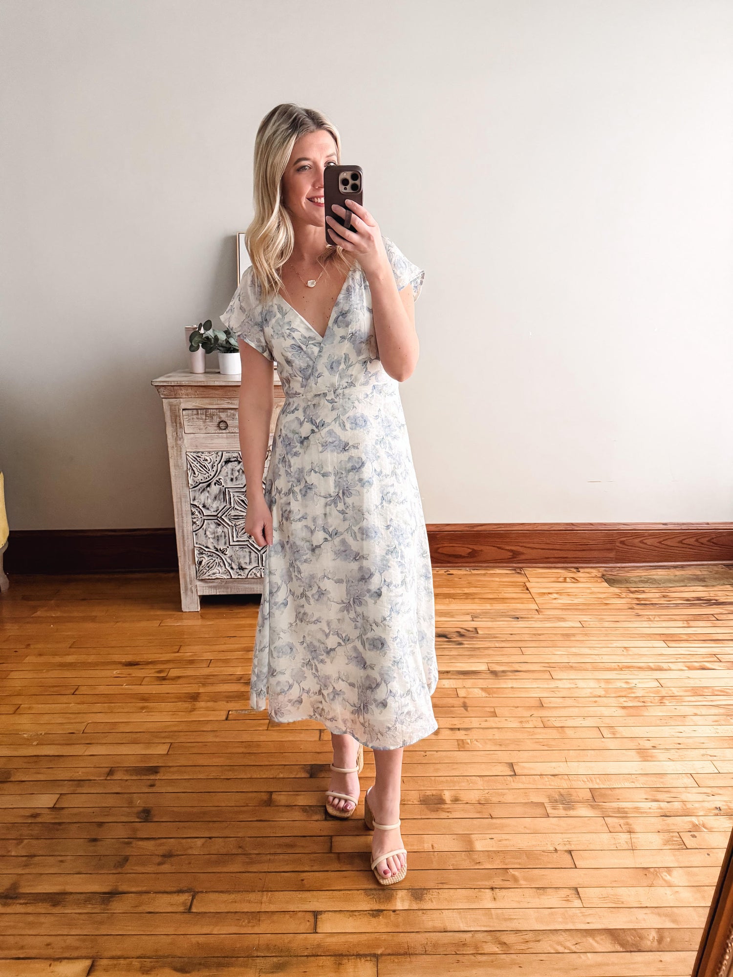 Slip into the Anya and let those gorgeous ivory and blue florals do the talking. This charming midi dress features a flattering V-neckline, breezy short sleeves, and a hidden back zipper for an effortless fit. Fully lined for comfort and confidence, it's your go-to piece for everything from brunch dates to garden parties. Simple, stylish, and undeniably sweet.