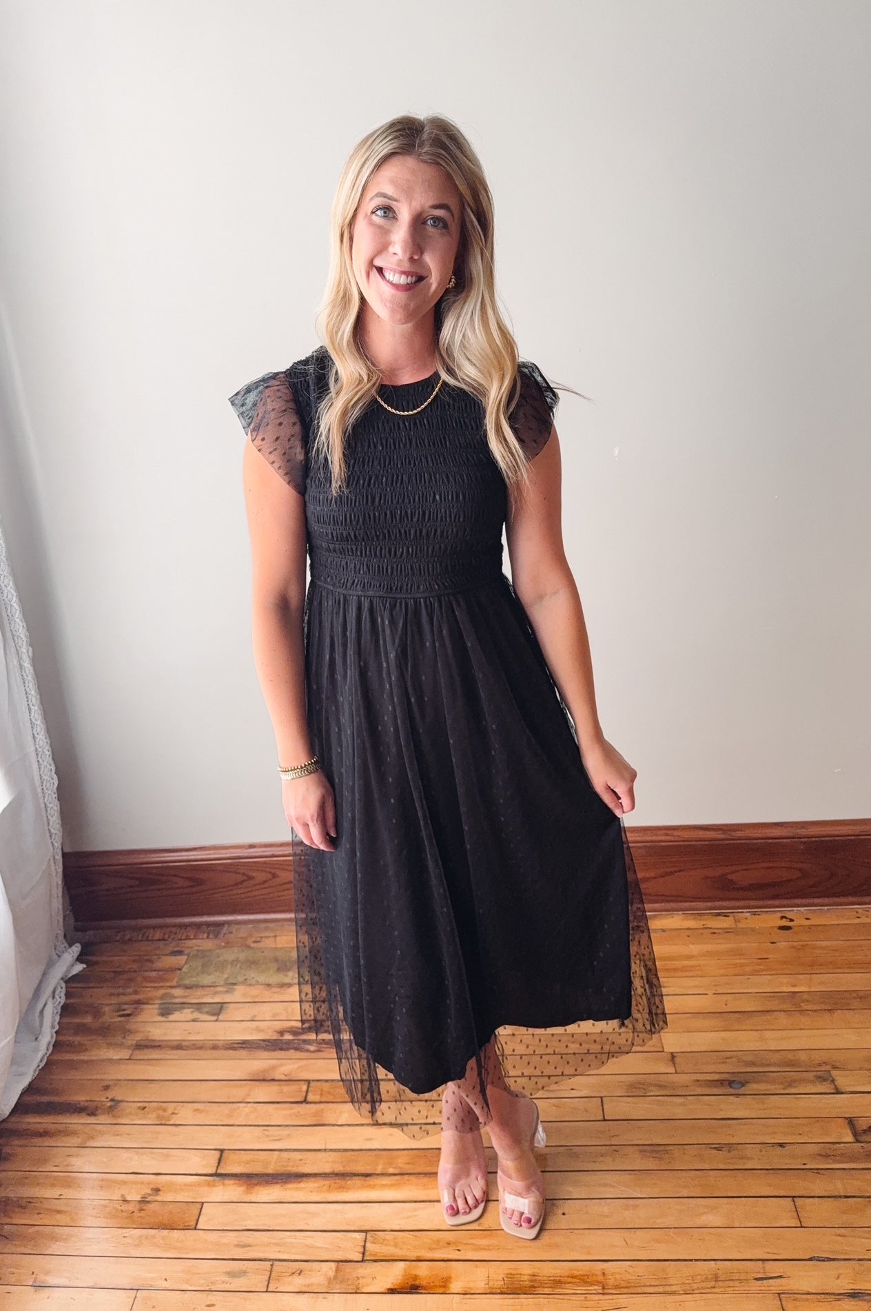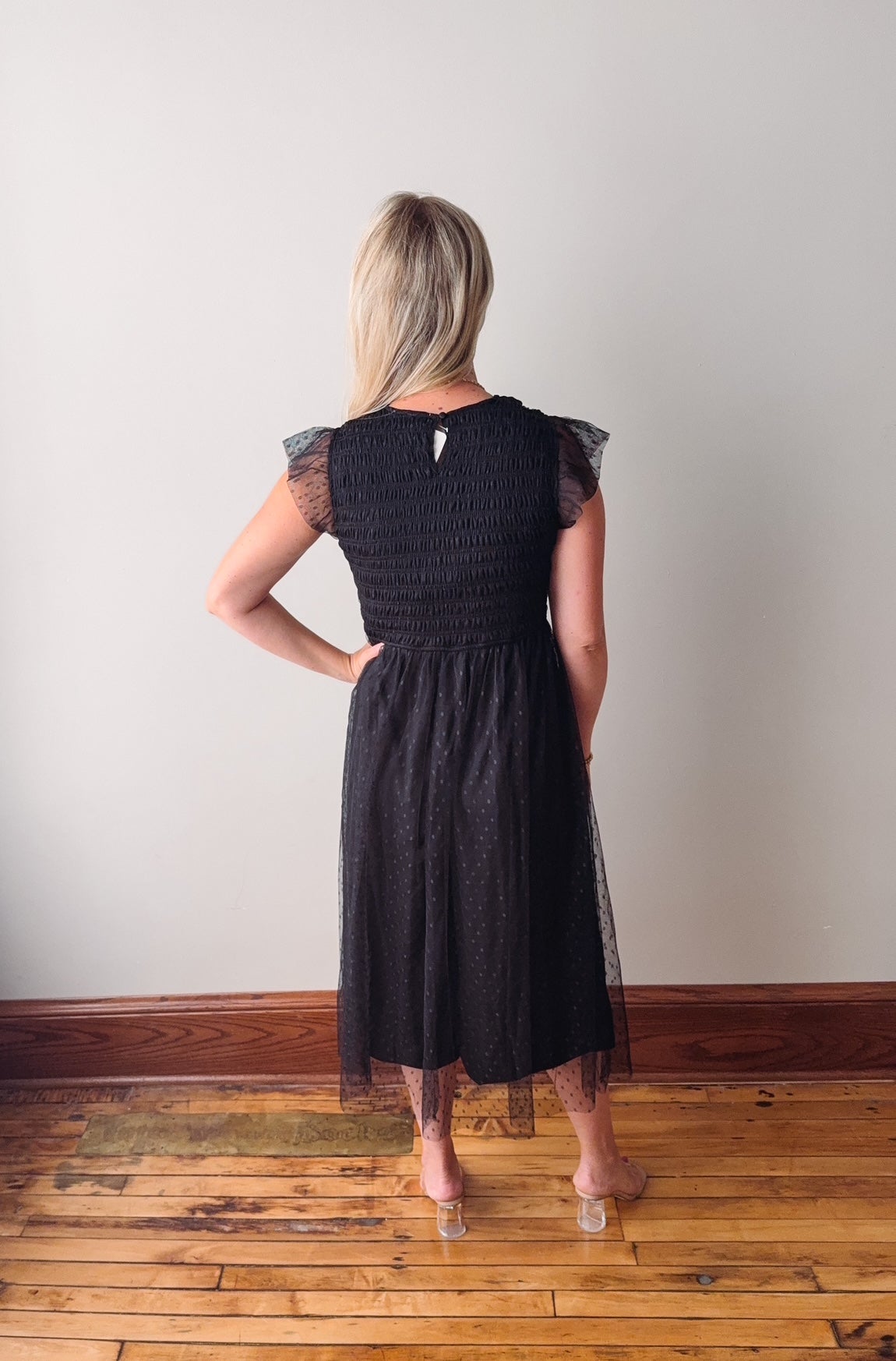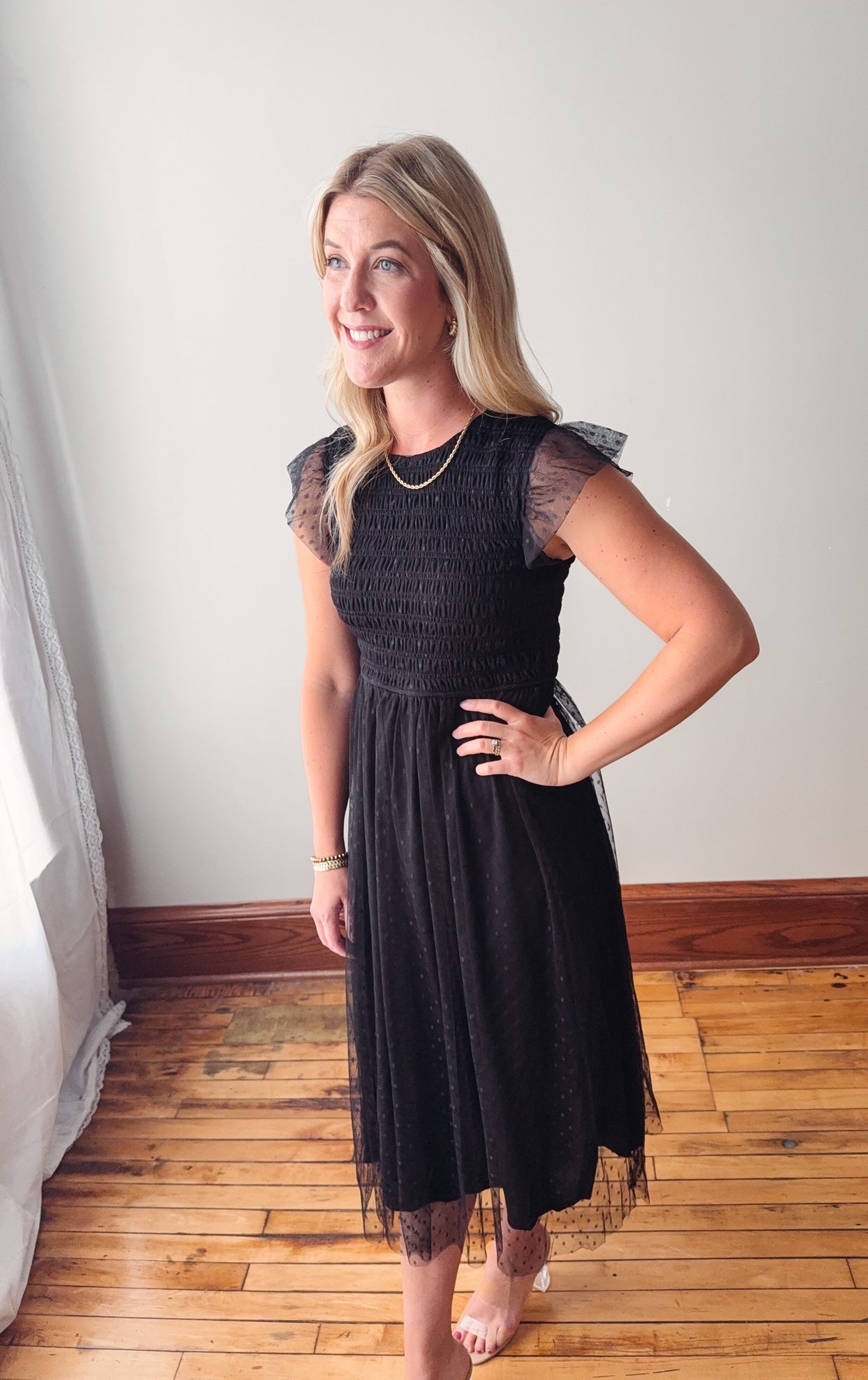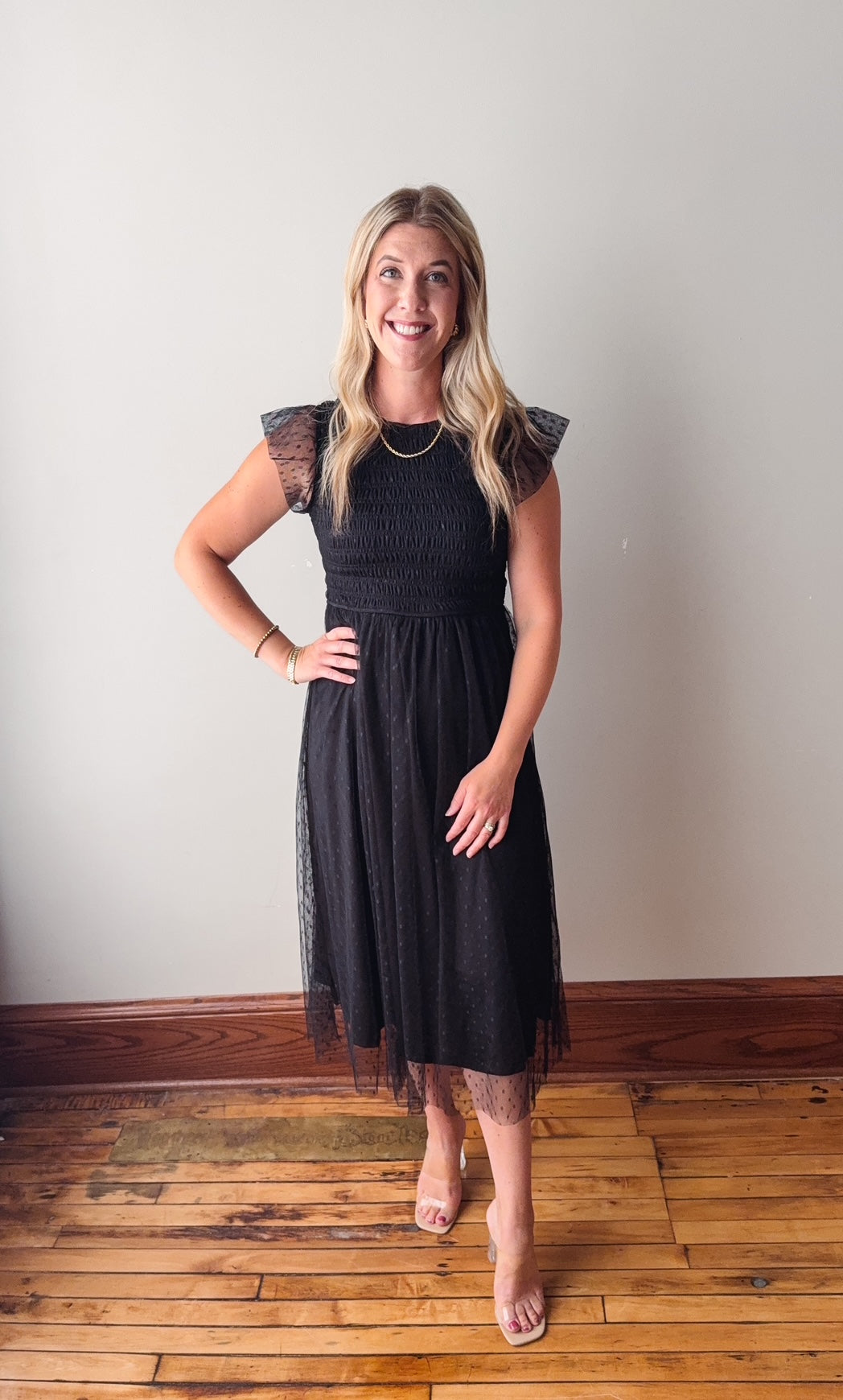 POLKA DOT CHIFFON SMOCKED MIDI DRESS