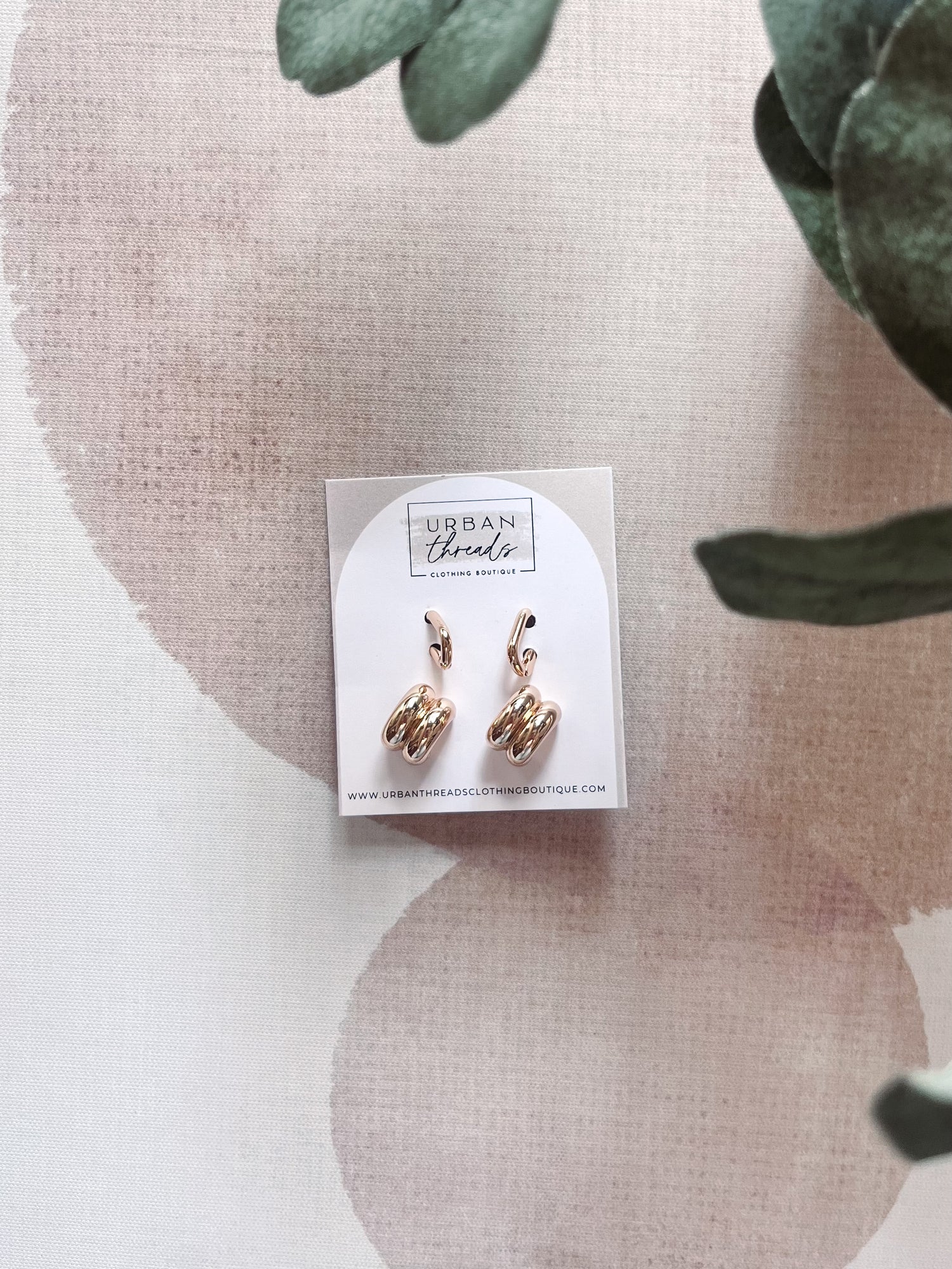 Two pairs of gold earrings, one simple huggie and one double bubble hoop.