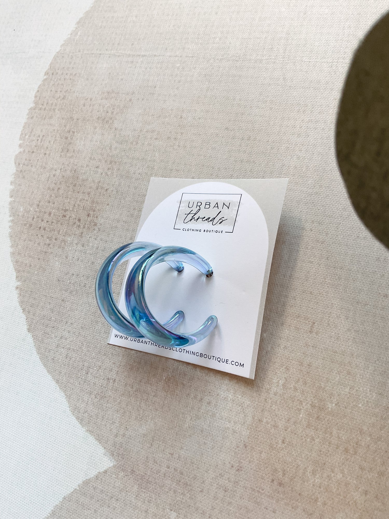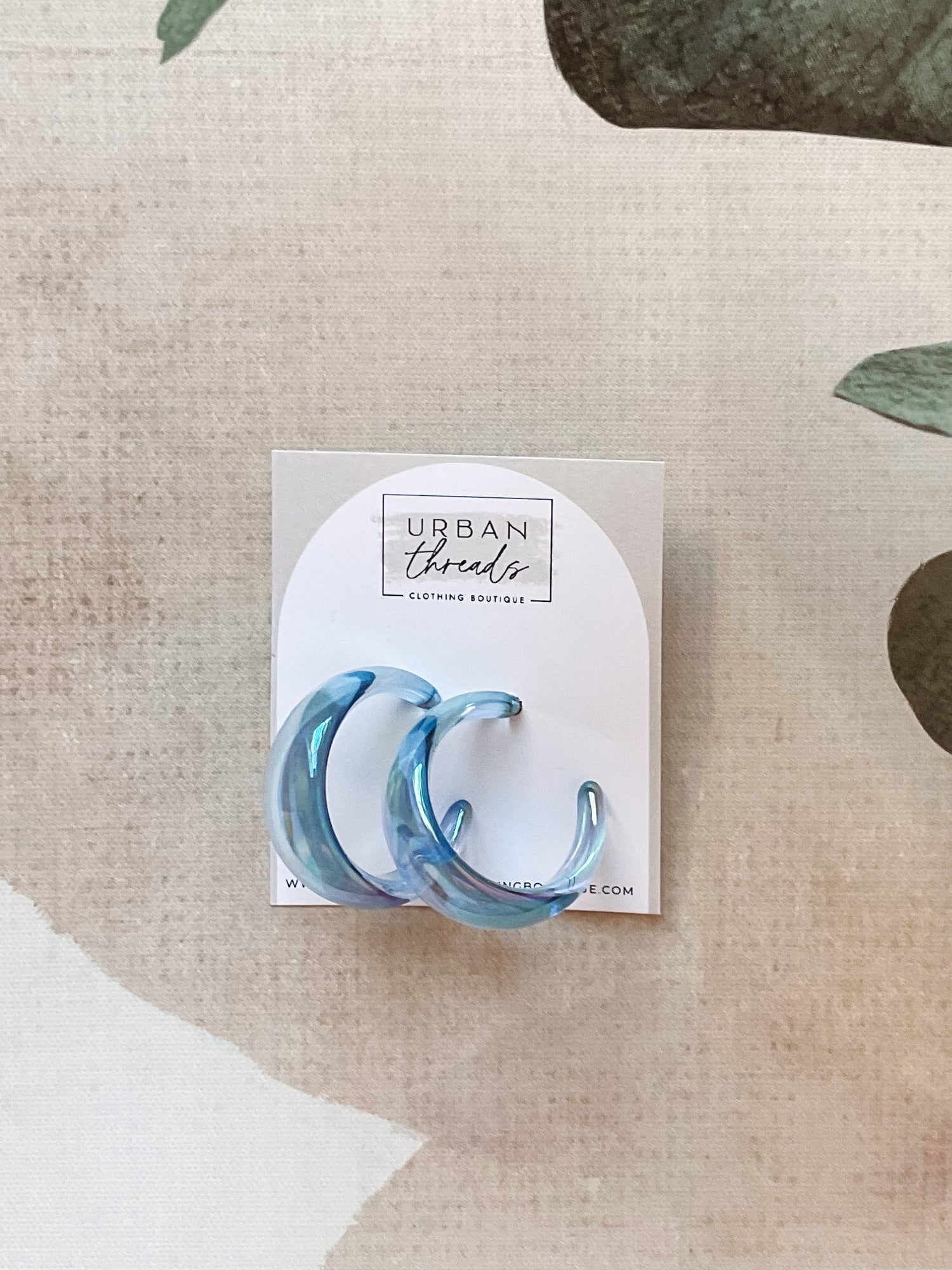 Acrylic clear crystal inspired hoops are lightweight and trendy. Simple earrings in transparent resin with a iridescent inside of the hoop.