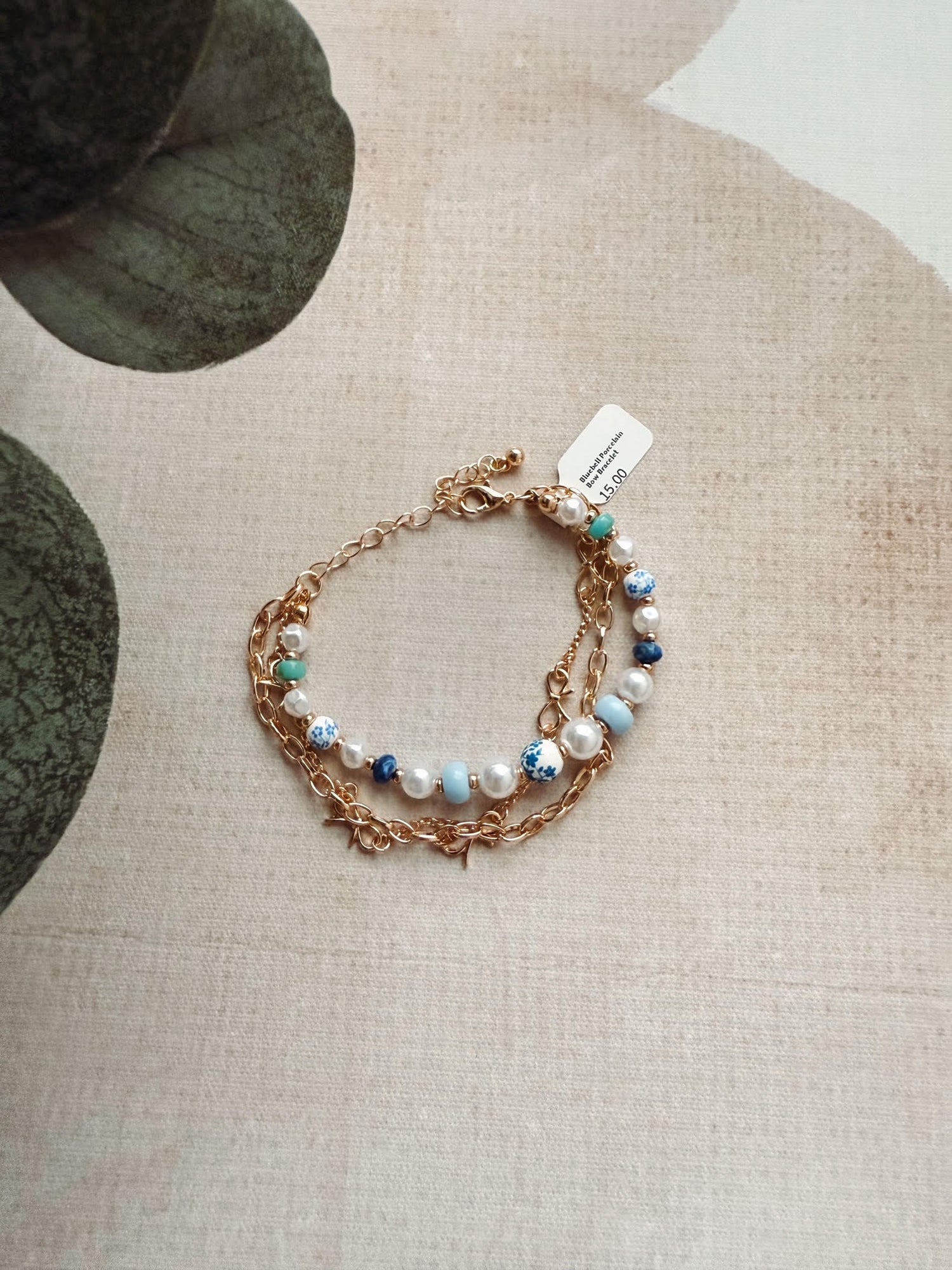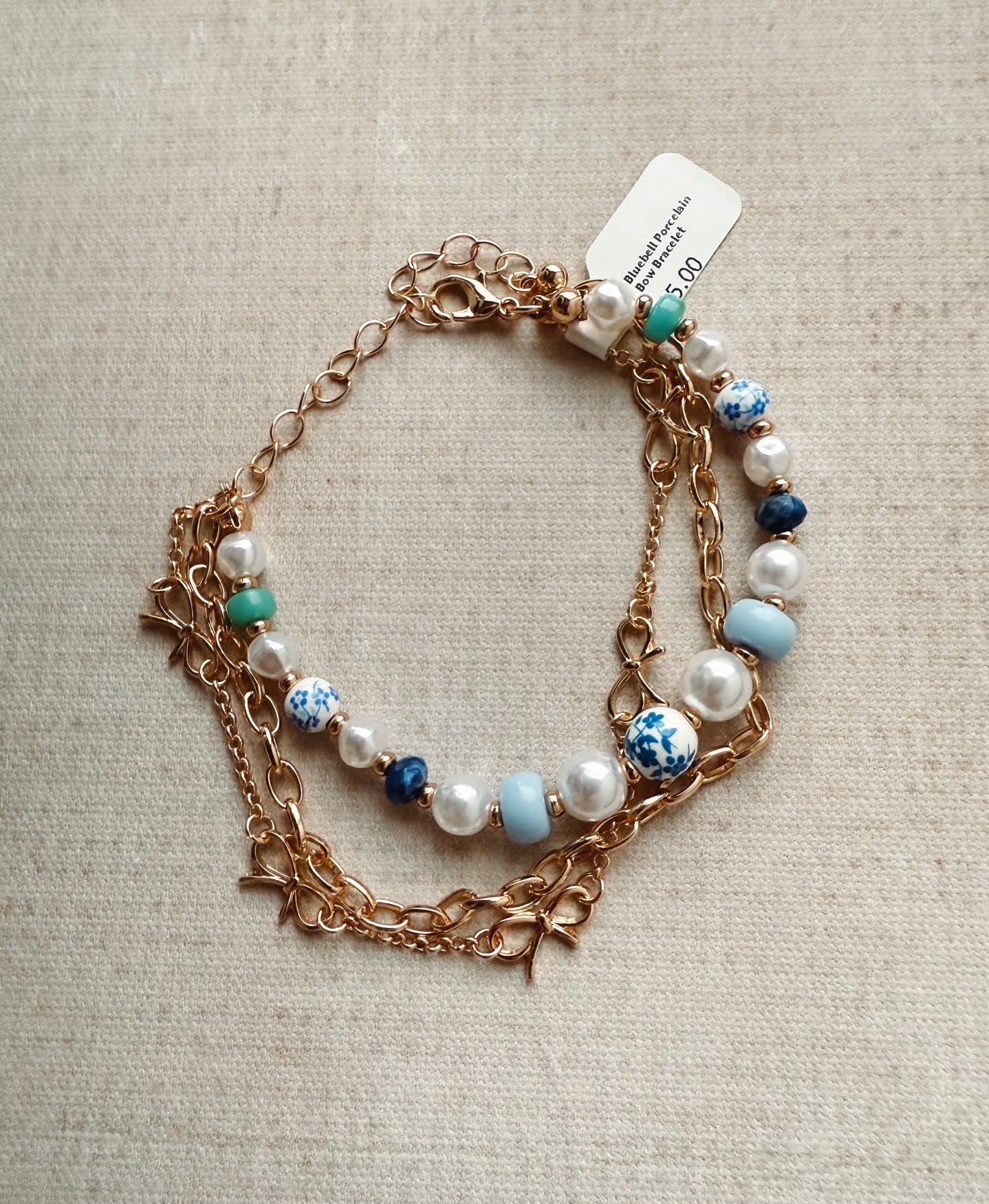 Delicate, charming, and effortlessly elegant — the Bluebell Porcelain Bow Bracelet features a beautiful mix of porcelain ceramic beads, glossy faux pearls, and soft blue accents, finished with a dainty gold bow detail. The layered gold chain adds a refined touch, making this bracelet perfect for dressing up your everyday look or adding something special to an occasion outfit.