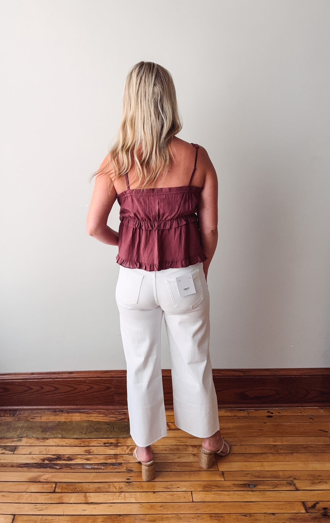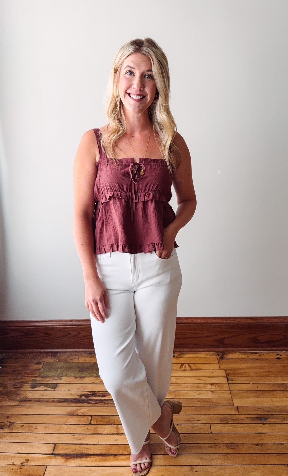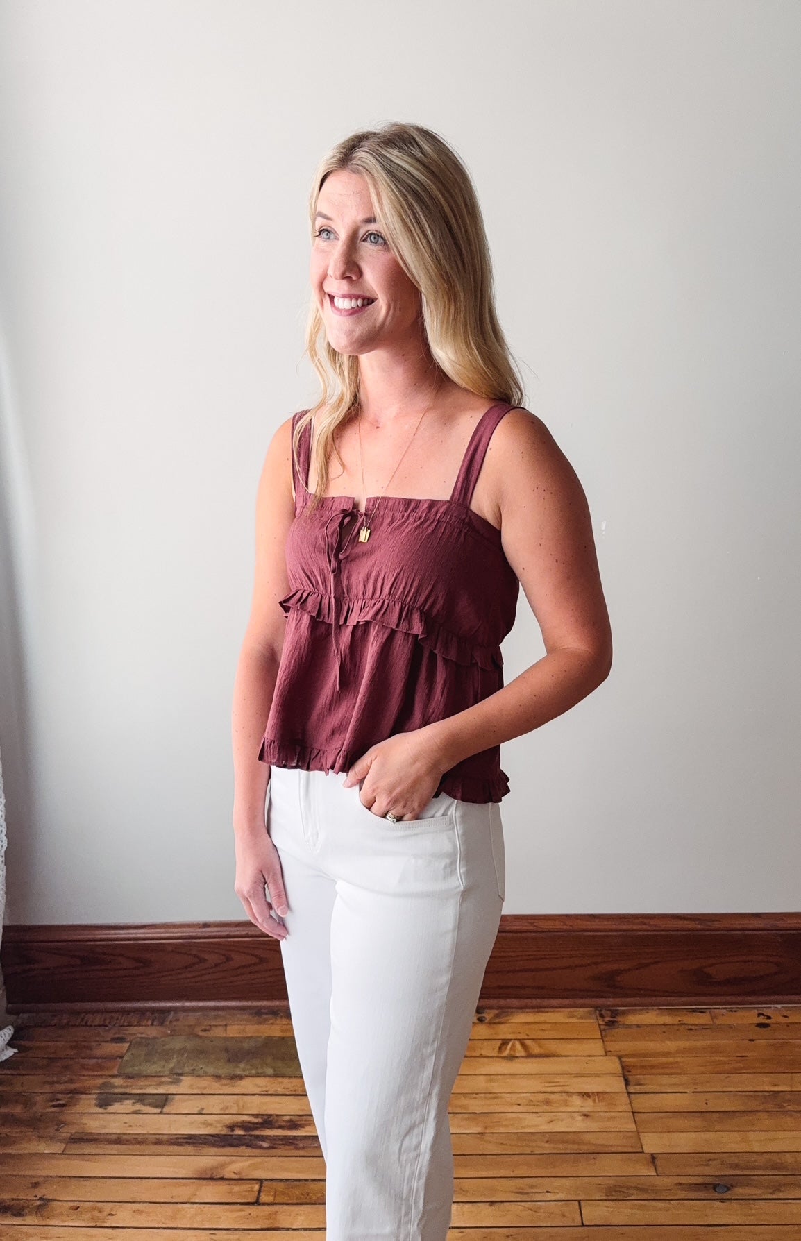 Add a splash of fun to your wardrobe with the Brooklynn Merlot Ruffle Tiered Top. Its playful ruffle tiers create a flirty, feminine silhouette, while the rich merlot hue adds a touch of bold color. Perfect for sunny days or layering under your favorite jacket, this tank top brings effortless charm to any outfit.