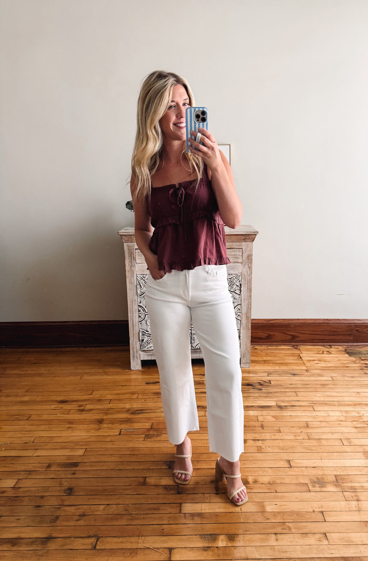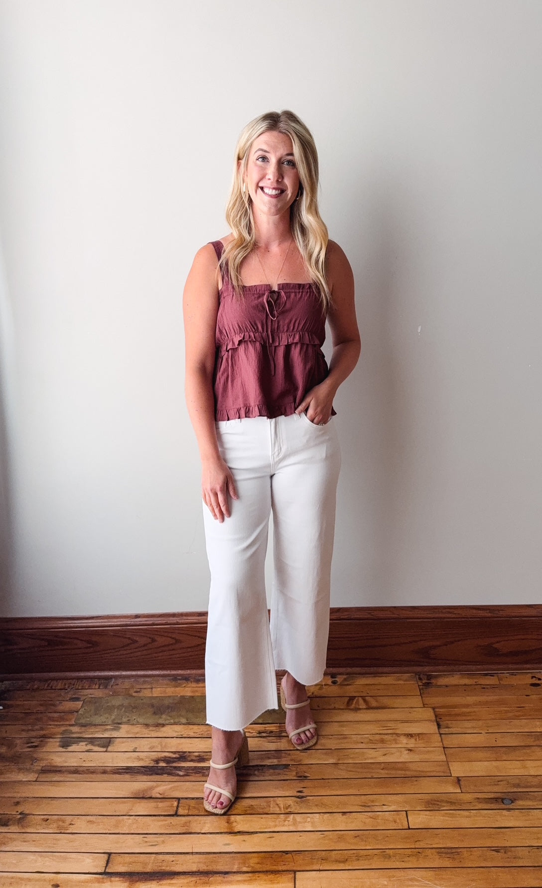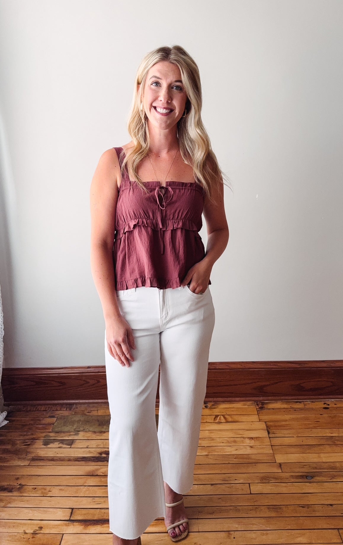Add a splash of fun to your wardrobe with the Brooklynn Merlot Ruffle Tiered Top. Its playful ruffle tiers create a flirty, feminine silhouette, while the rich merlot hue adds a touch of bold color. Perfect for sunny days or layering under your favorite jacket, this tank top brings effortless charm to any outfit.