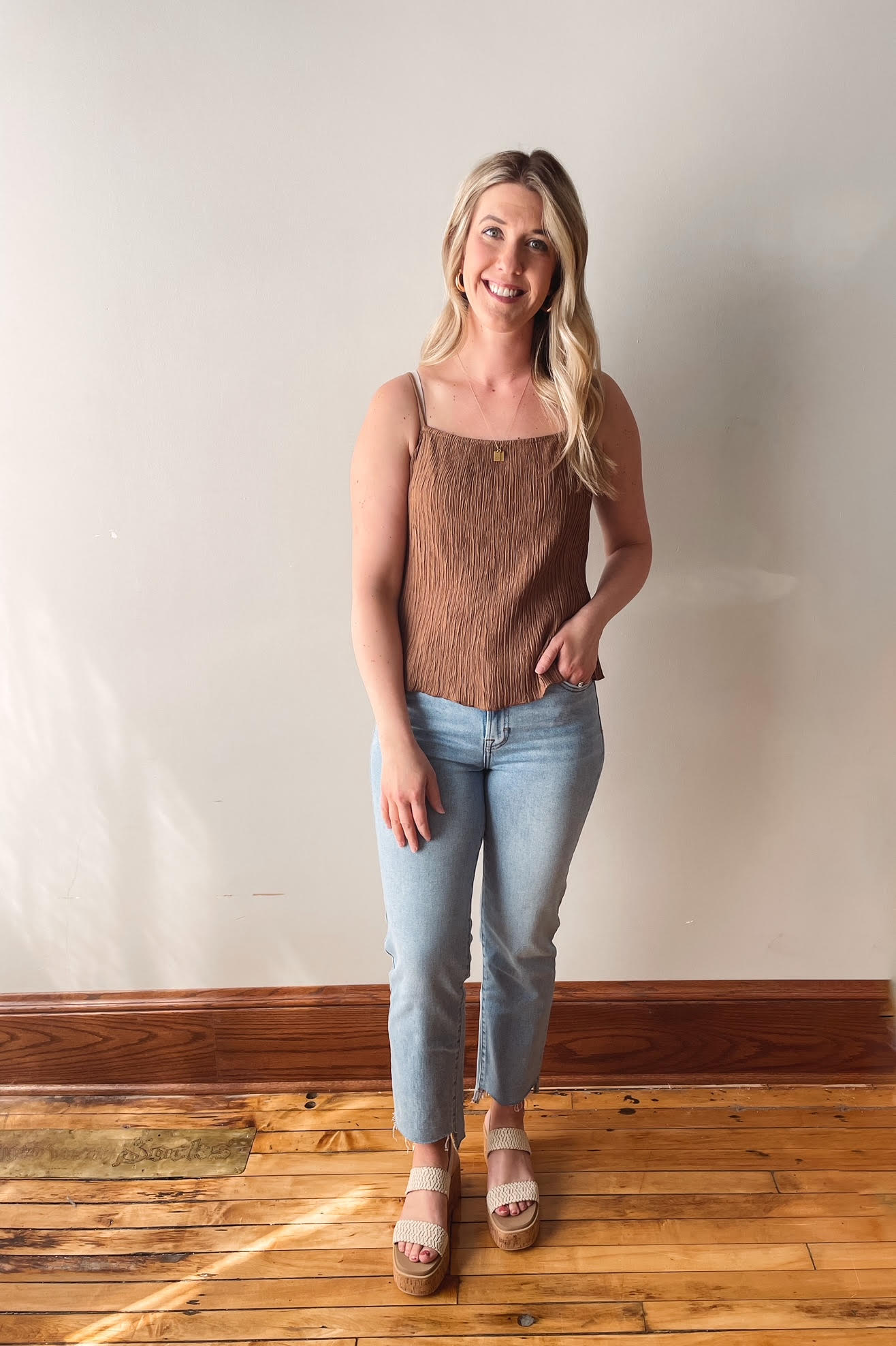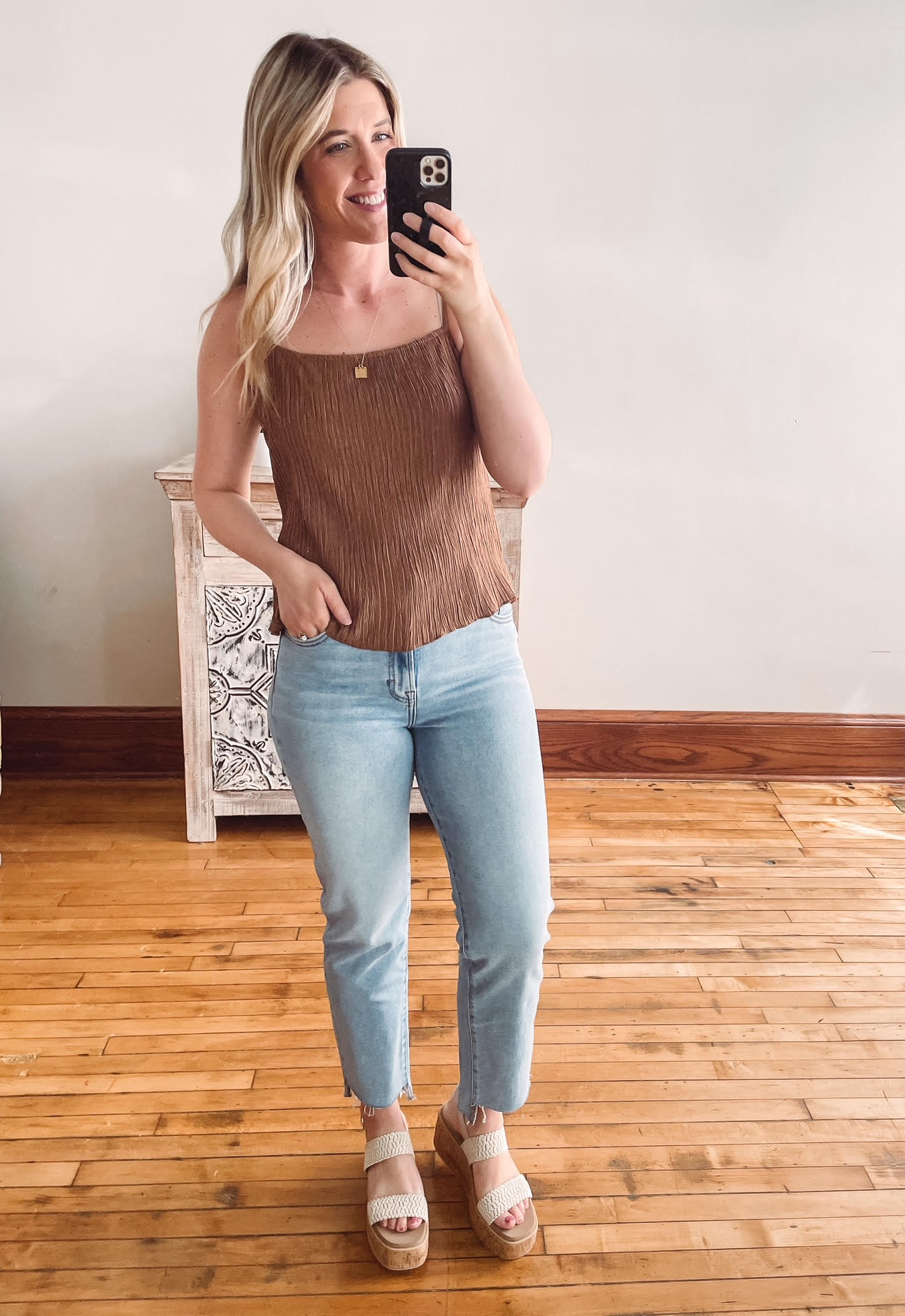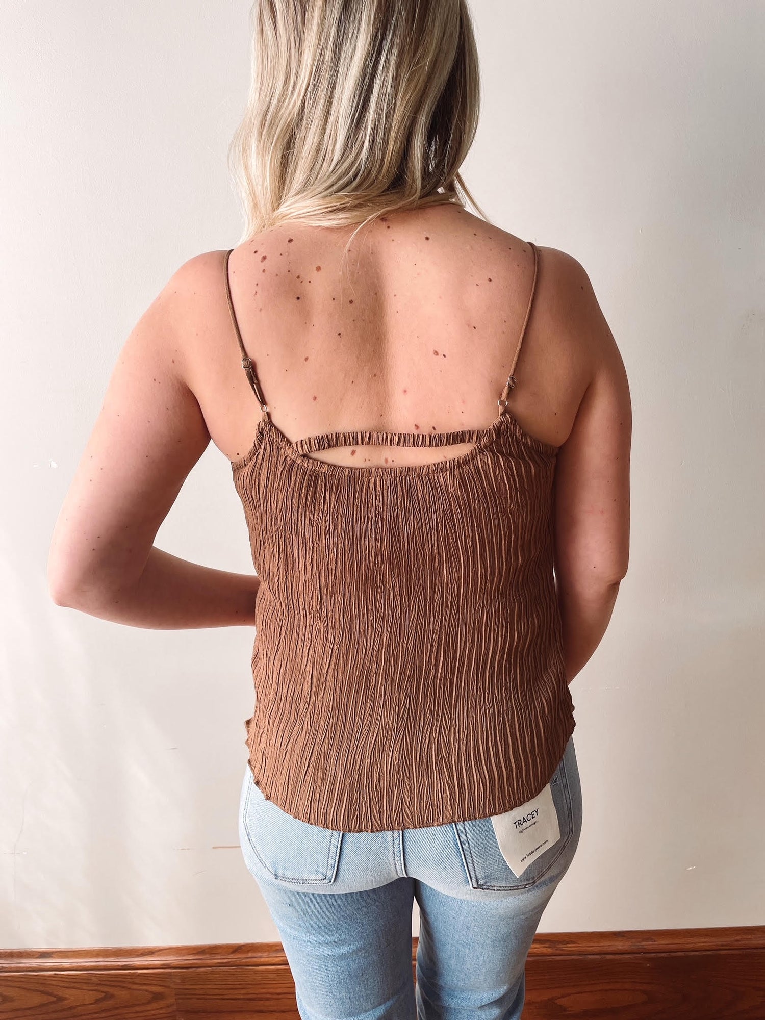 STRAIGHT NECKLINE SLEEVELESS ADJUSTABLE SPAGHETTI STRAP ELASTIC BACK STRAP PLISSE PATTERN CAMISOL BLOUSE NOT LINED SHELL: 62% RAYON, 38% POLYESTER CONTRAST:,62%RAYON, 38% POLYESTER LINING:100%POLYESTER