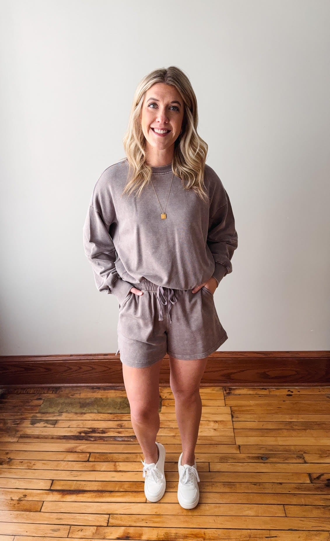 Discover the ultimate in comfort and style with our Brynn Mocha Pullover + Short Set. Crafted from mineral-washed French terry fabric, this set features a relaxed fit and detailed seaming, perfect for lounging at home or on the go. Elevate your casual wardrobe with this effortlessly chic duo.