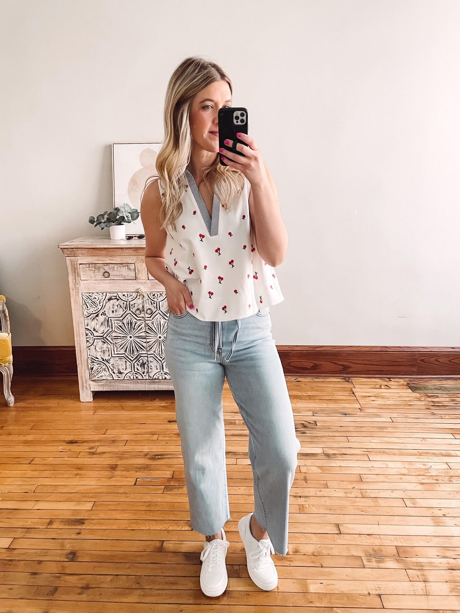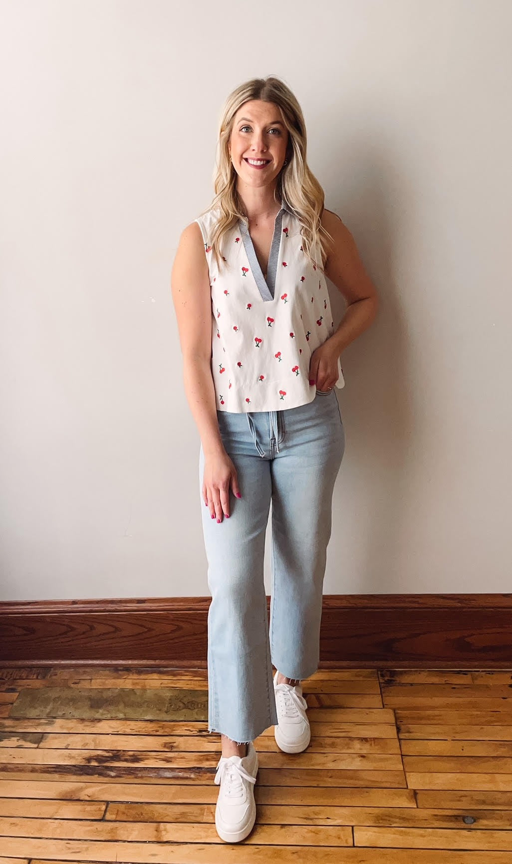STRIPE CONTRAST CHERRY MOTIF COLLARED TANK TOP