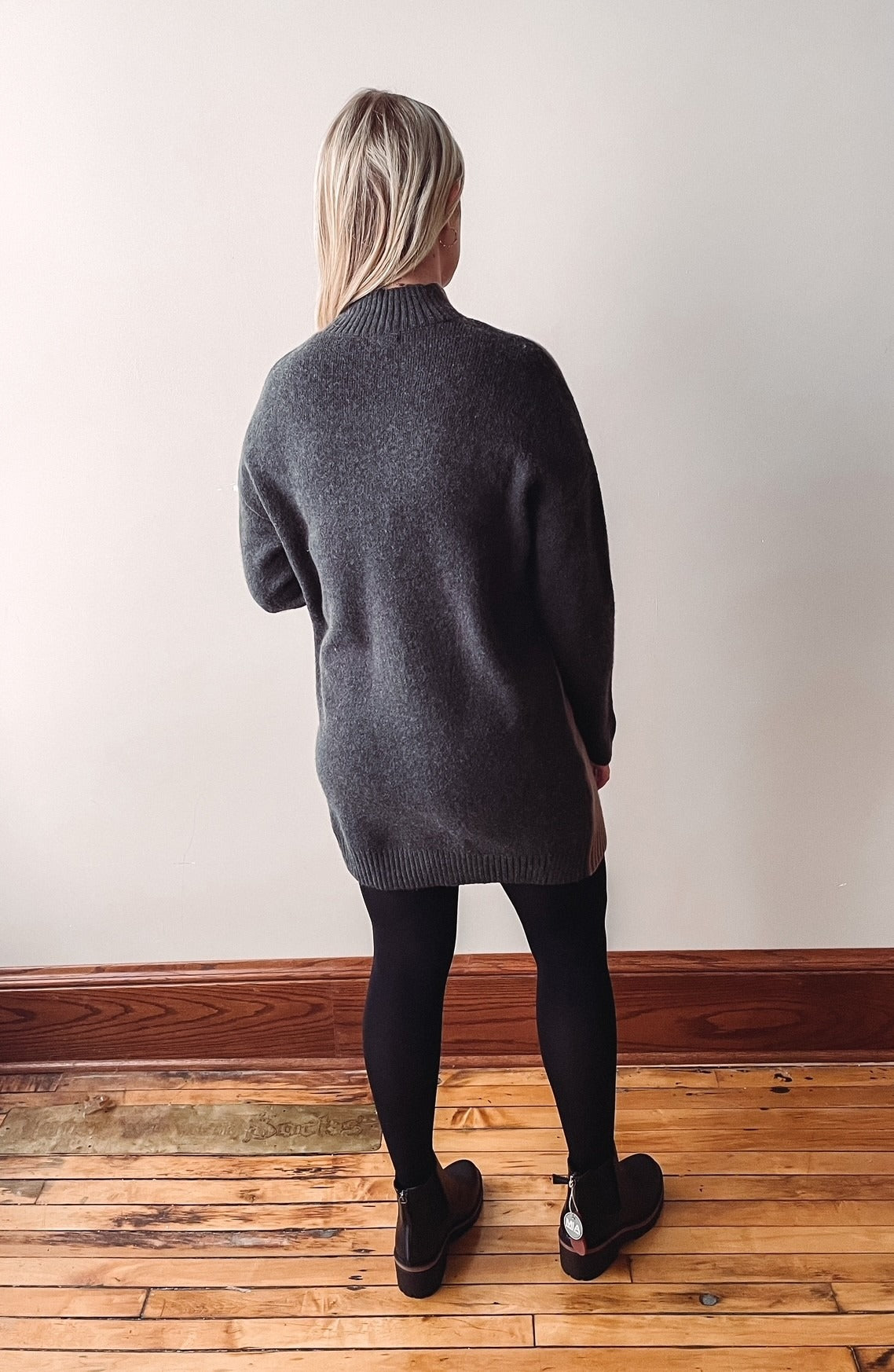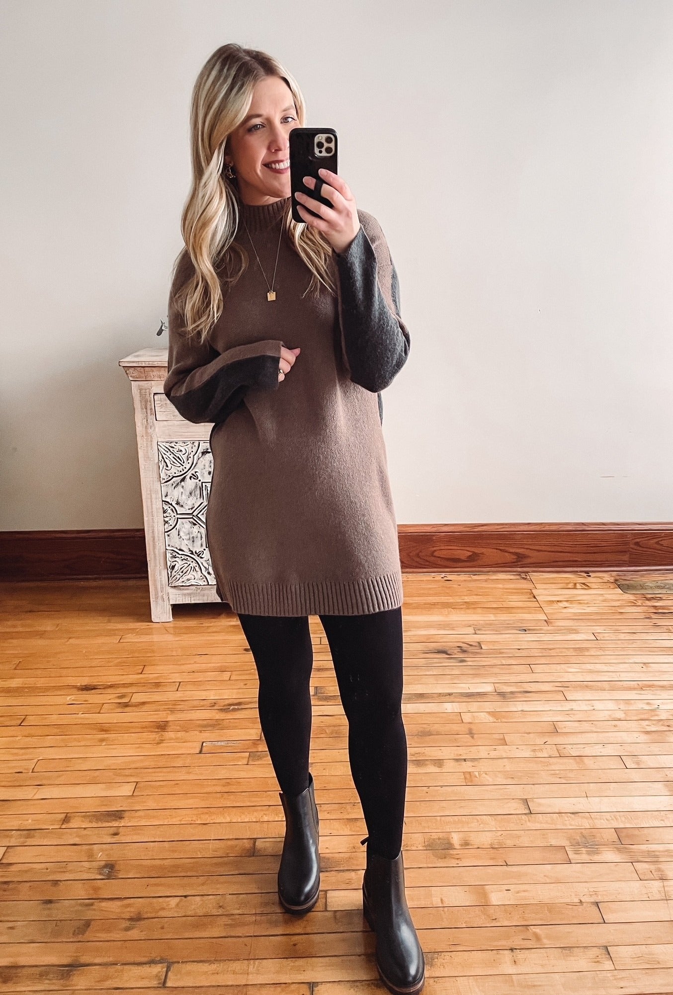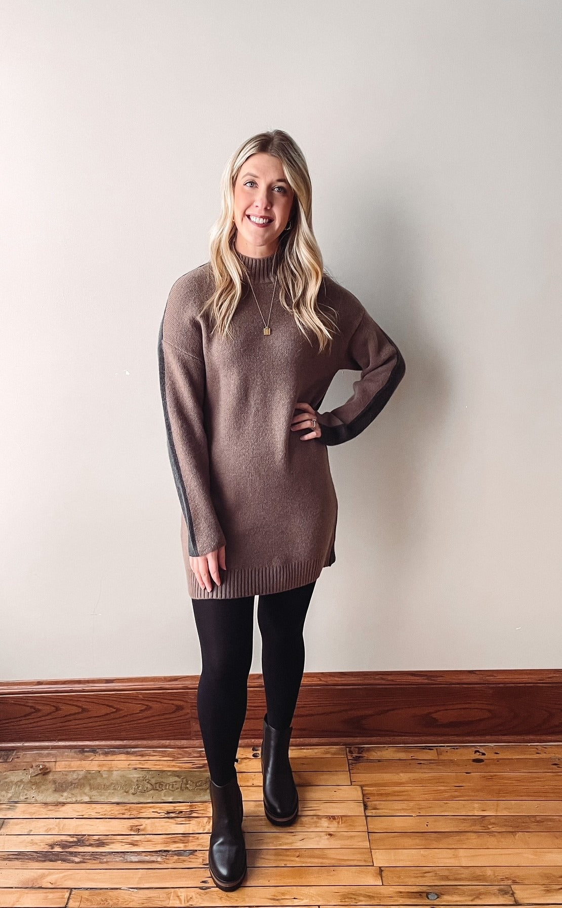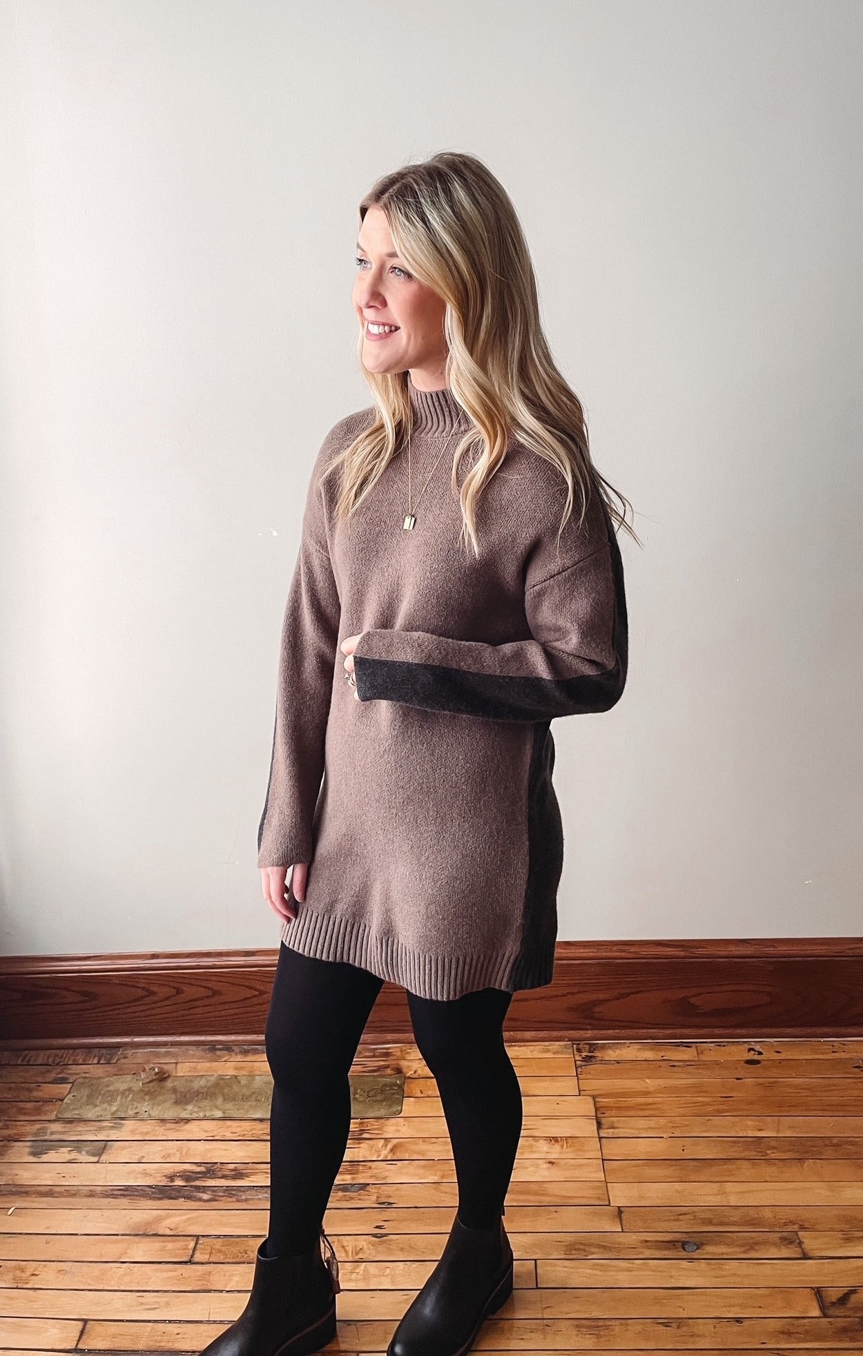 This sweater dress features a modern mock neckline, long sleeves, and a relaxed drop shoulder silhouette. With exposed seam detailing and color block accents on the front and back, this dress has a stylish edge. The ribbed trim adds texture and the mini length makes it a versatile option for any occasion.