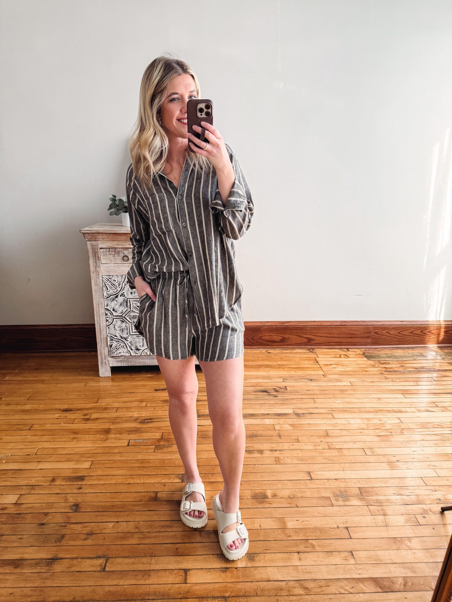 Rock these Dorothea Black Perfect Line Shorts and make a statement. Featuring a high-rise silhouette with a cheeky mini length, they're designed to turn heads while keeping you comfy. The adjustable drawcord waistband molds to your body, and functional side pockets mean your essentials always have a home. Crafted from soft, heavyweight fabric with a perfectly worn-in wash, these shorts deliver effortless style for any occasion. Style them with our matching Dorothea Black Perfect Line Top for the ultimate coordinated look.