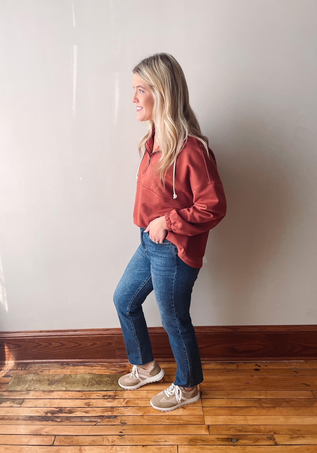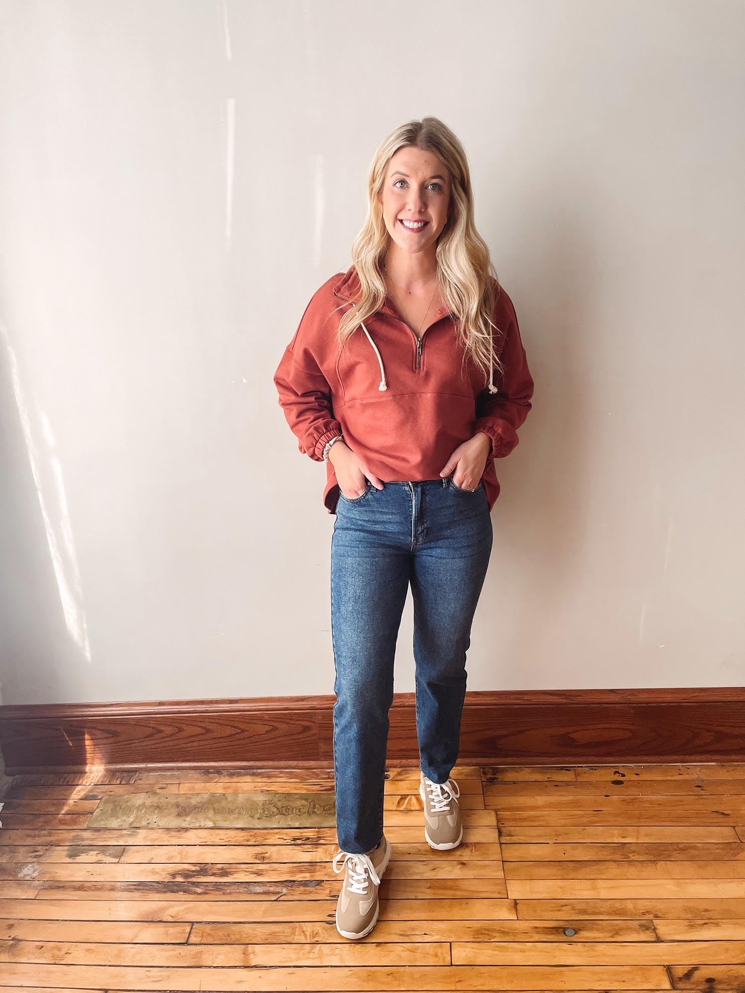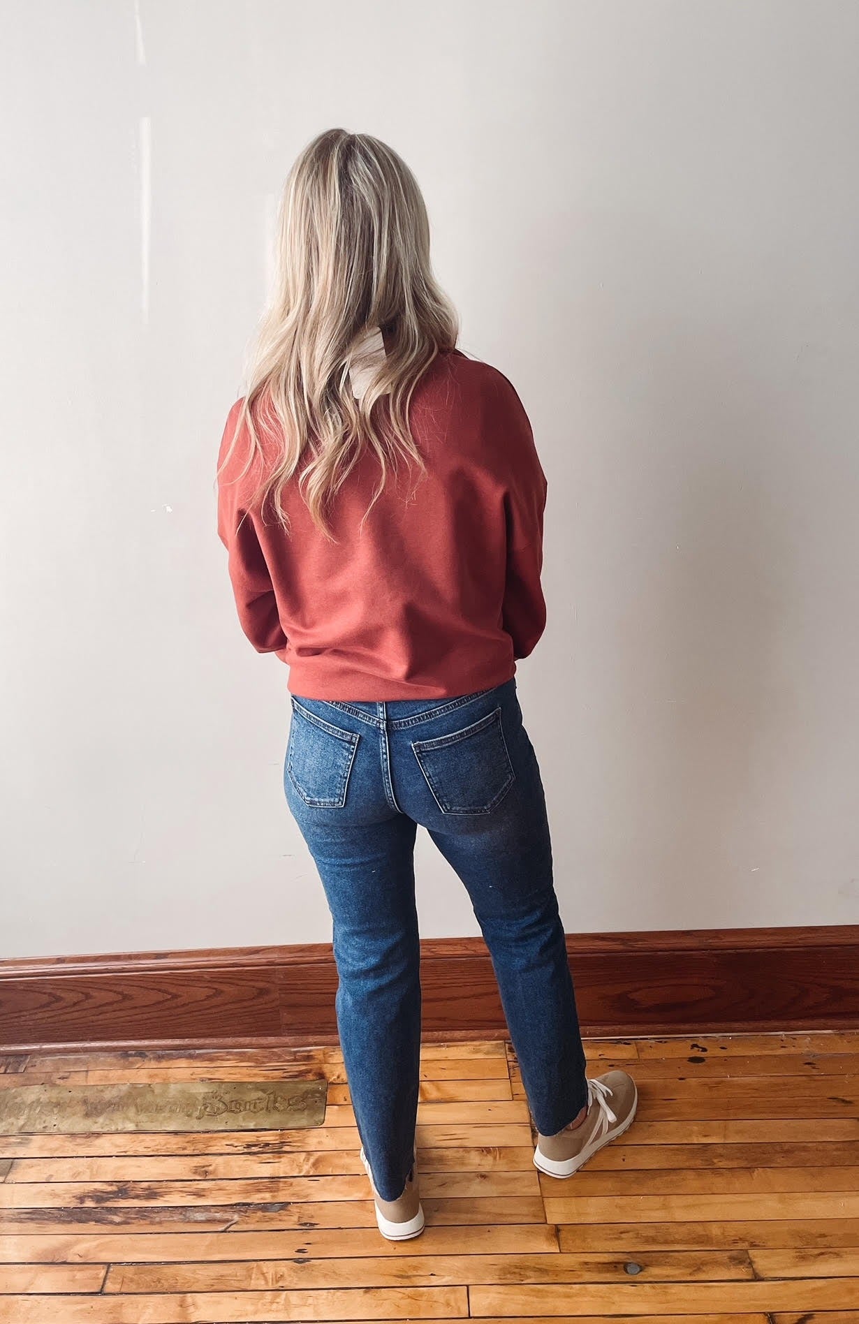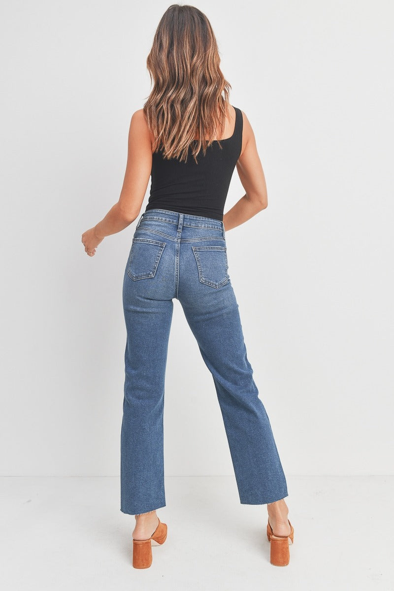 A high rise, washed black jean that’s essential for your wardrobe’s transition to fall. This straight leg classic has a raw hem with detailed distressing to add extra interest.