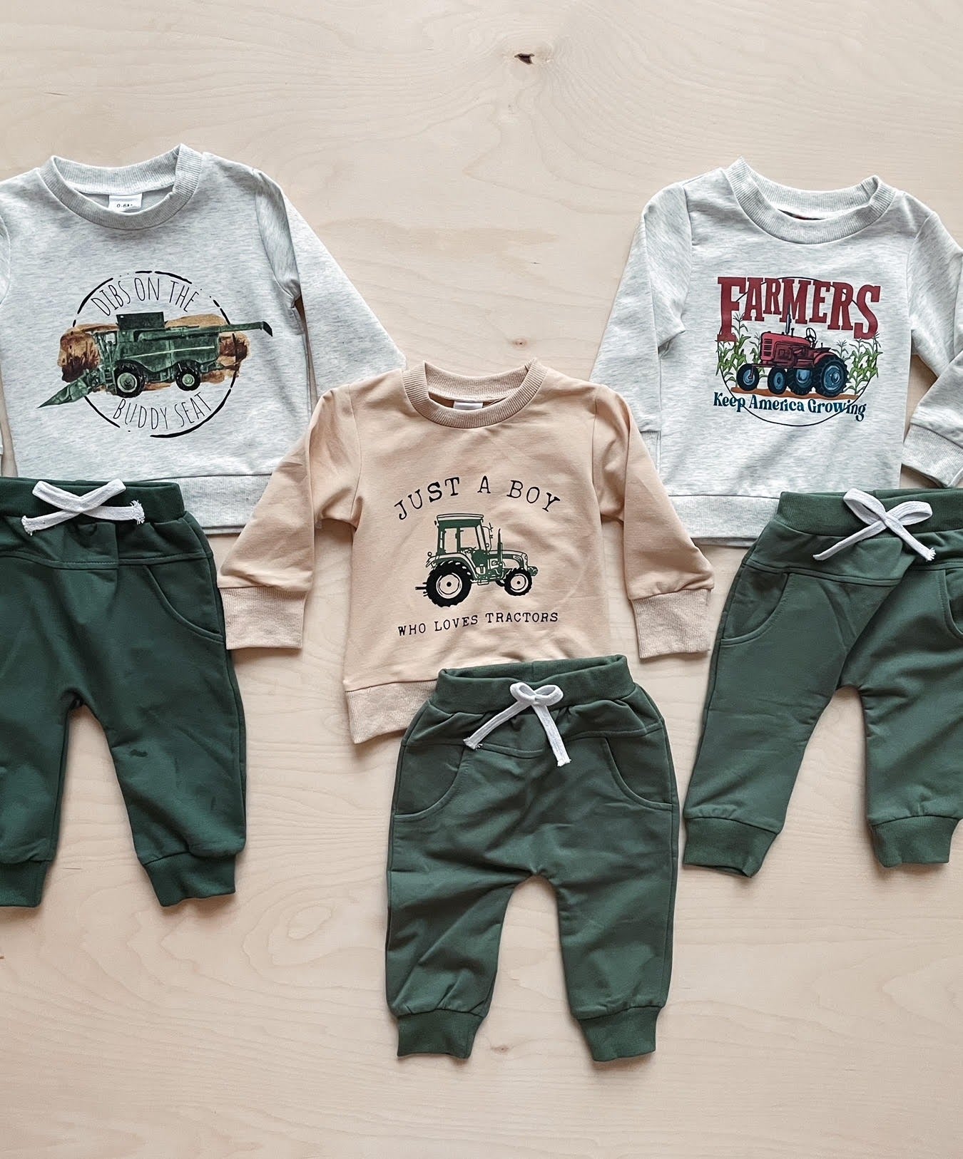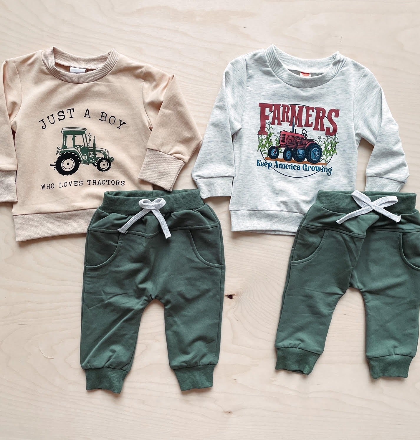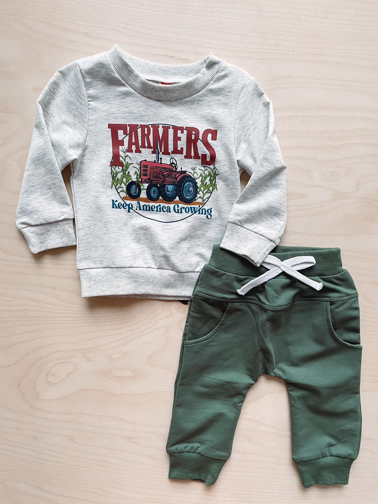 Green joggers and a heather gray sweatshirt that says "Farmers Keep America Growing" in red and blue letters with a picture of a red tractor and corn stalks.