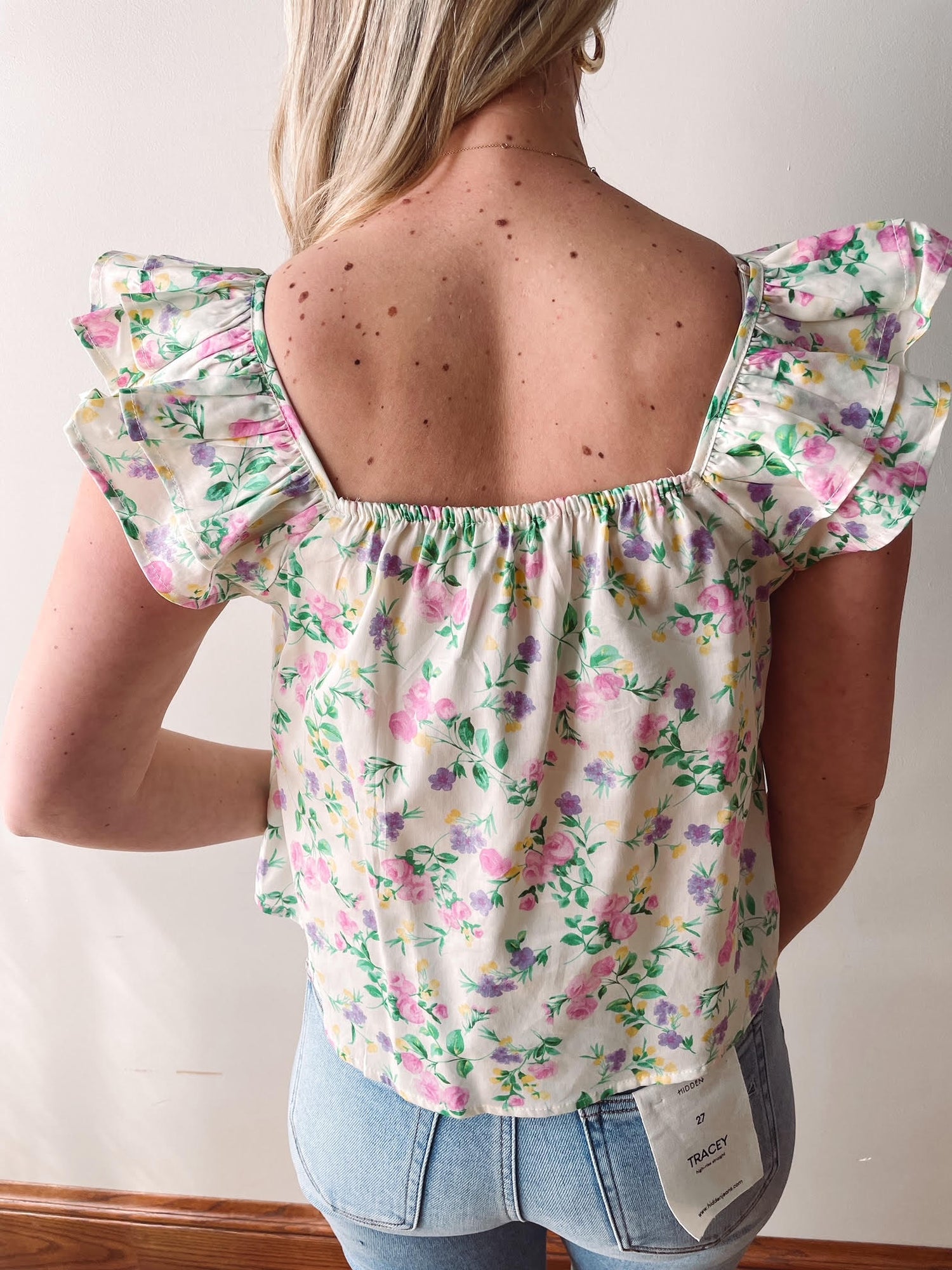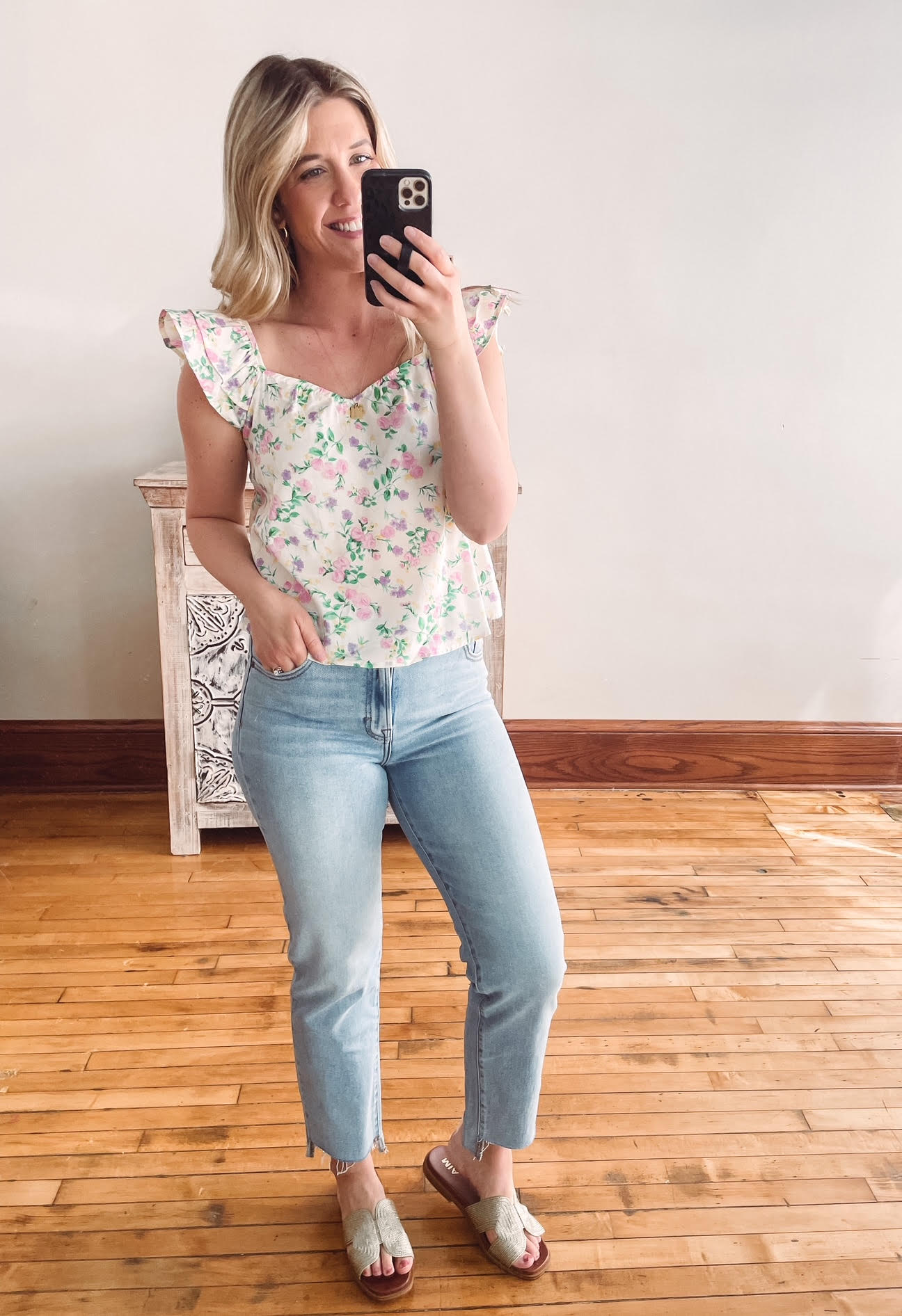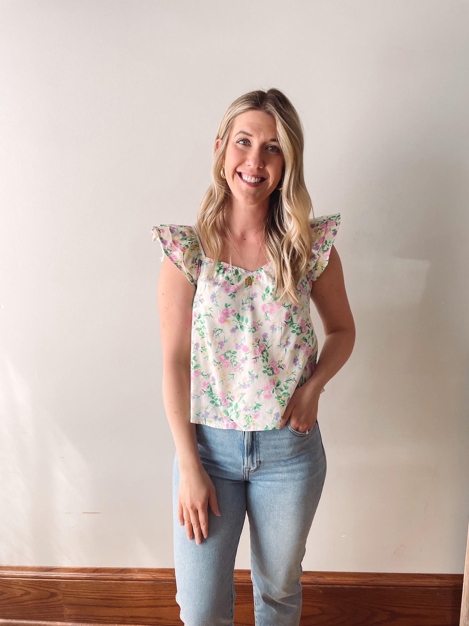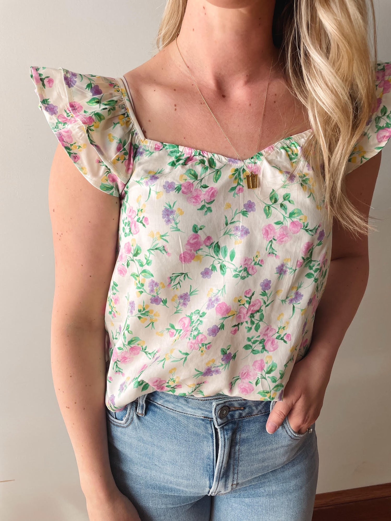 SWEETHEART NECKLINE FLUTTER SLEEVE FLORAL TANK
