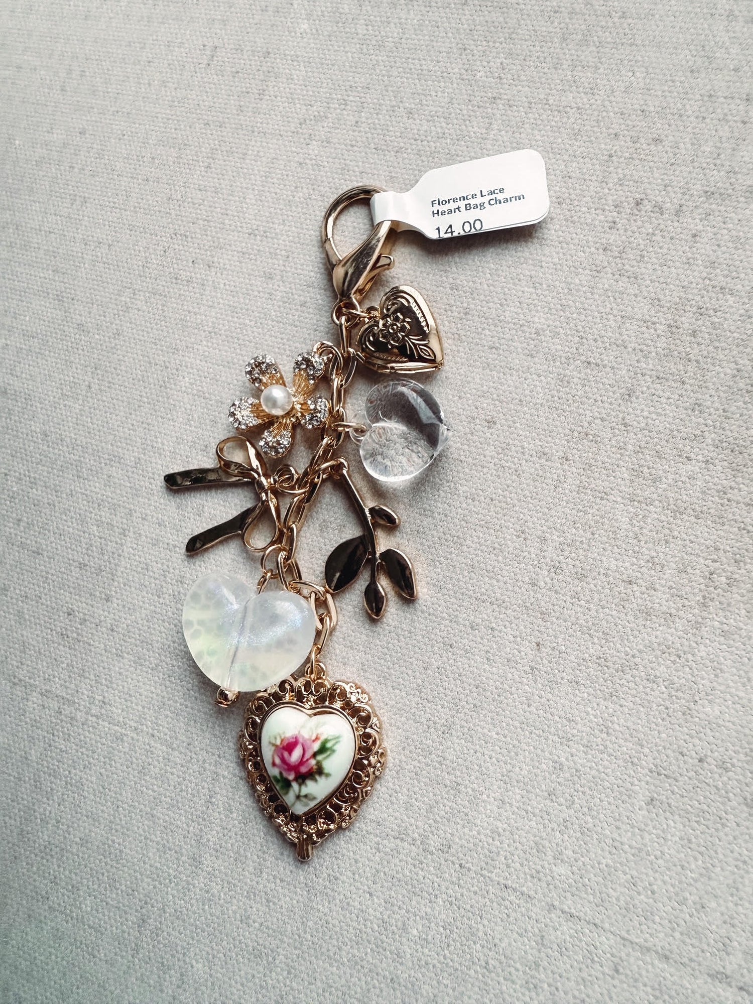 Delicate and timeless, the Florence Lace Heart Bag Charm features a beautifully crafted porcelain heart with a laced clear heart detail, finished with a dainty bow and pearl-accented floral charm. This elegant piece adds a vintage-inspired romantic touch to handbags, totes, or backpacks and makes a thoughtful gift for special occasions.