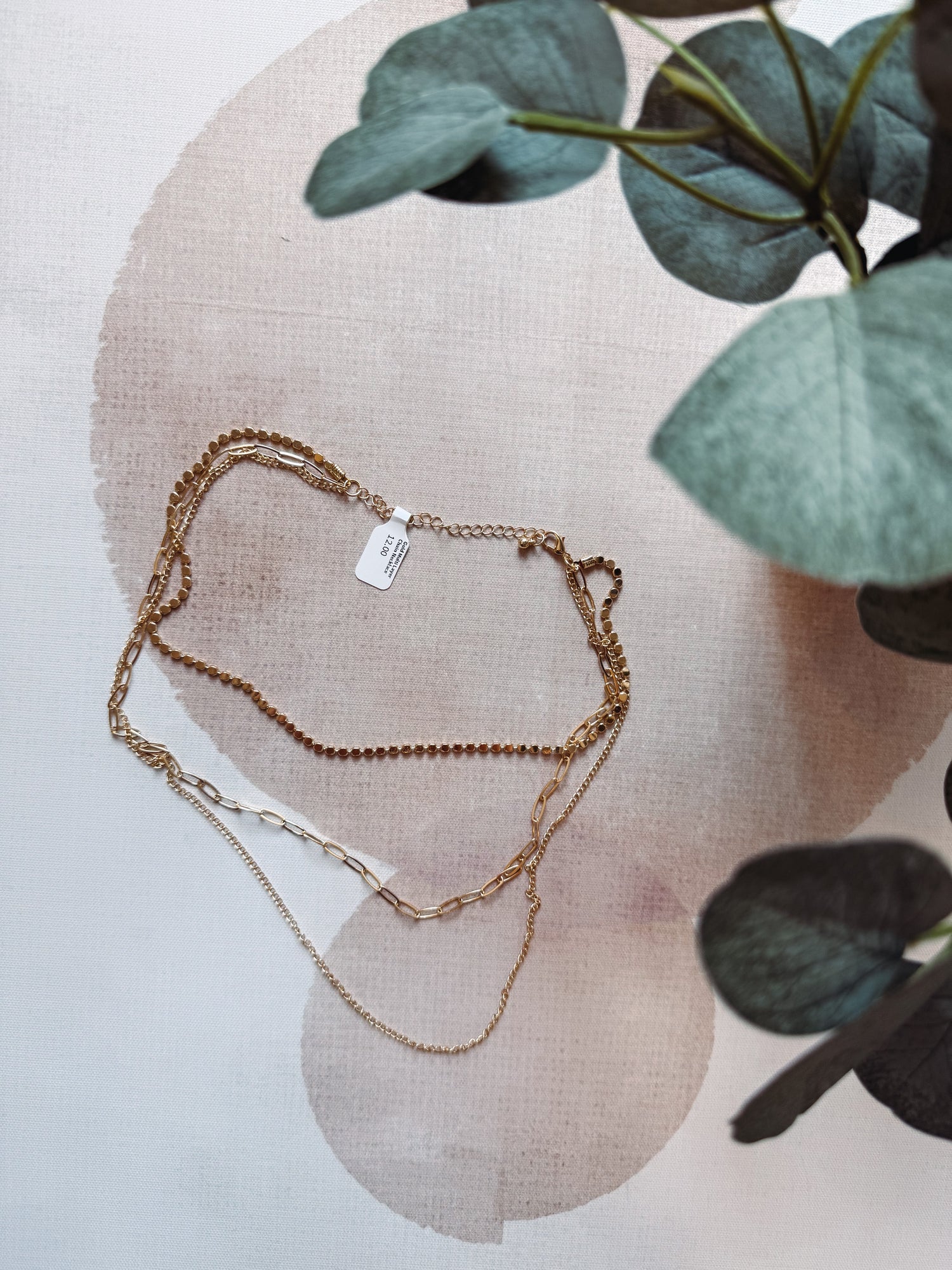 Here is a sophisticated Pretty and practical multi chain necklace that has a unique round chain and link chain.