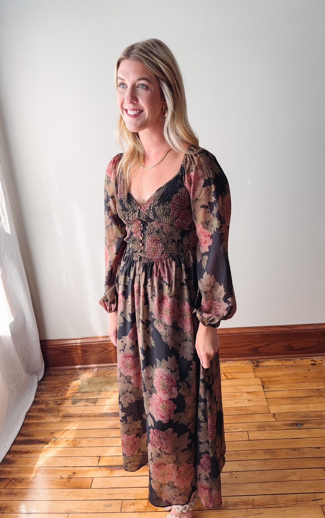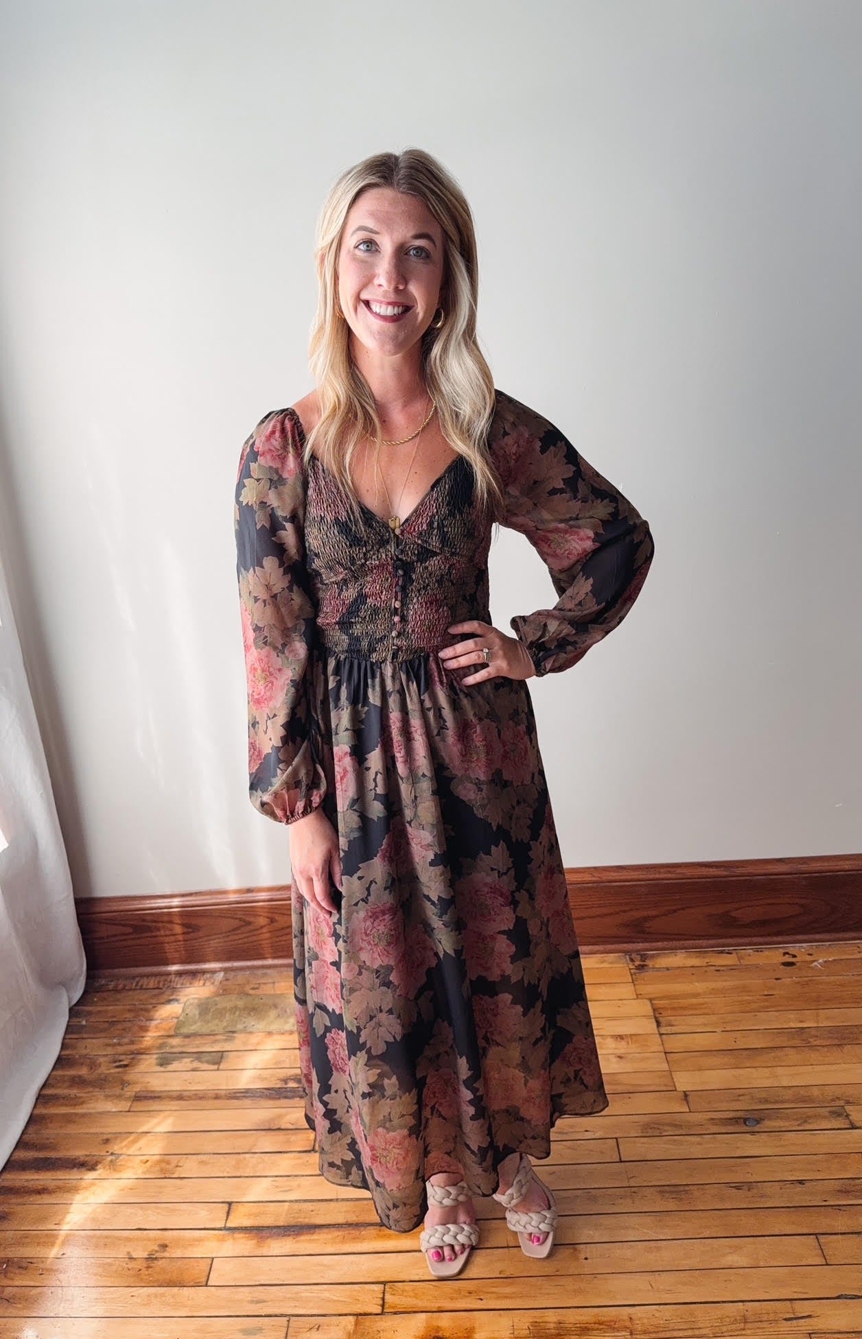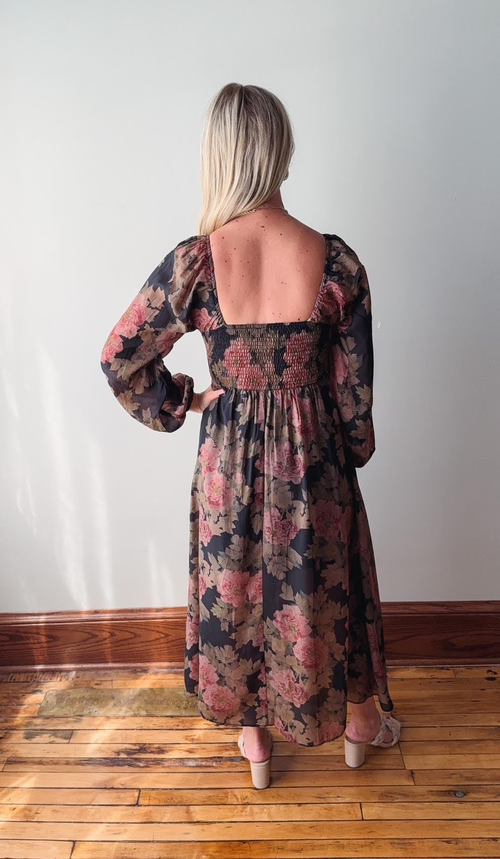 This midi dress blooms with a playful floral print and features a wrinkle-textured fabric for added charm. It boasts a sweetheart neckline, a smocked bodice, and a front button-loop closure with fabric buttons. The long puff sleeves end in elastic cuffs, while the low back adds a flirty touch. Partially lined and falling to calf length, its fit-and-flare shape creates a fun, flattering silhouette.