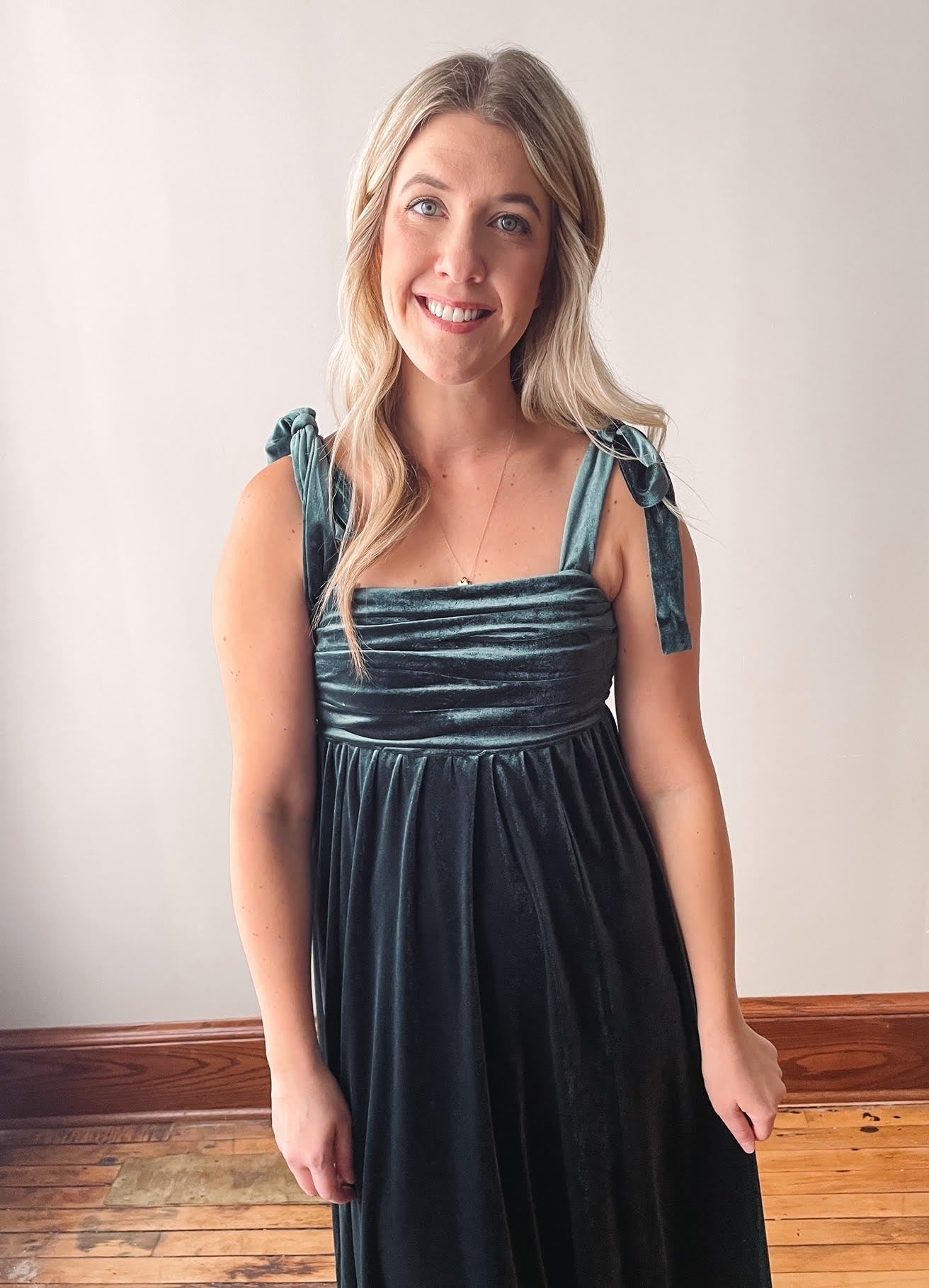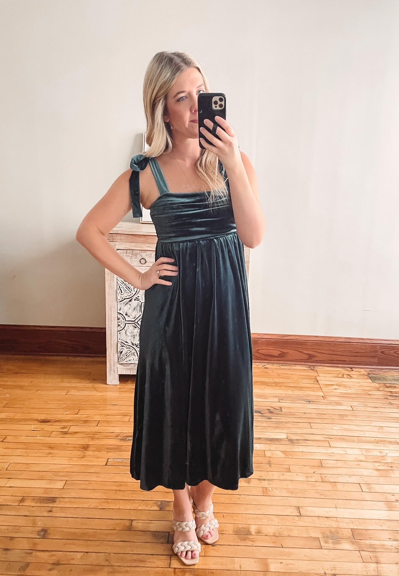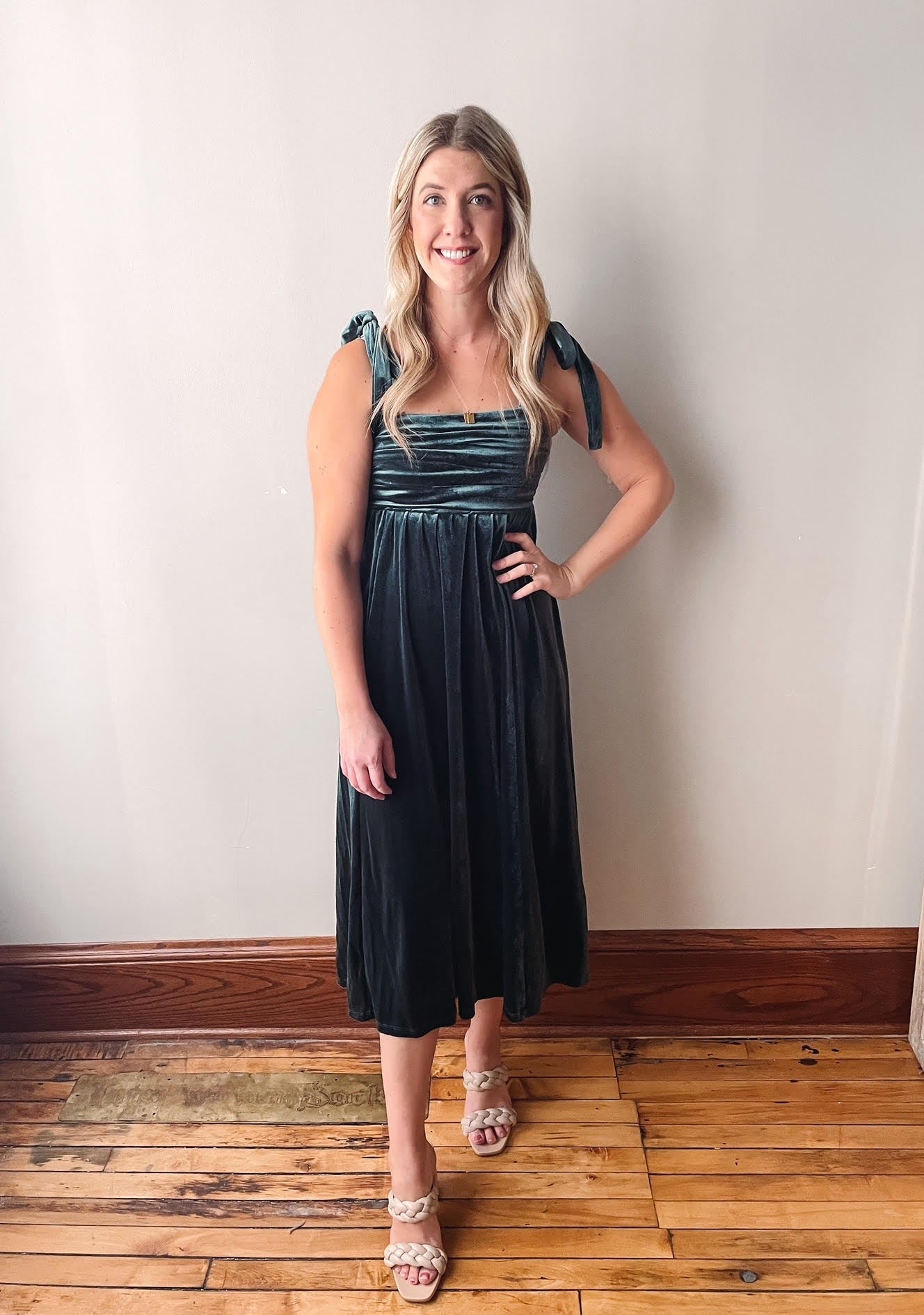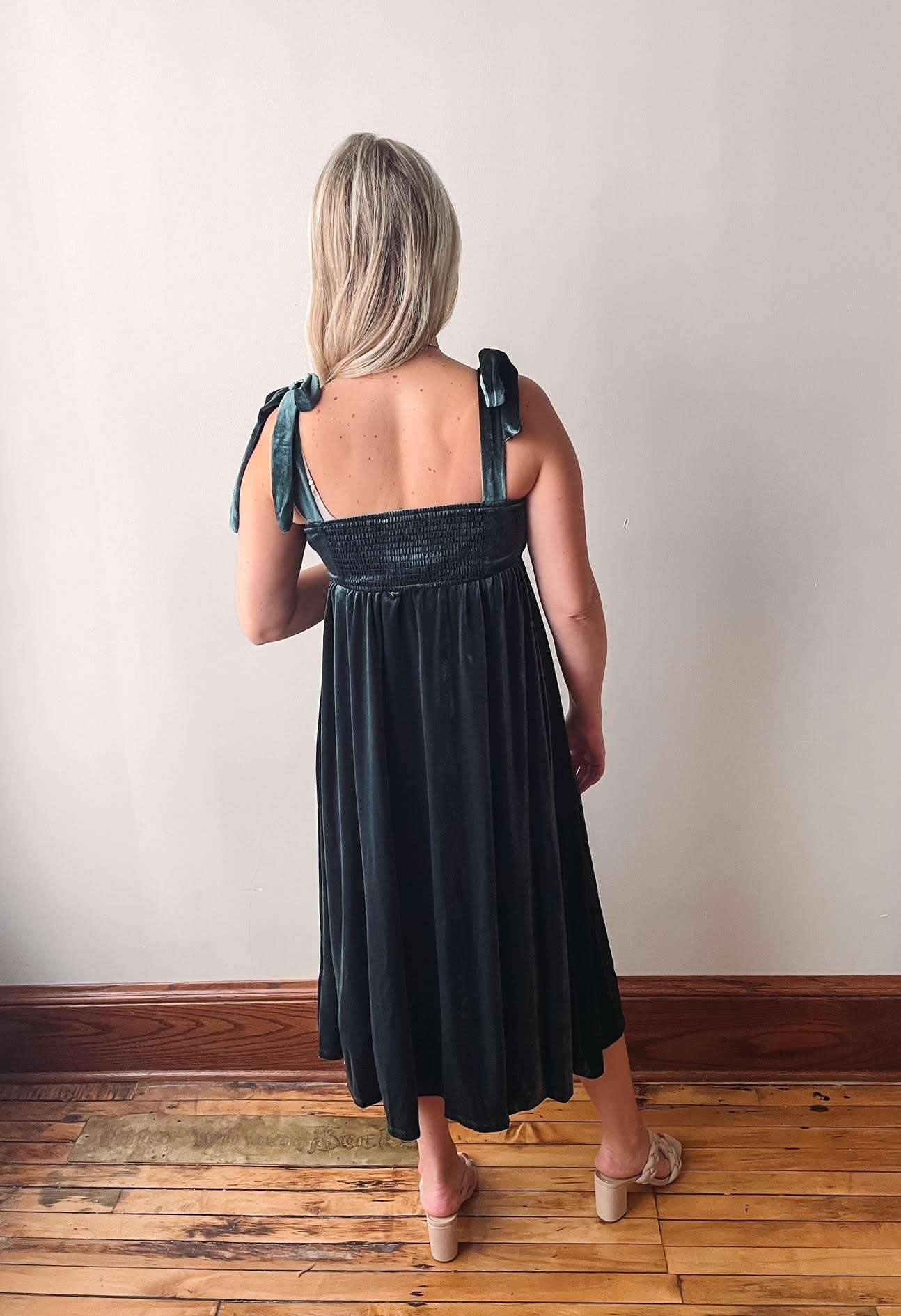 Gorgeous green velvet midi dress with shirring at the top with functional tie straps.