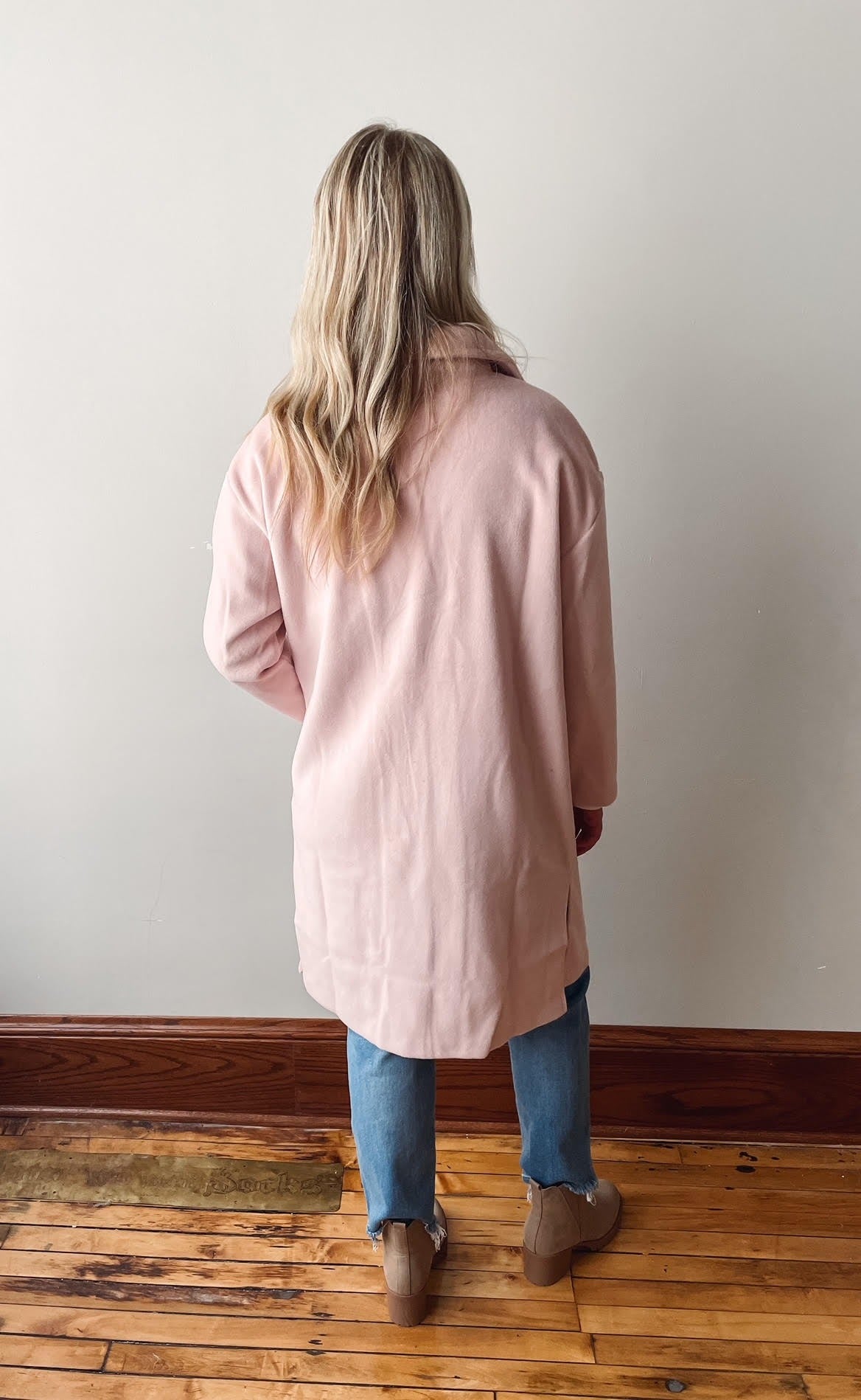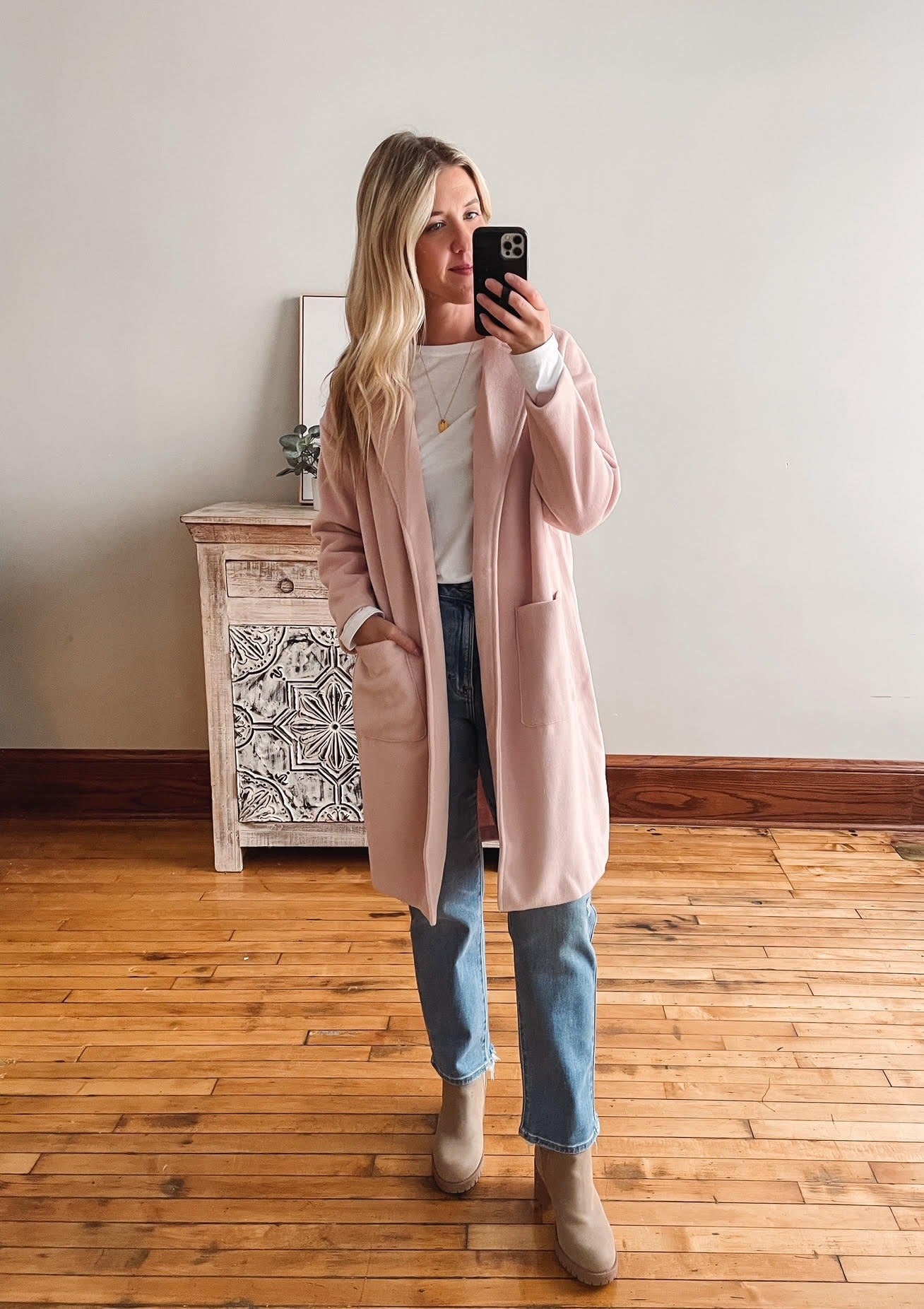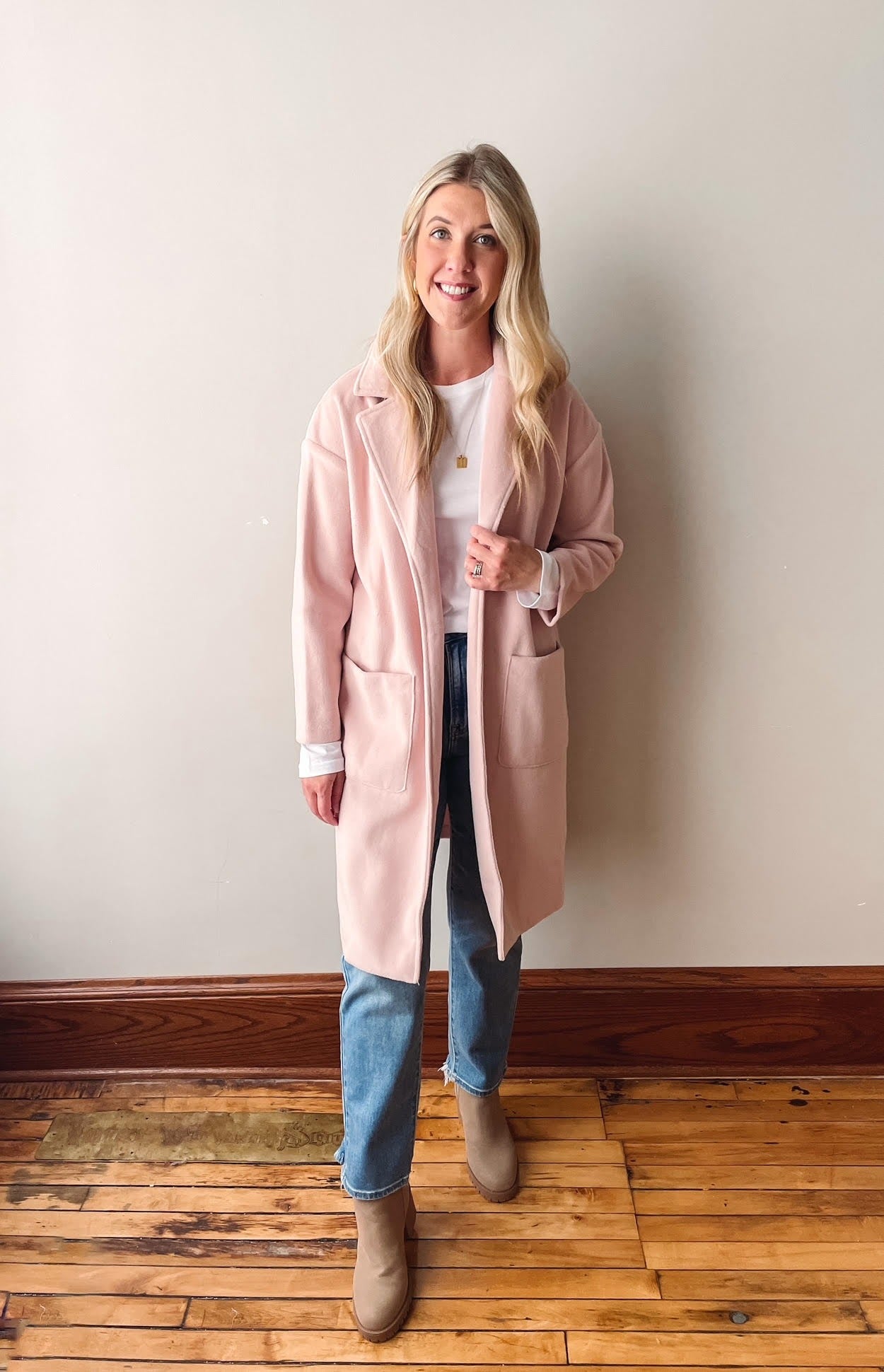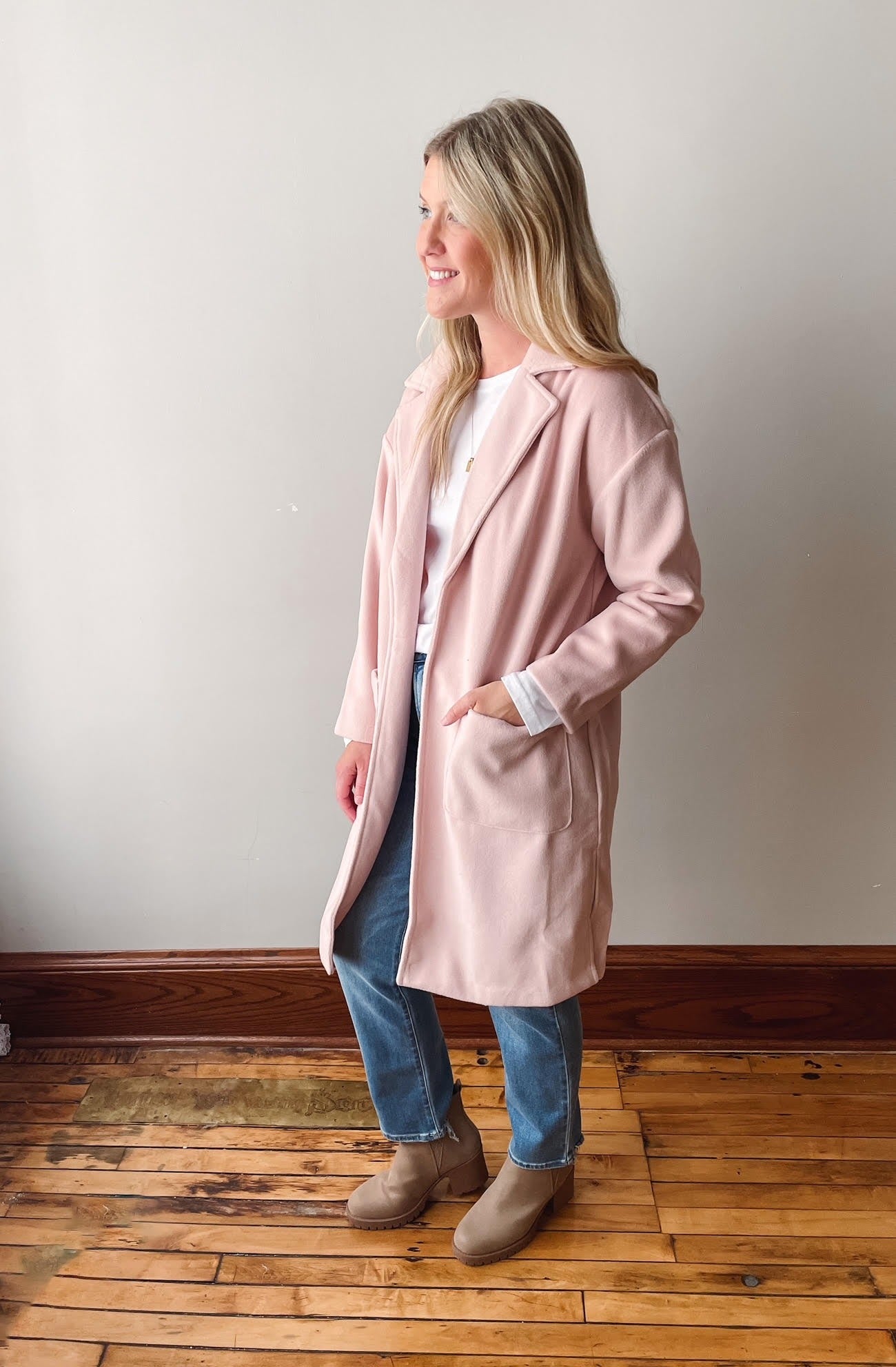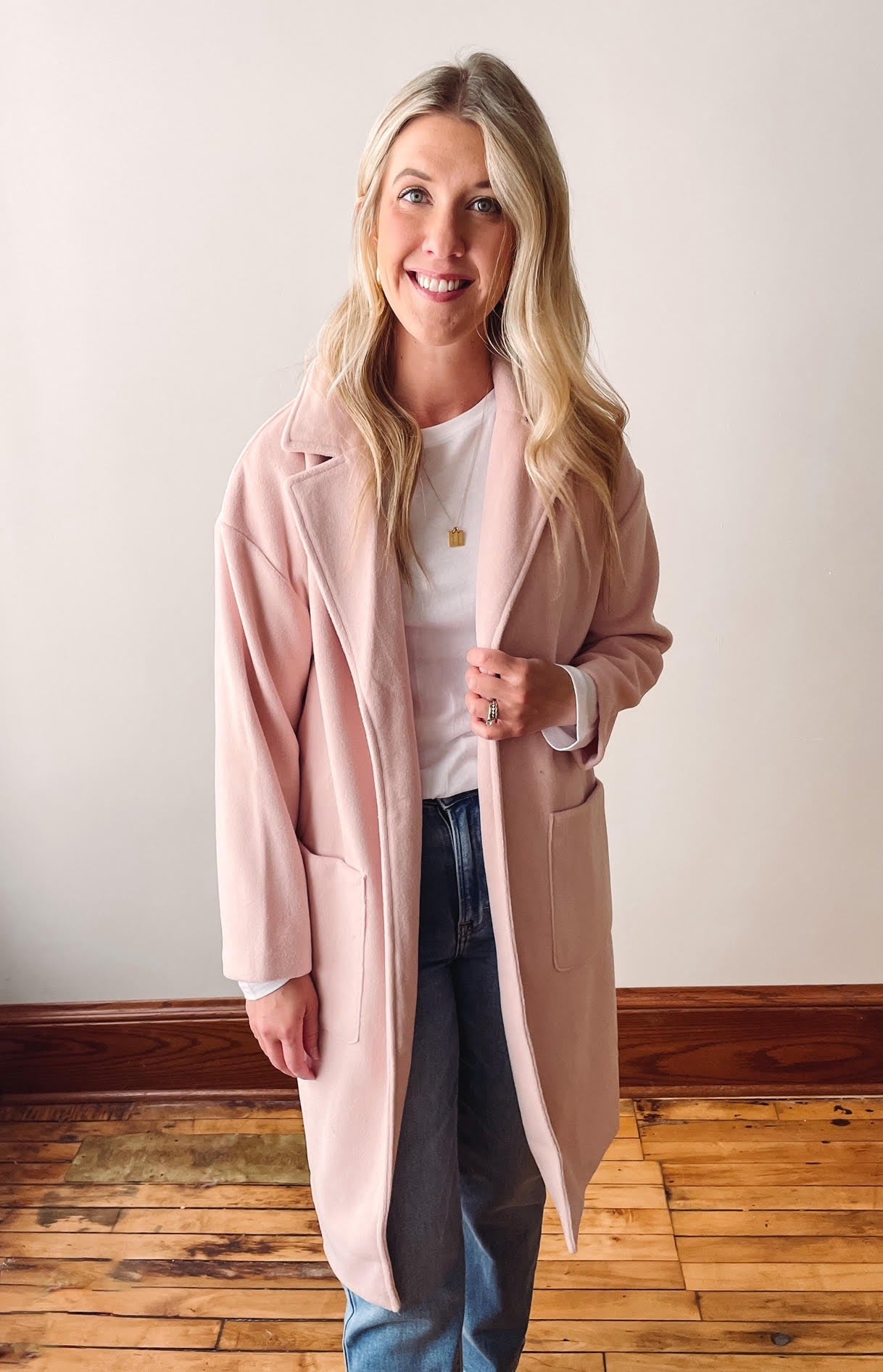 Stay stylish and warm with the Hayley Coat! This beautiful 3/4 length dress coat in light pink features an open front, front pockets, and a notched collar, making it the perfect statement piece for any outfit. Say goodbye to boring winter wear and hello to a fashion-forward look!