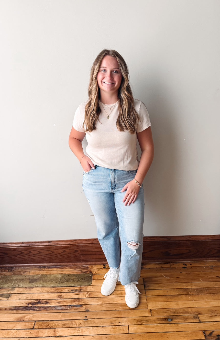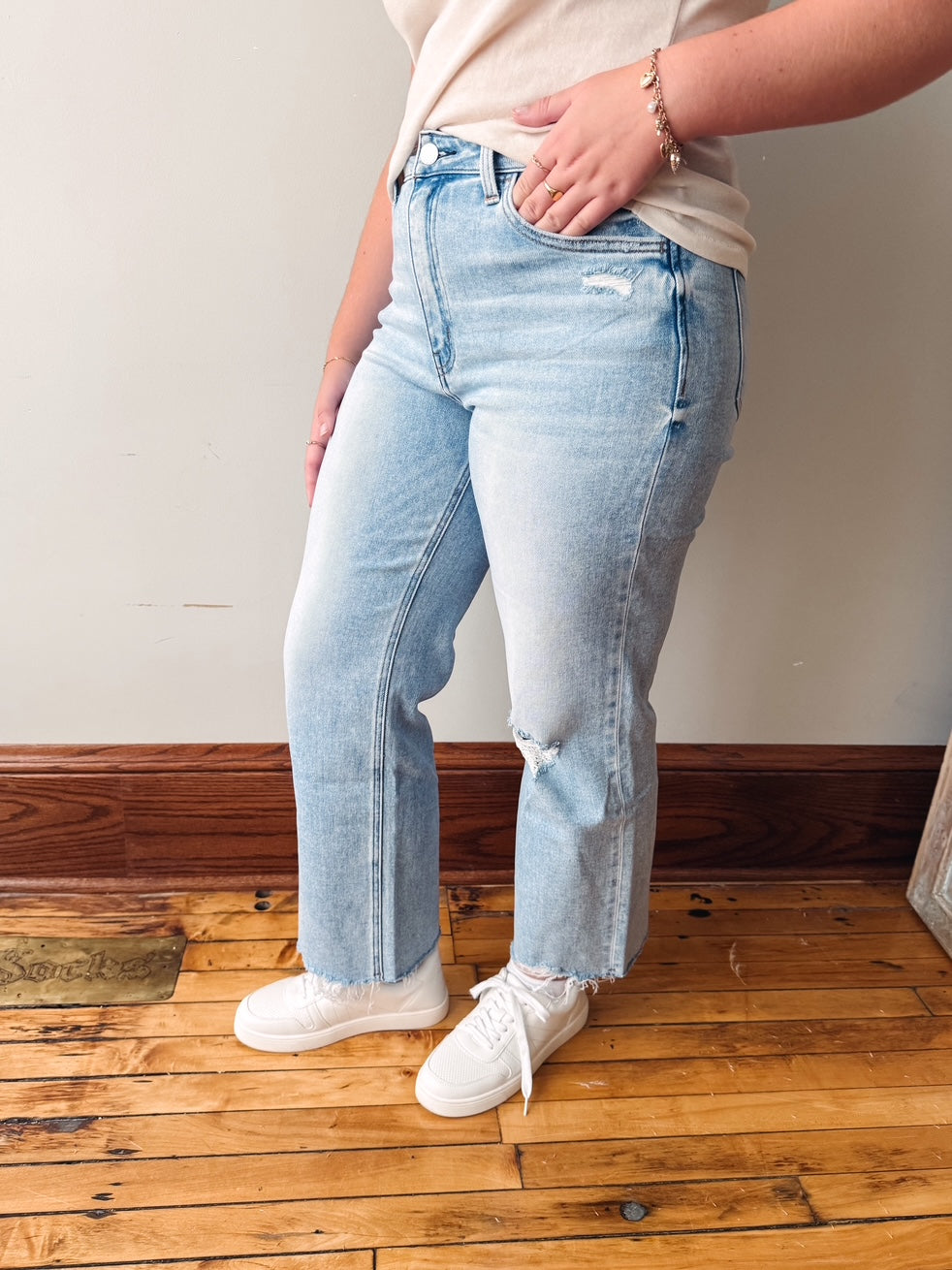 Comfort stretch denim, high rise waist, distressed detail, raw hem, cropped length, slim wide jeans