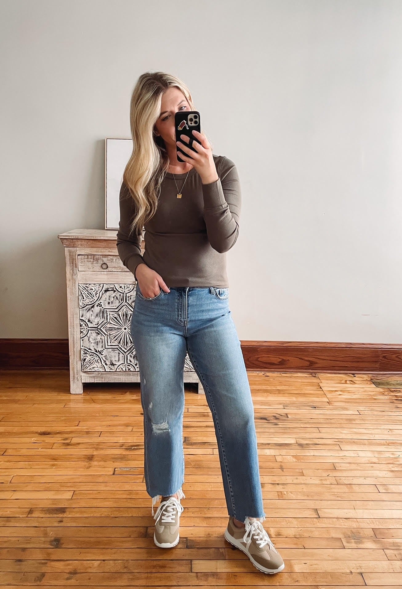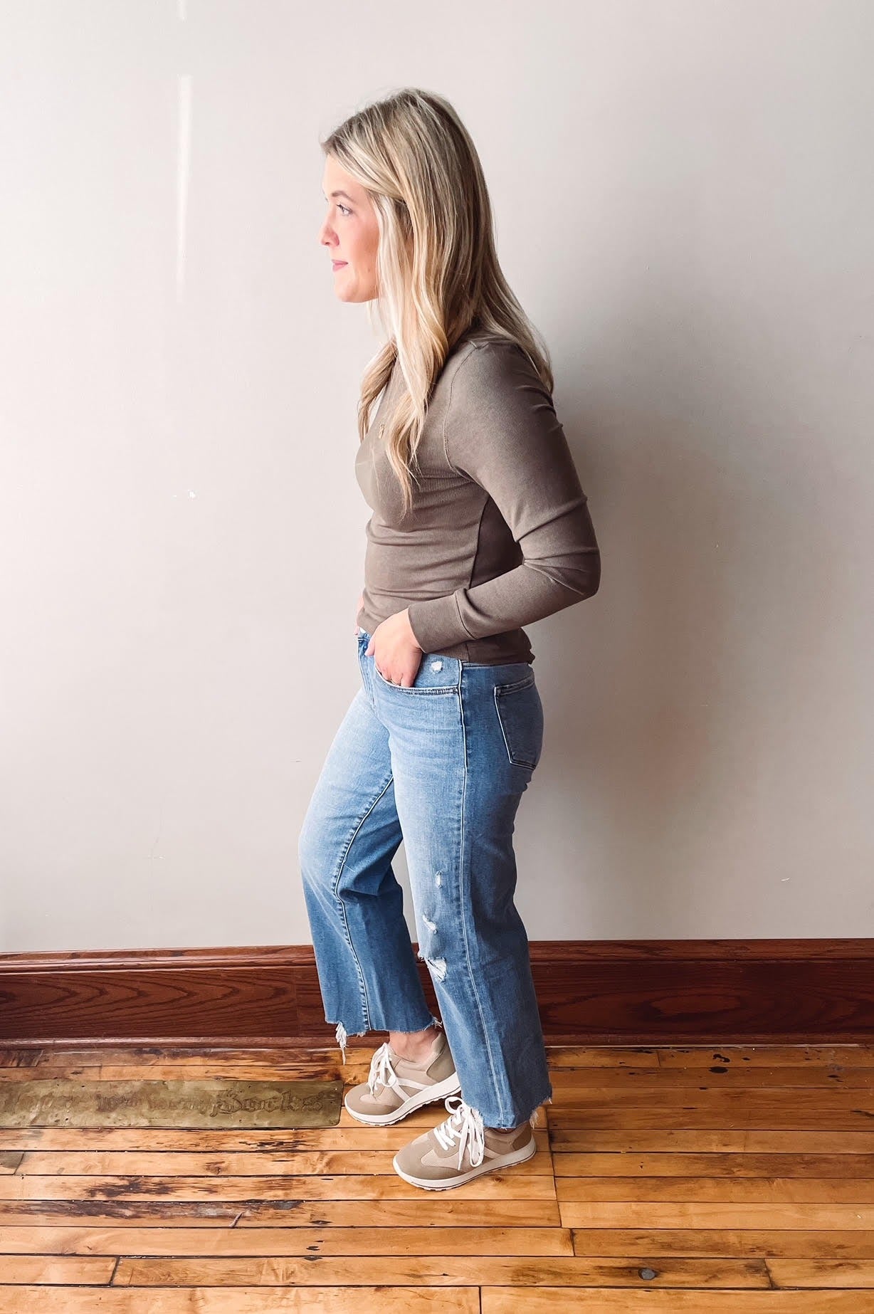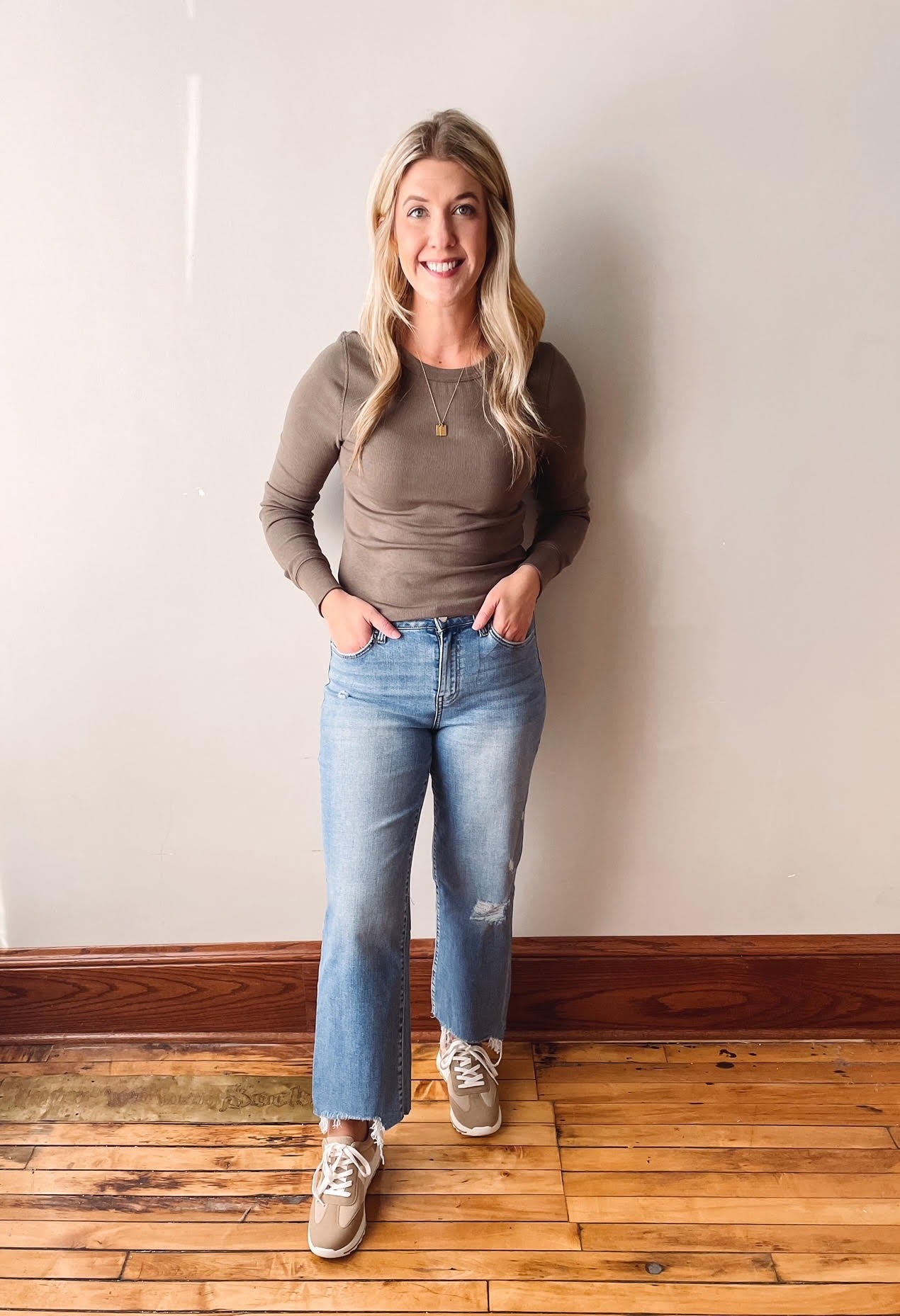 COMFORT STRETCH DENIM, HIGH RISE WAIST, DISTRESSED DETAIL, RAW HEM, ANKLE LENGTH, SLIM WIDE JEANS