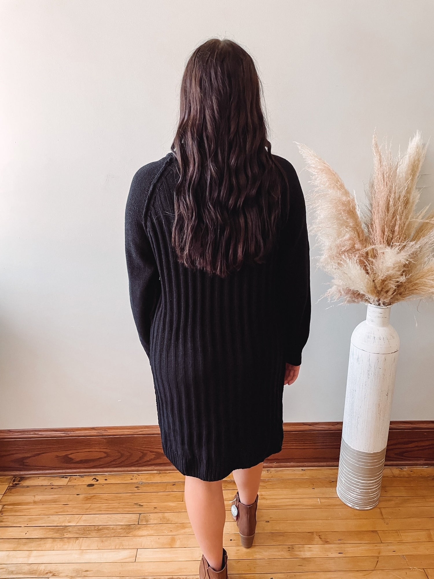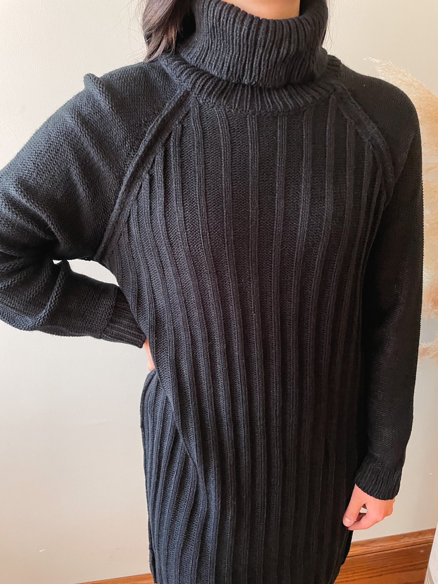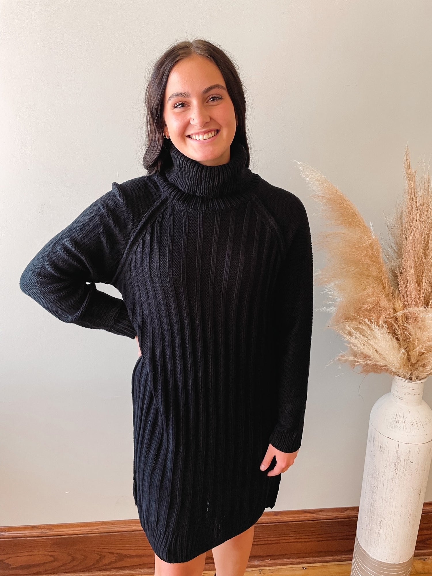 Stay warm while looking chic in this ribbed turtleneck dress spun! Designed in a slightly loose silhouette, it has a cozy turtleneck and raglan long sleeves. Keep the rest of the styling simple yet modern with a leather handbag and boots.