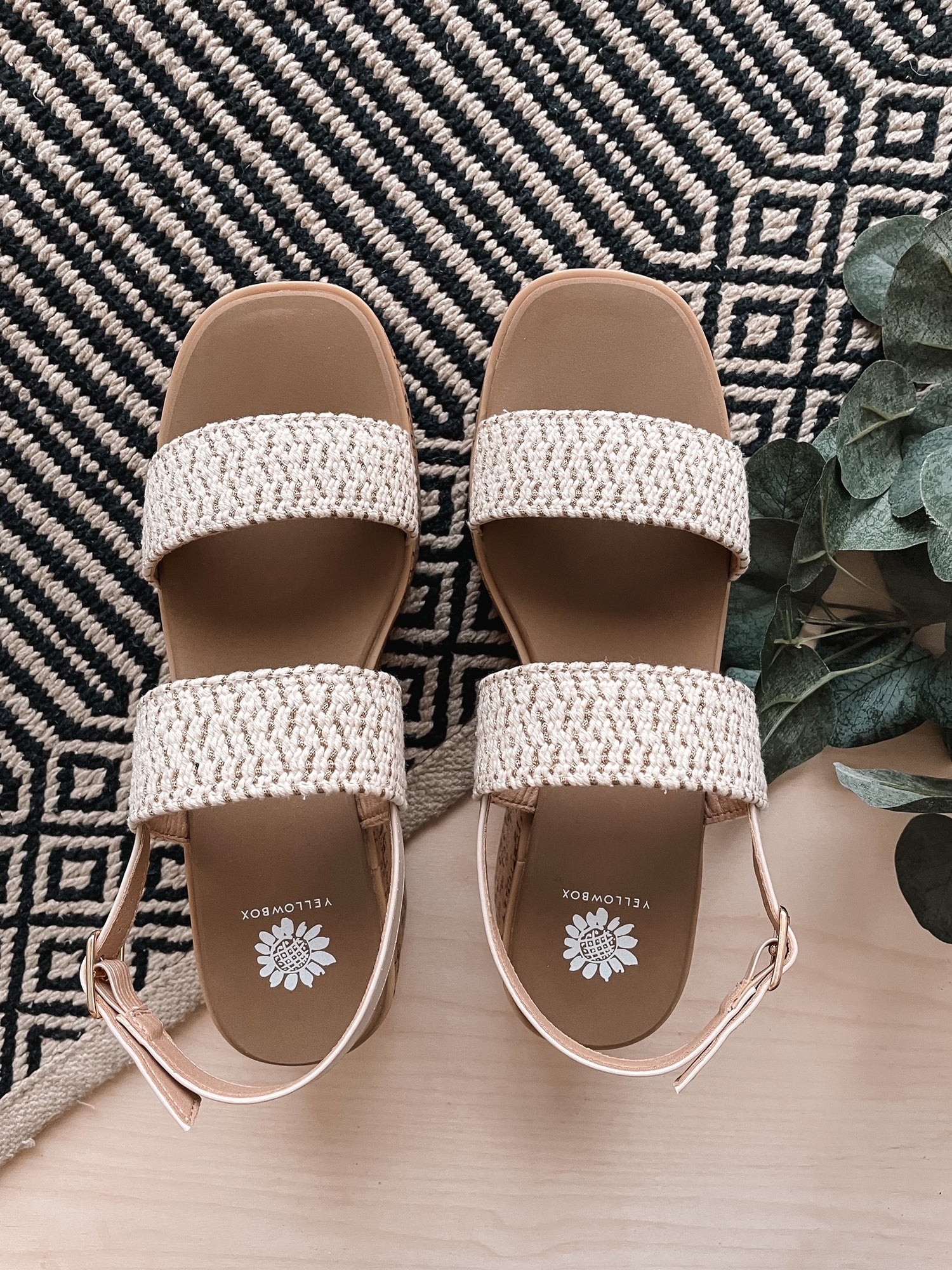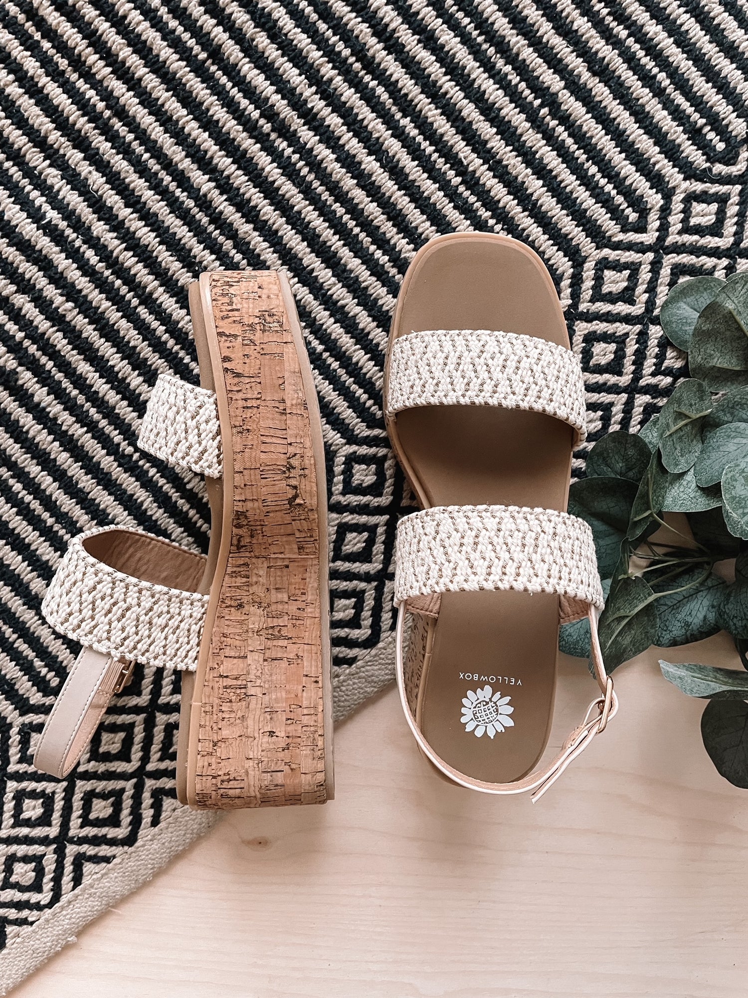 JEJU is a 2-band 90s-inspired square-toe platform wedge. JEJU features high-quality woven straps with a contrasting slender ankle strap with an adjustable buckle. This bottom features a Signature Yellow Box EVA foam footbed, a cork wedge, and a sturdy rubber sole for lasting durability.