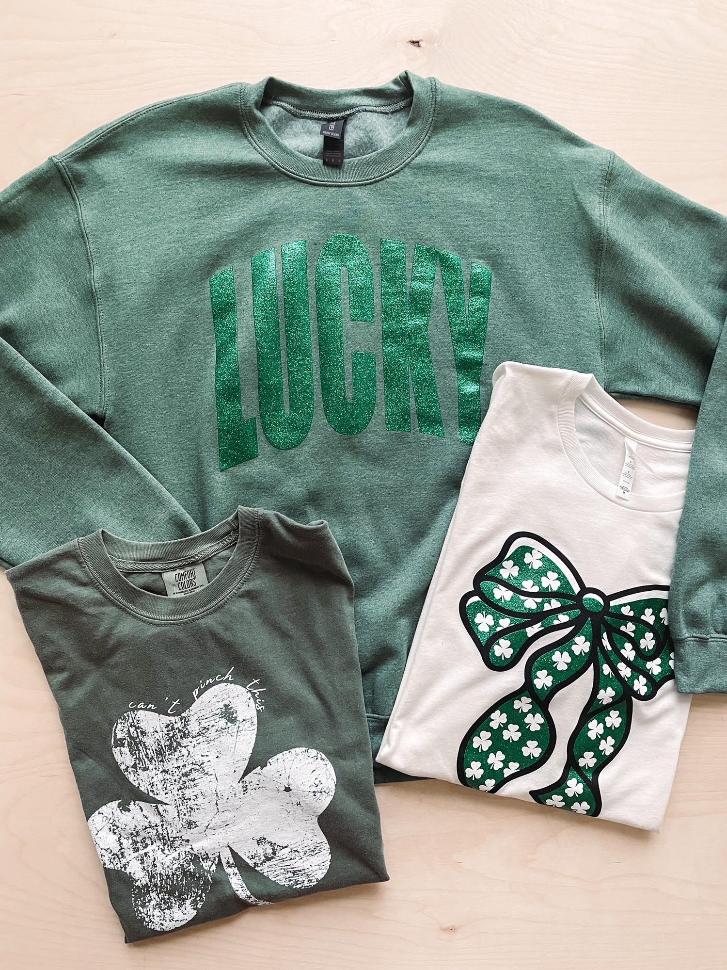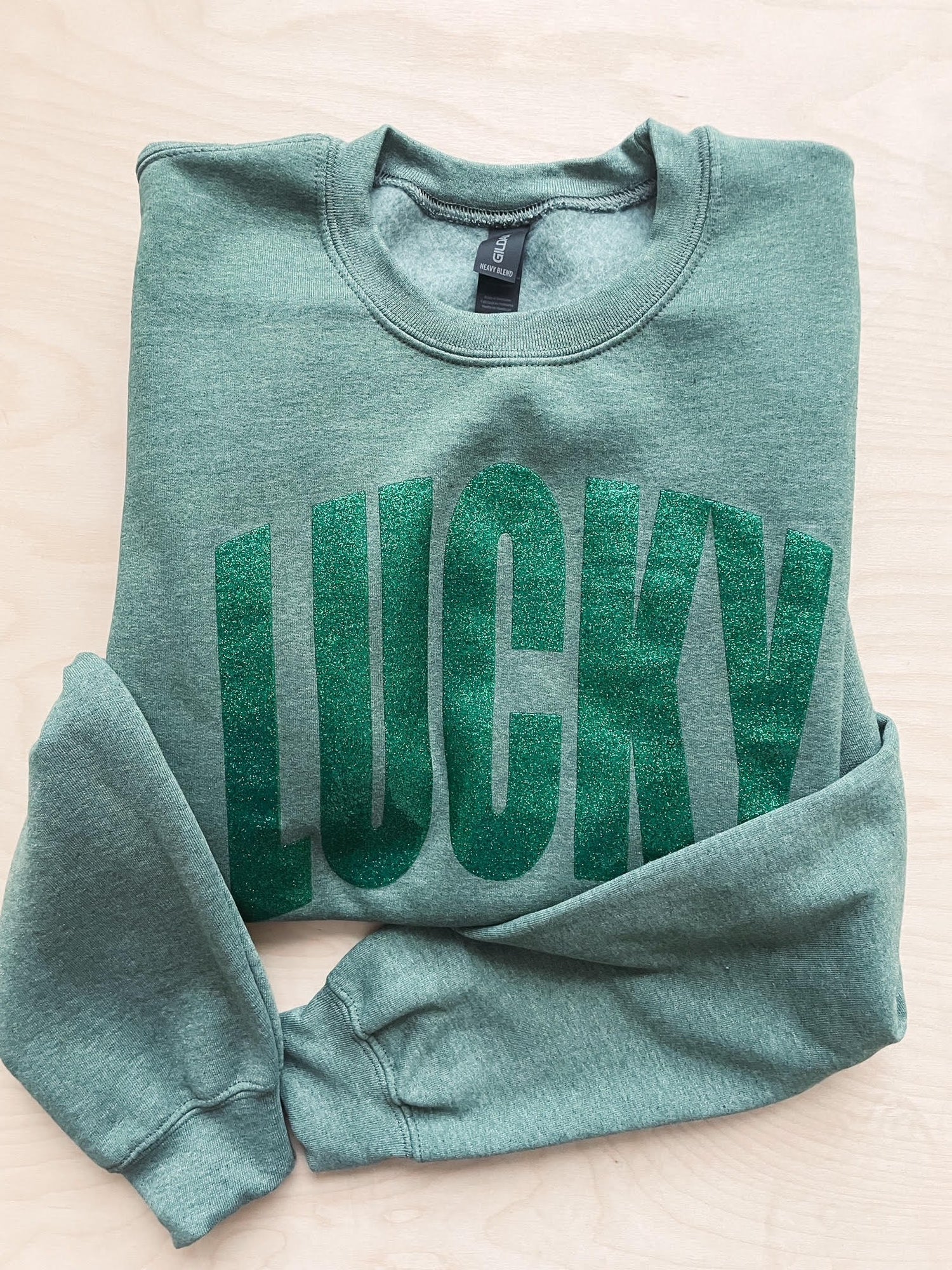 Get lucky this St. Patrick's Day with our LUCKY Glitter Sweatshirt! This vibrant green Gildan sweatshirt features a playful and eye-catching LUCKY print in shimmery green glitter. Perfect for adding a touch of fun and sparkle to your holiday wardrobe. Don't miss out on your lucky charm!