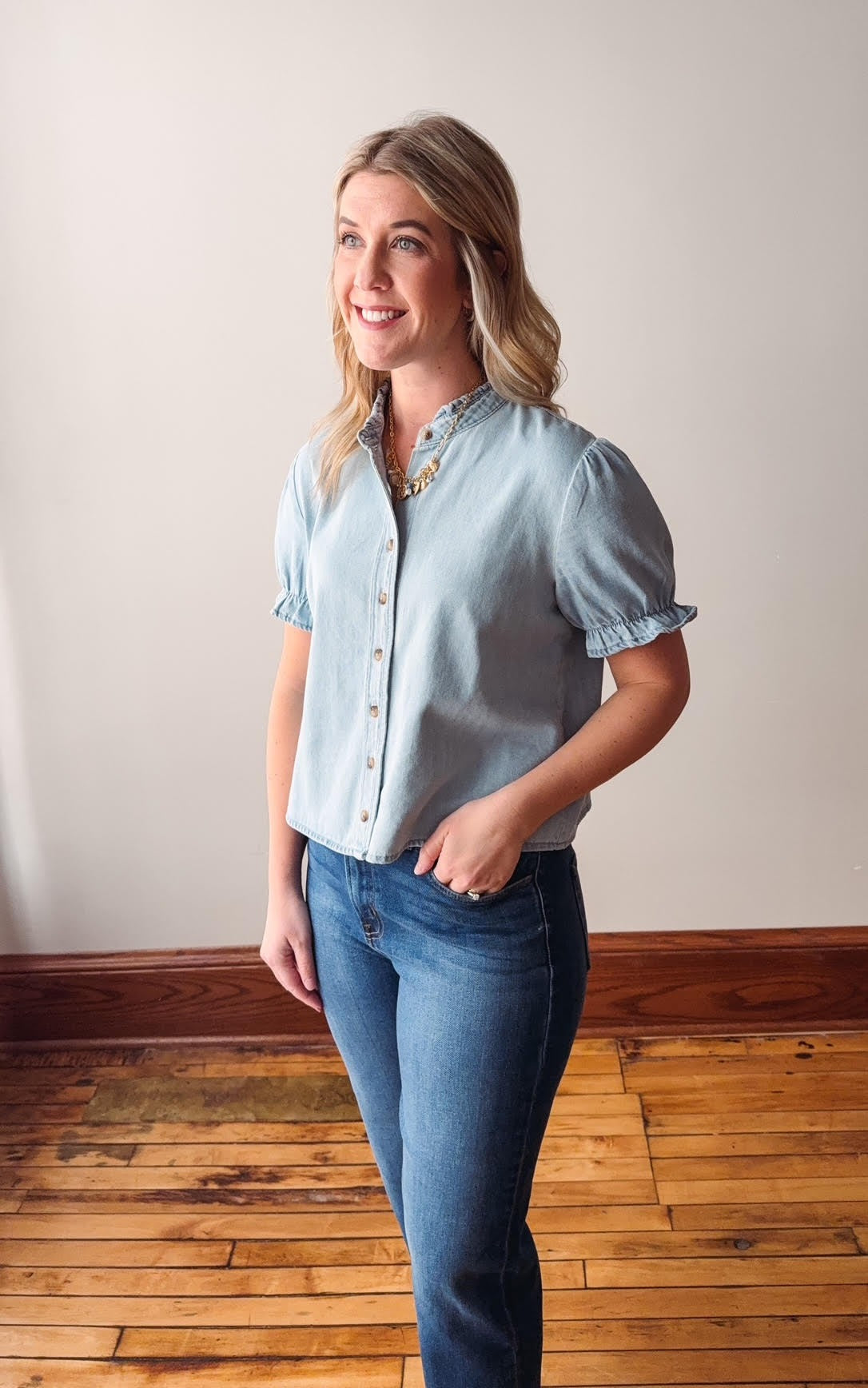 Introducing the Mabel Denim Shirt—your new go-to for effortless style! This light denim beauty features charming puff sleeves that add a playful twist to a timeless classic. Complete with functional buttons for easy layering and all-day comfort, it's the perfect piece to dress up or down. Whether you're heading to brunch or running errands, the Mabel brings that perfect blend of casual cool and put-together polish to any outfit.