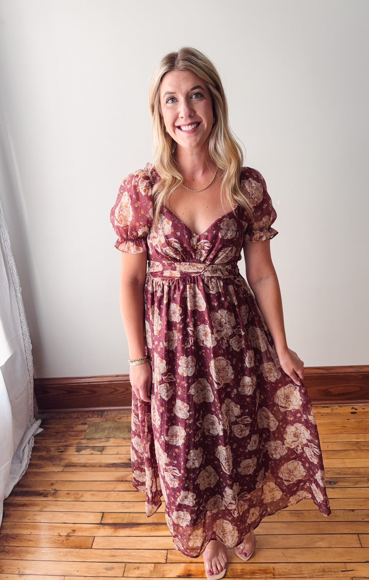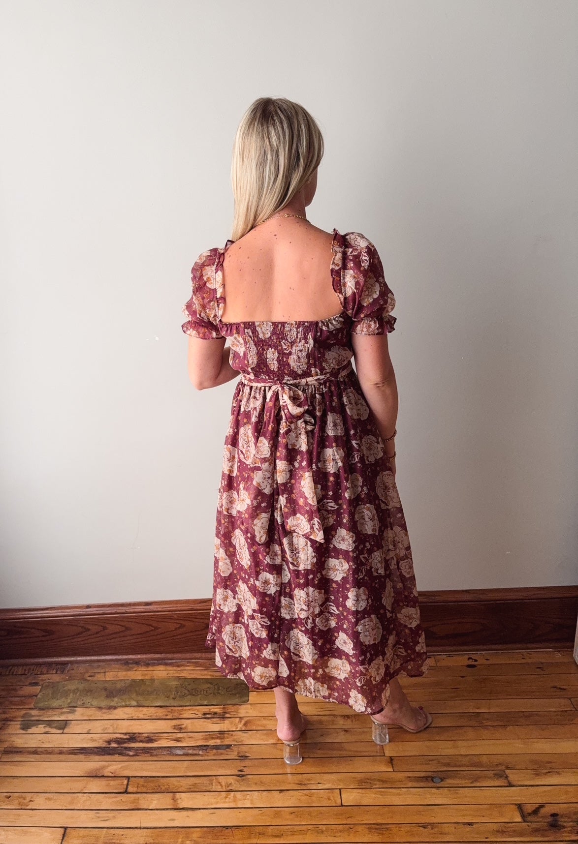 SWEETHEART NECKLINE SHORT PUFF SLEEVES BACK WAIST TIE SMOCKED BACK A-LINE FLORAL PATTERN LINED MIDI DRESS
