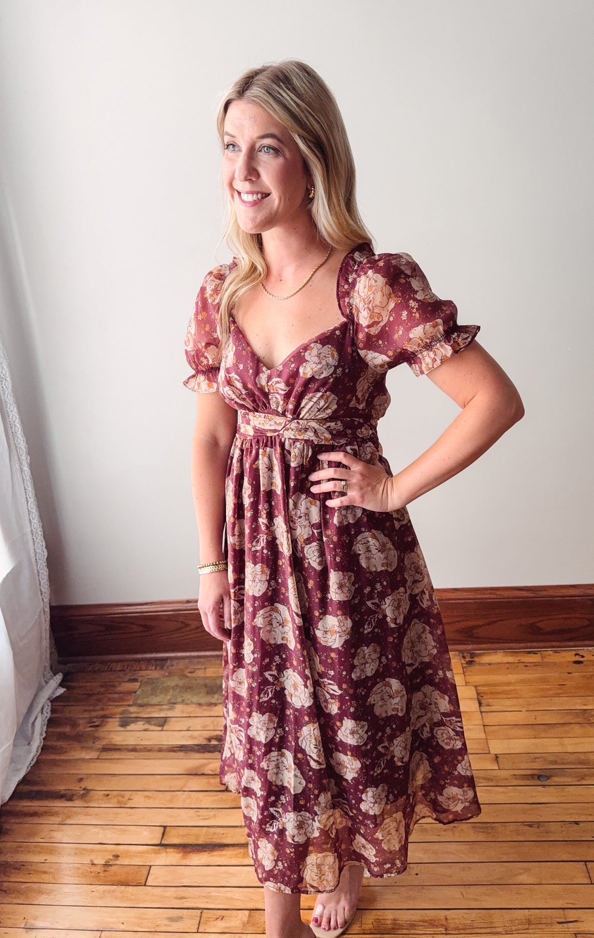 FLORAL SWEETHEART NECK BACK TIE MIDI DRESS