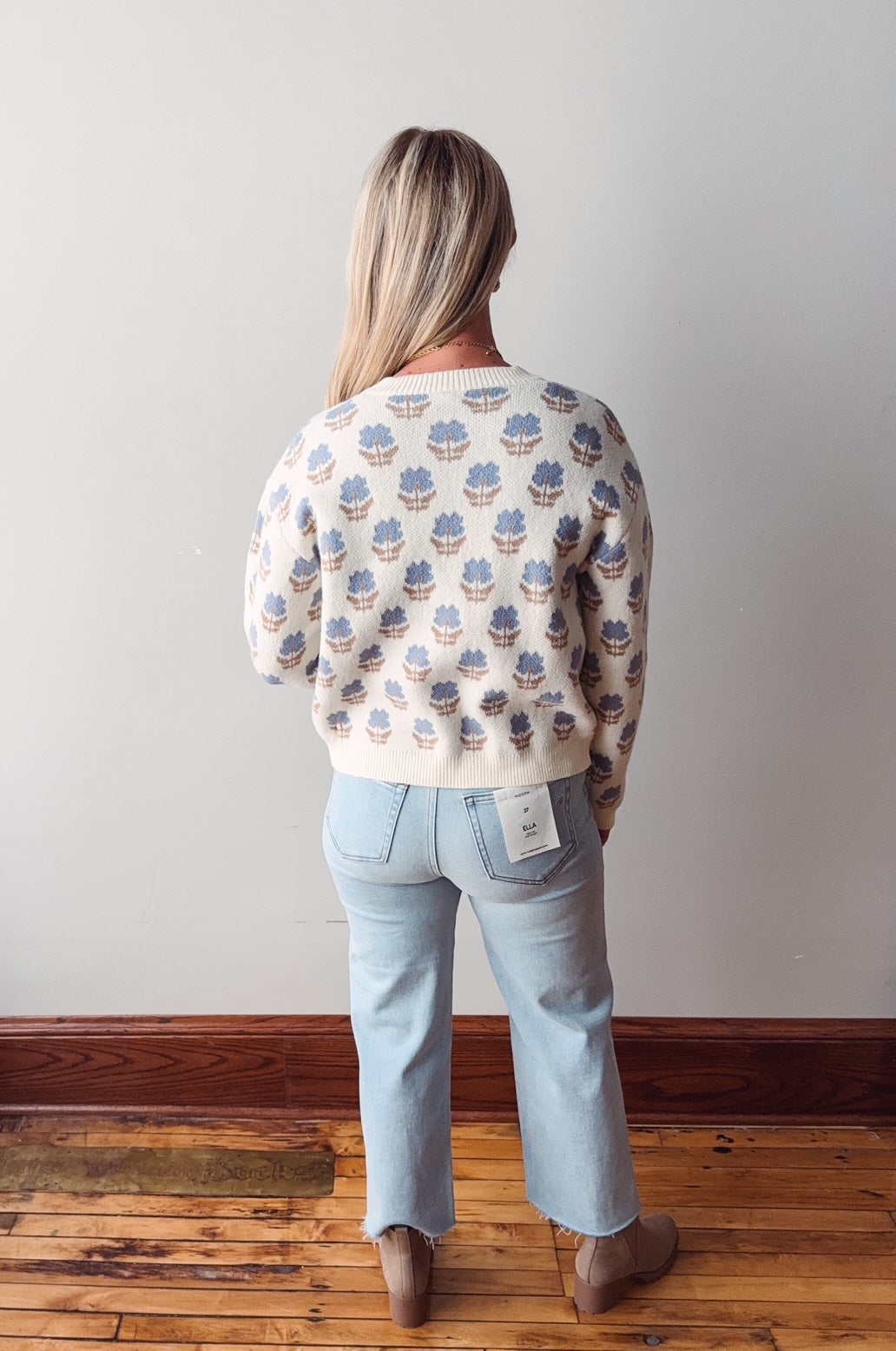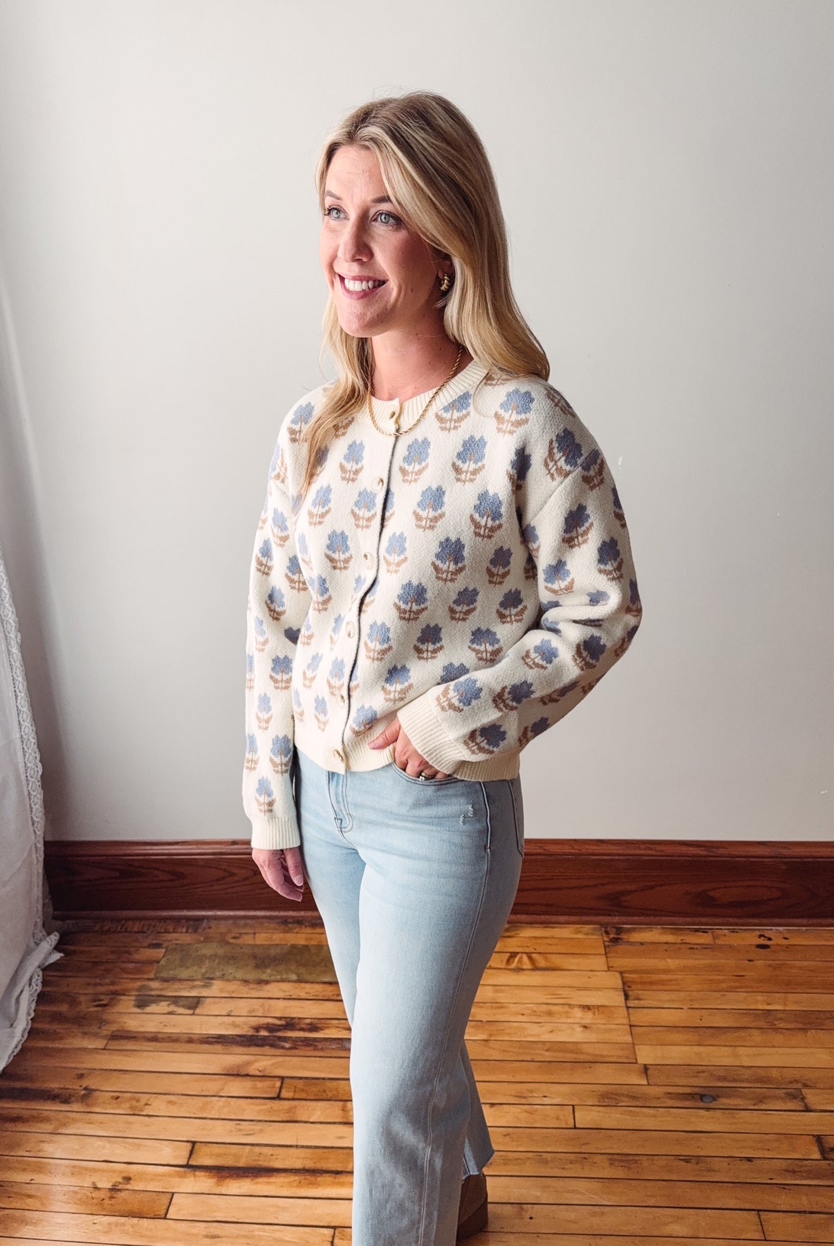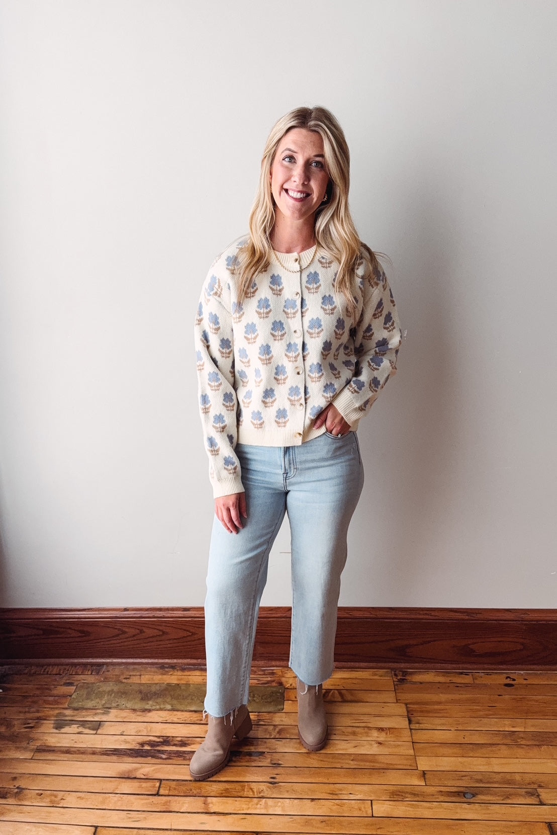 CREAM + BLUE FLORAL JACQUARD BUTTON-UP CARDIGAN