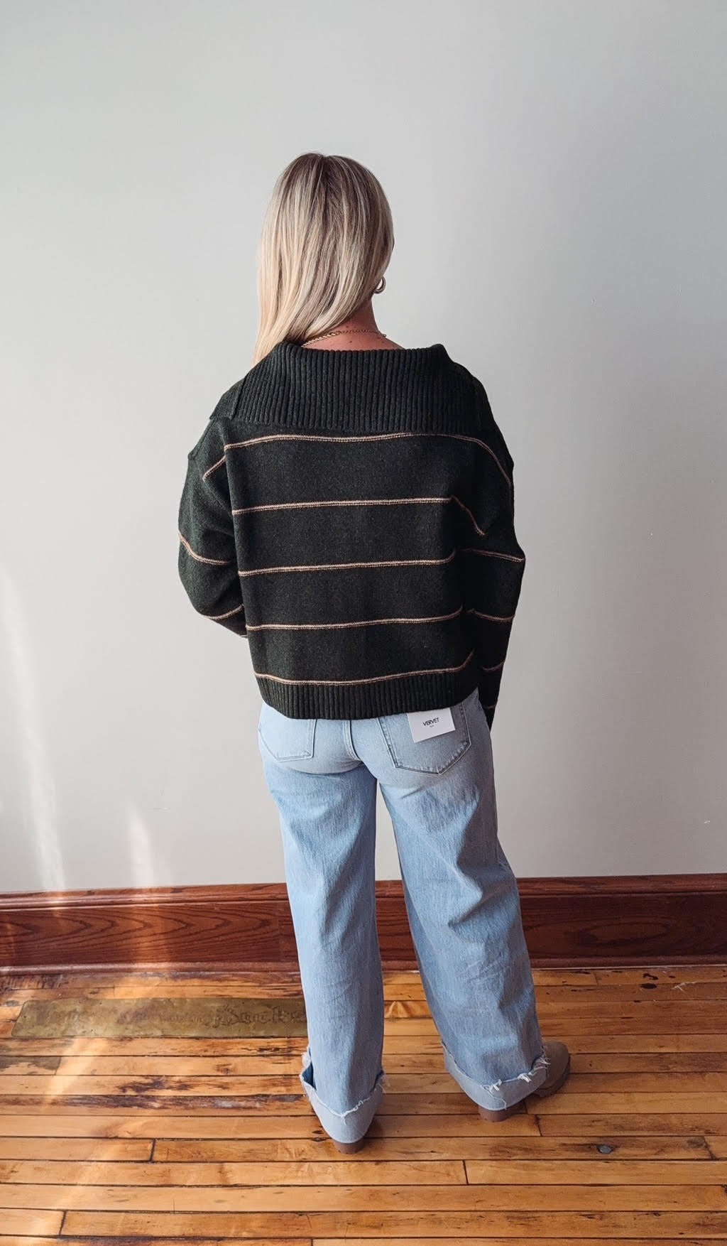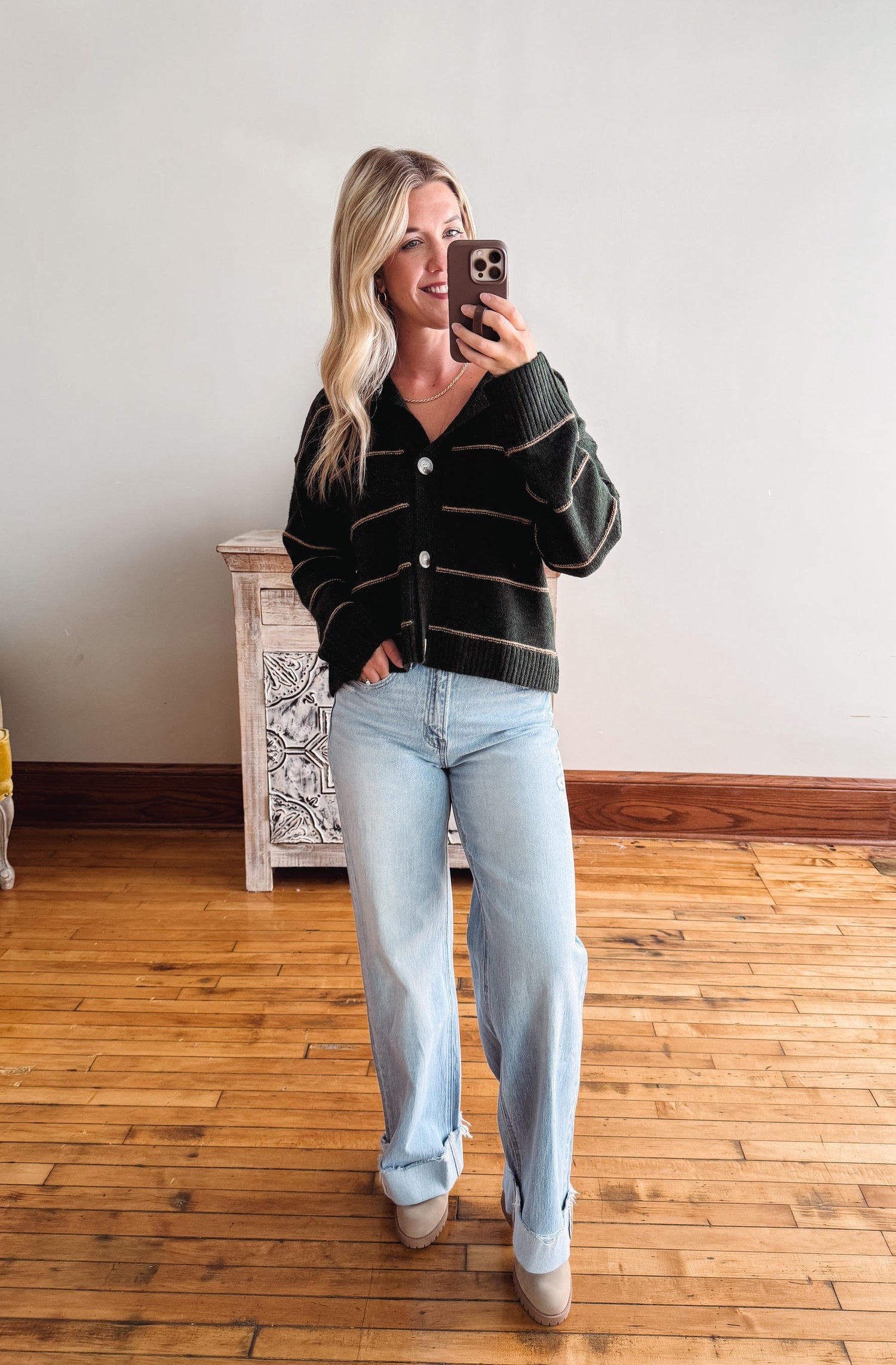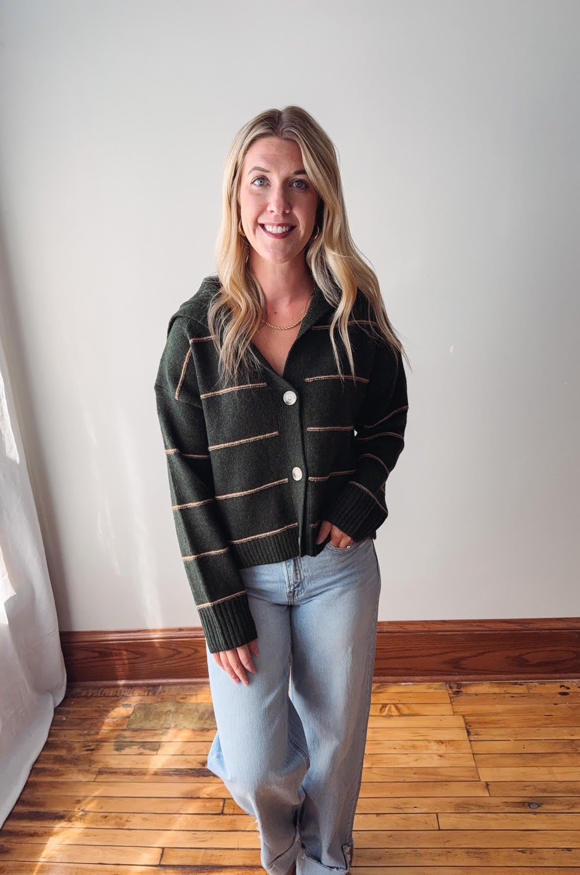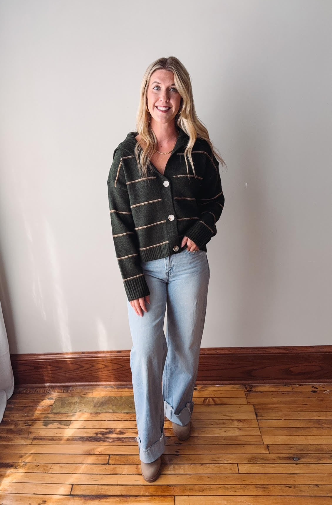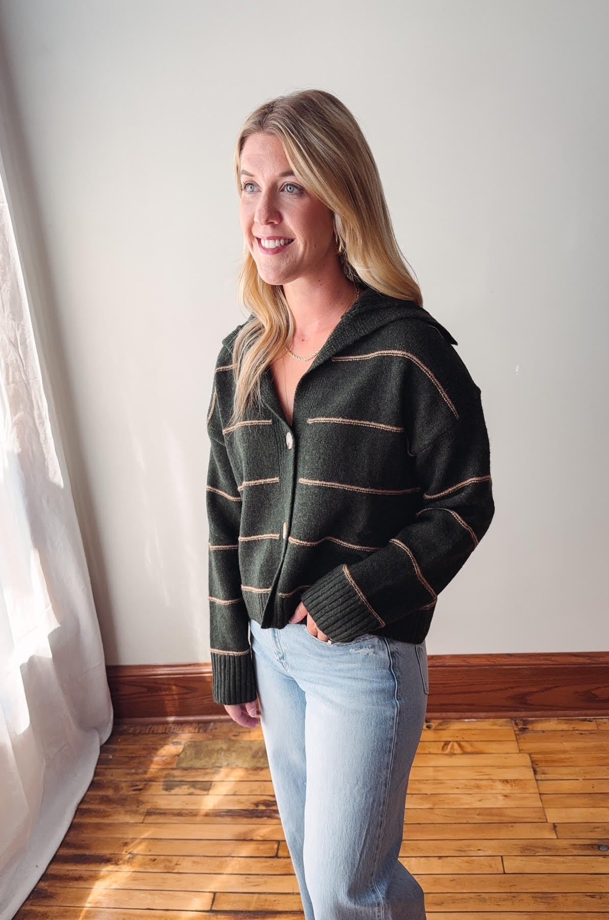Olive Multi Button-Up Striped Collared Long Sleeve Top