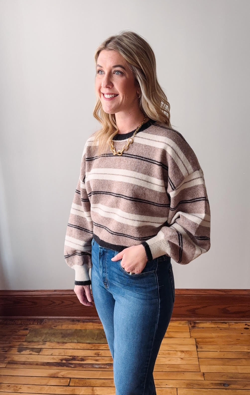 This striped knit sweater is your new go-to for effortless cool. Featuring a relaxed drop-shoulder silhouette and cropped length, it hits just right for layering or solo styling. The round neckline and long sleeves are framed by cozy ribbed trim at the collar, cuffs, and hem for that polished finish. With its loose, comfortable fit, this sweater proves that the best style choices are the ones that feel as good as they look.