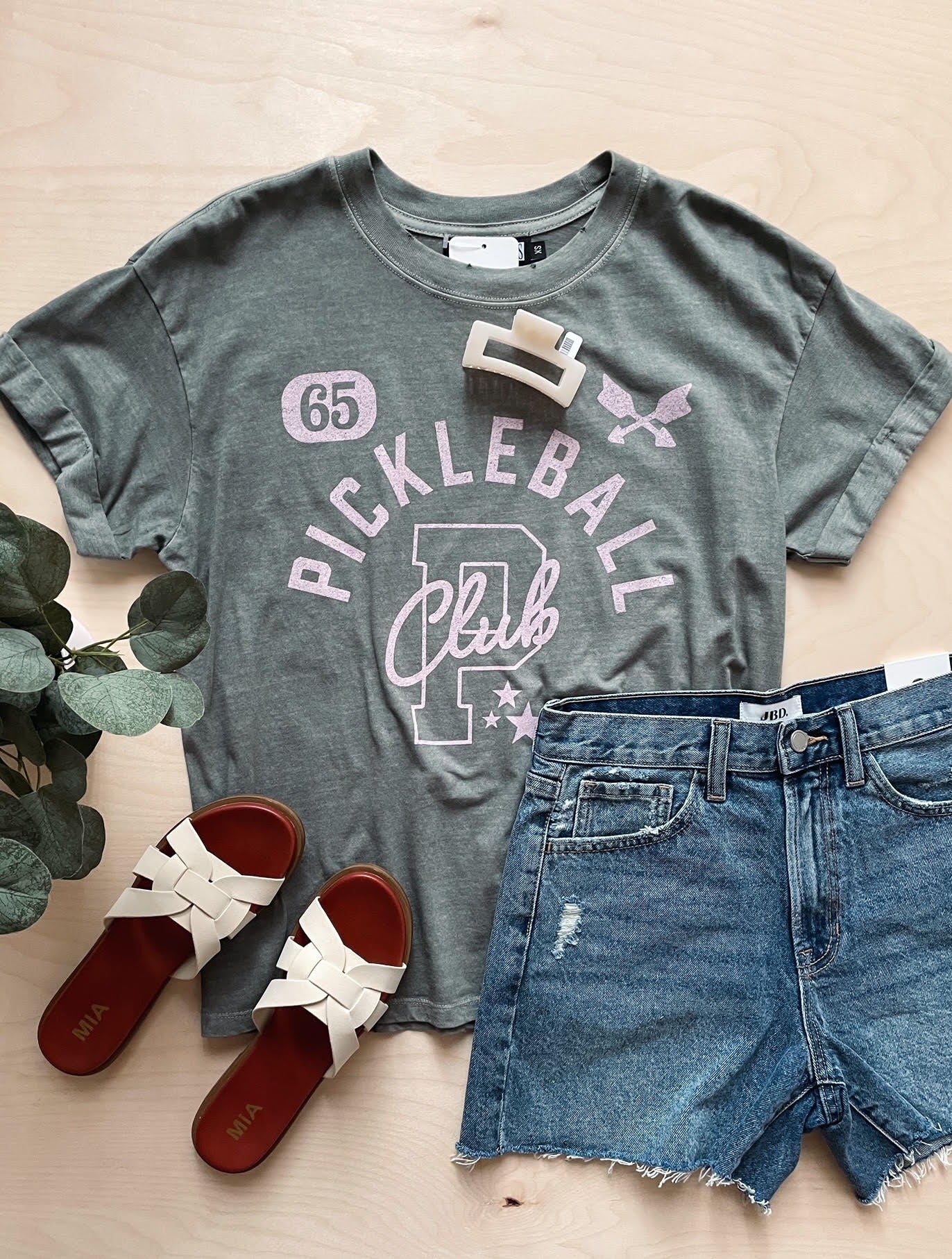 A Girl Dangerous tee on the softest army green colored shirt made of 100% cotton. Says "Pickleball Club" in light pink block letters with stars and arrows. Folded sleeves.