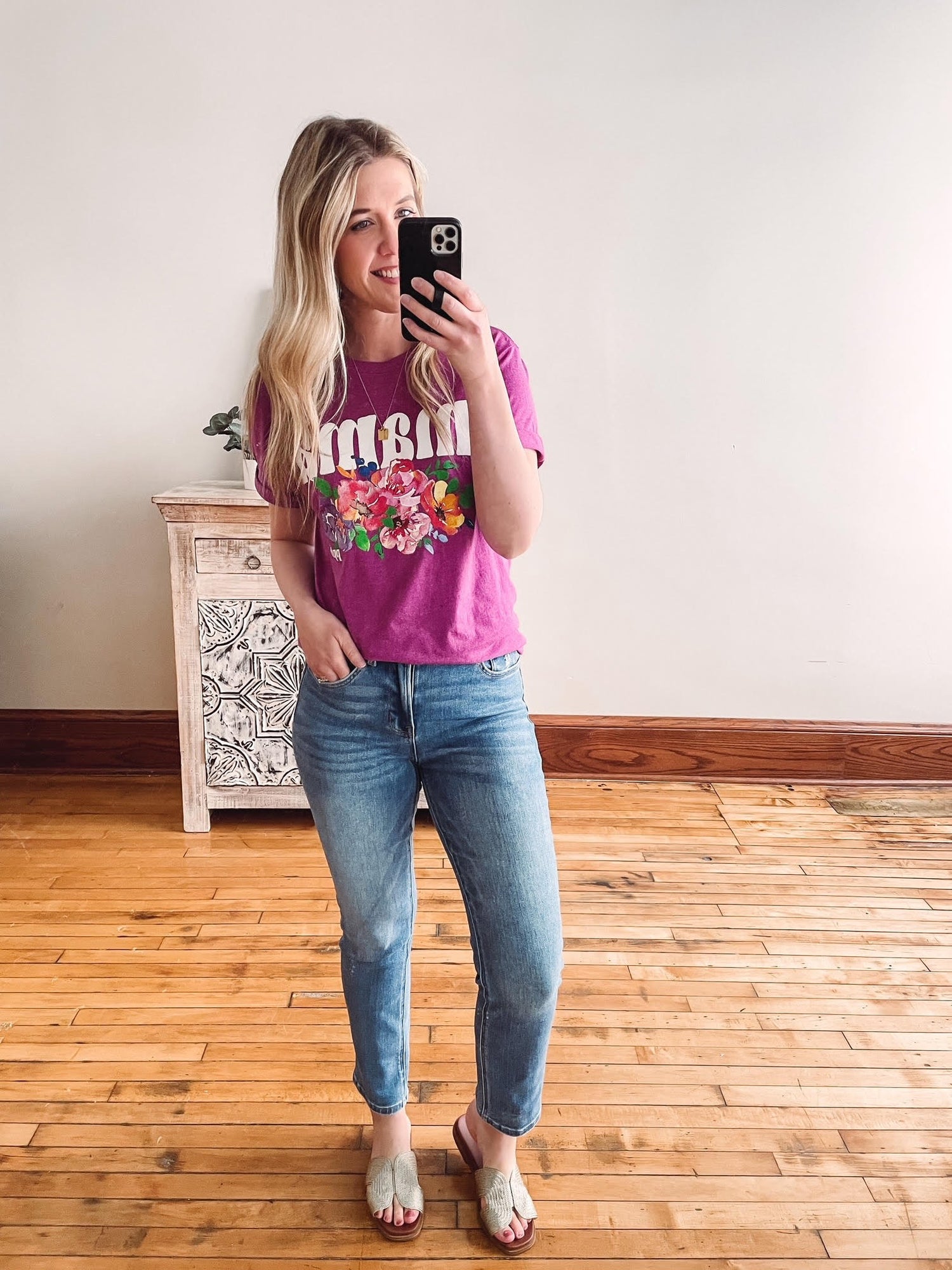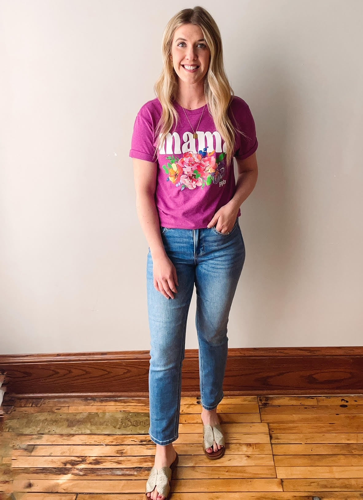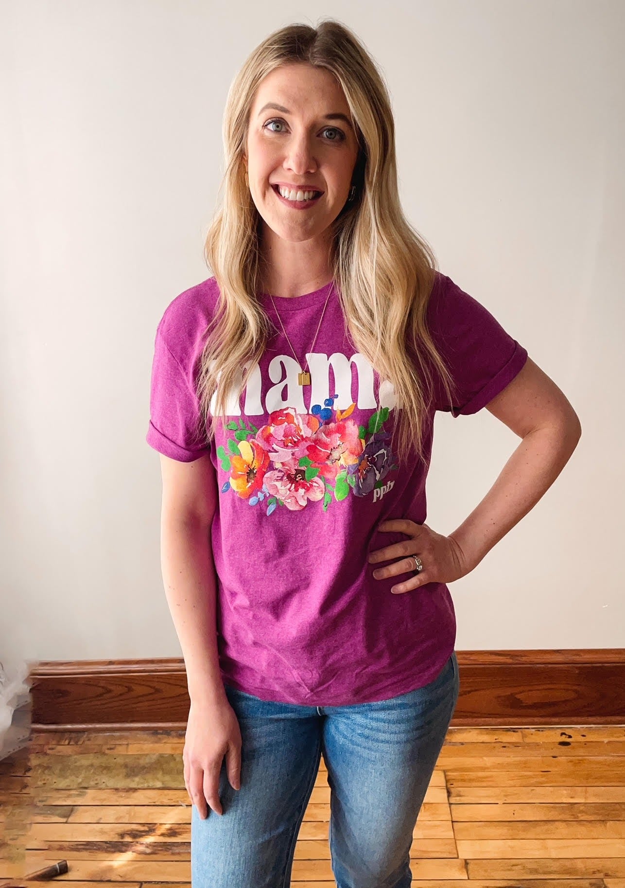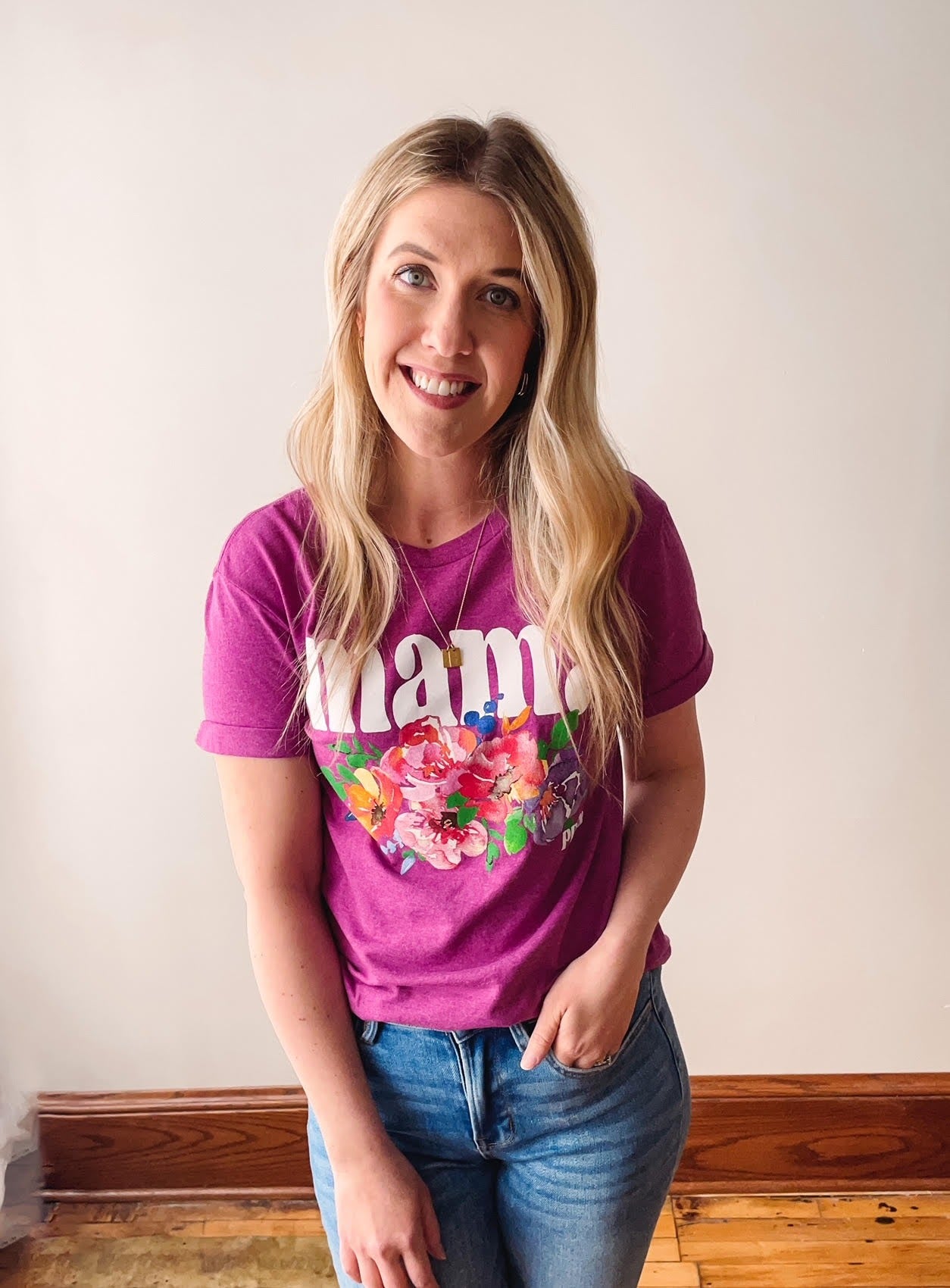 Raspberry Port and Company unisex tee with professionally screen printed water color flowers and mama in white bold lettering.