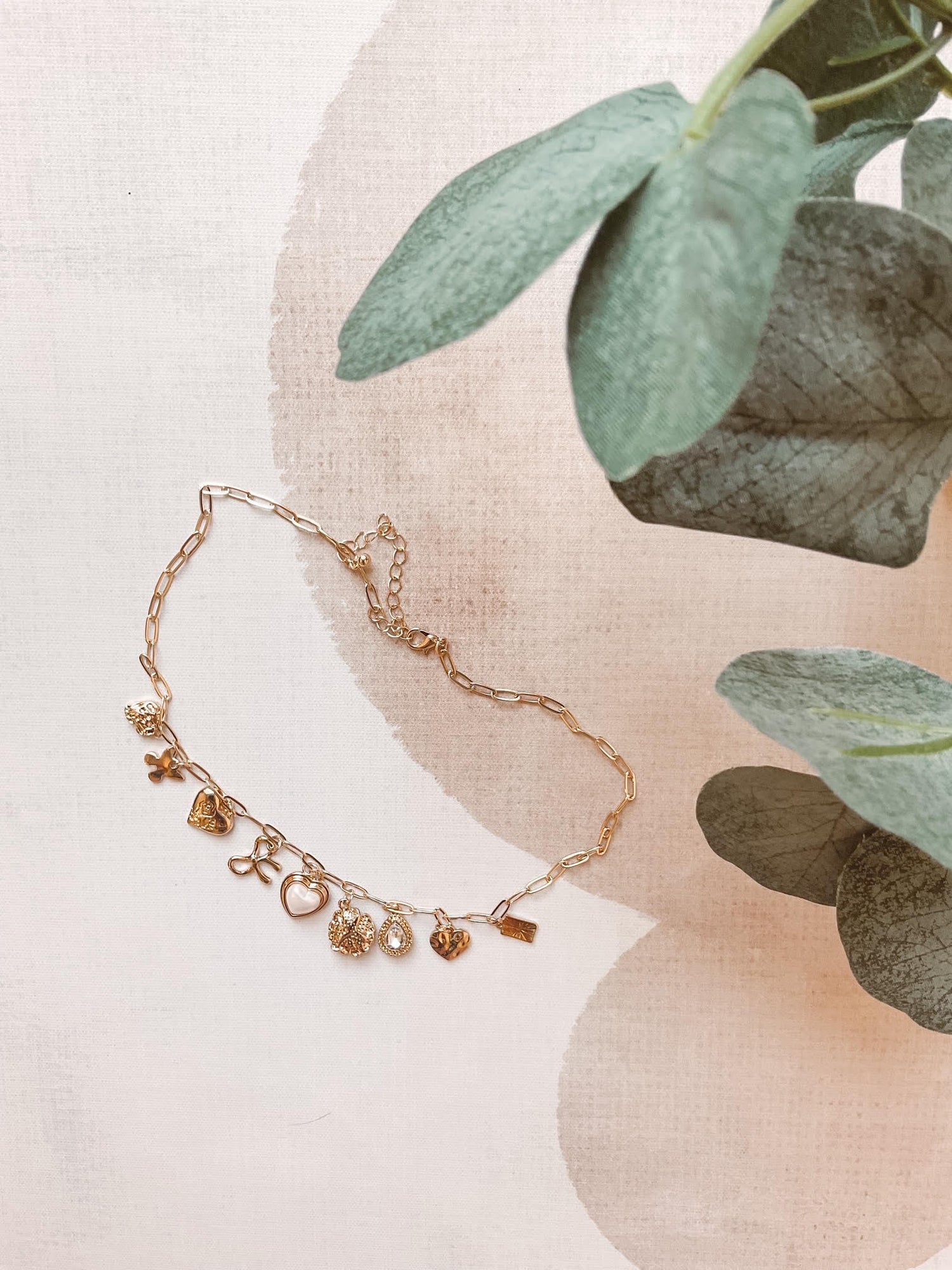 This intricate piece features an eclectic mix of charms, including a radiant pearl heart, a delicate bow, a classic flower symbolic rhinestone teardrop, and a sleek disc, all connected by a stylish U-shaped charm. The combination of these diverse elements creates a unique and eye-catching necklace that blends modern elegance with timeless charm.