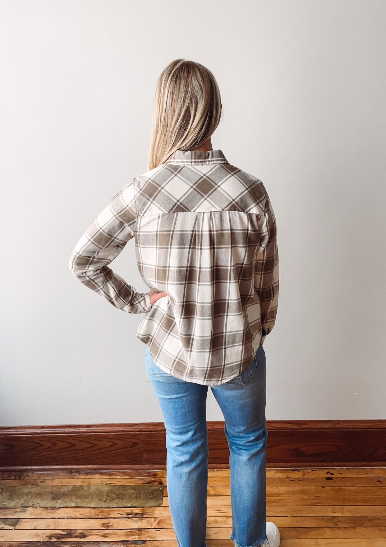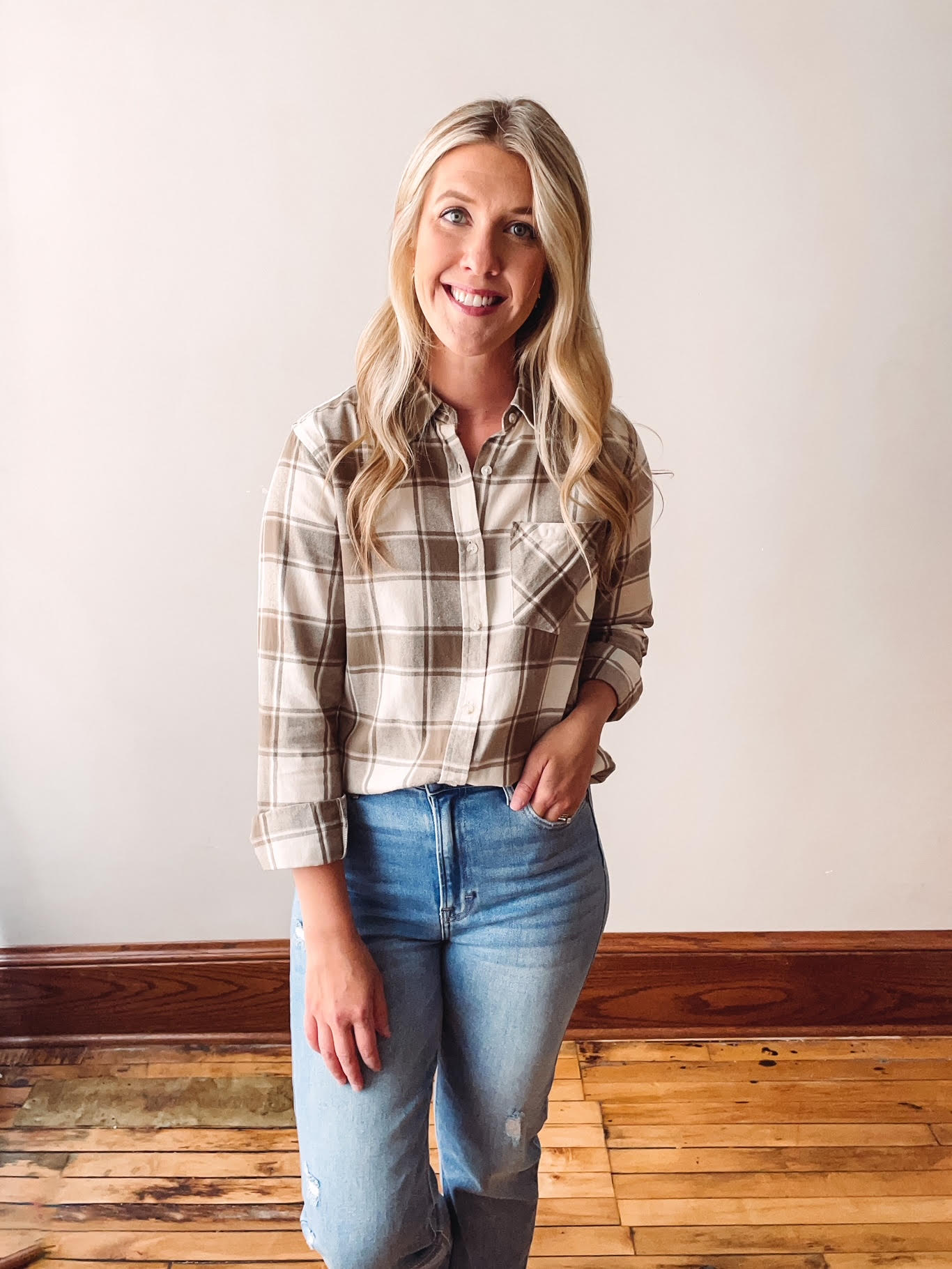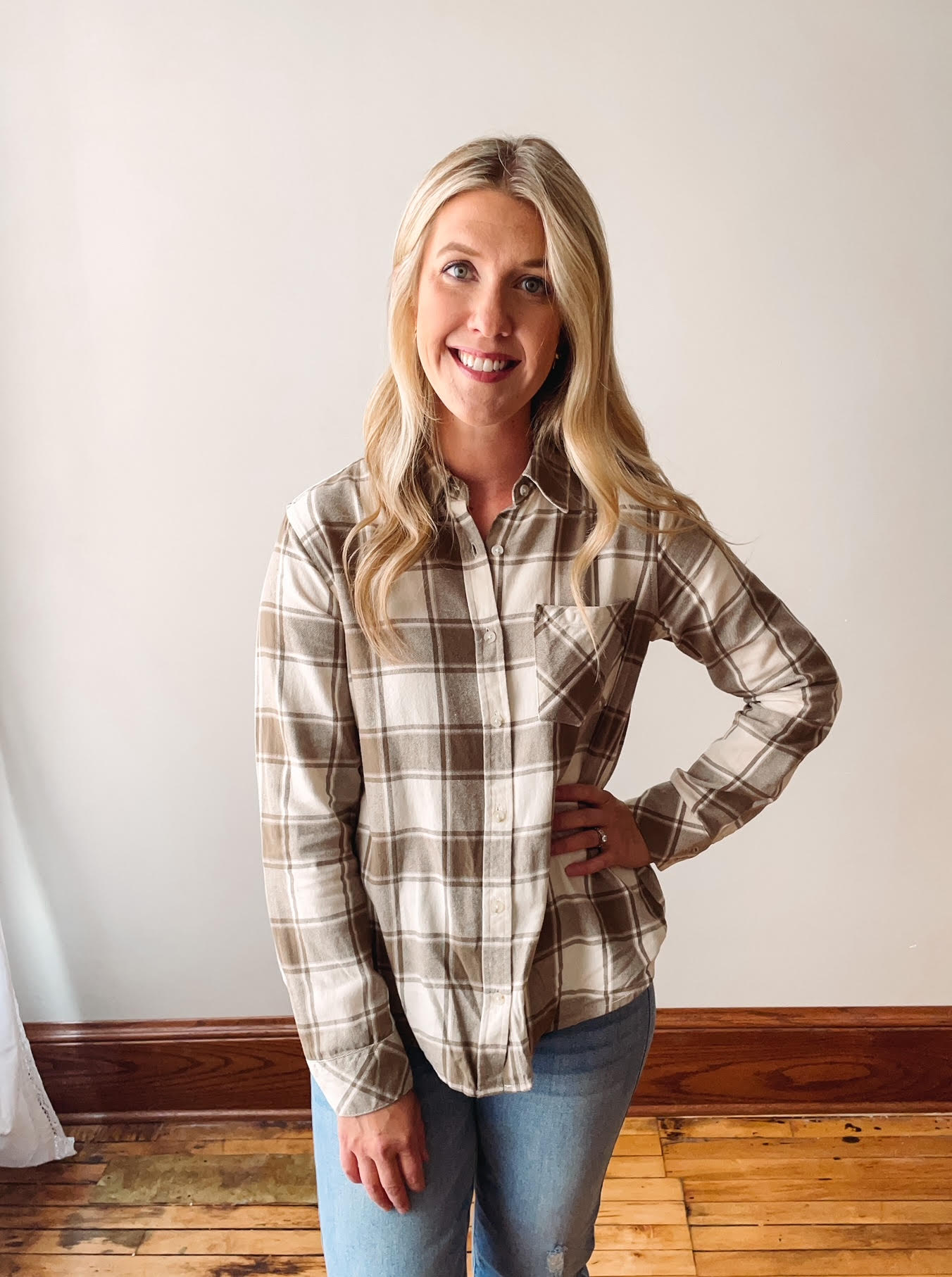 Cotton button up with cream and green plaid. One pocket on left front chest.