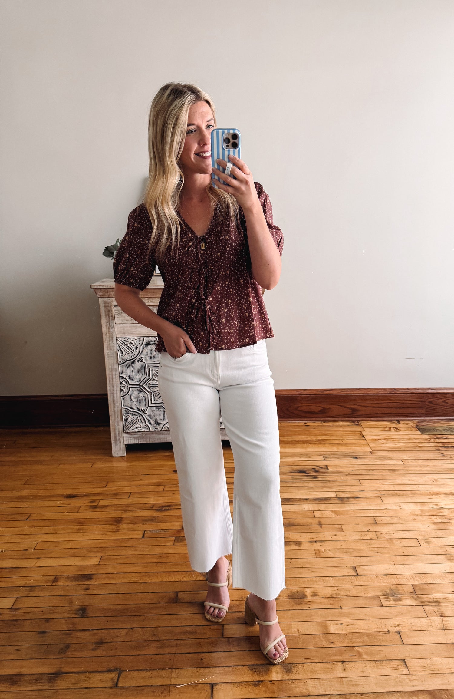 Add a touch of whimsy to your wardrobe with the Sydney Burl Wood Blouse. Featuring charming bow details, this playful blouse brings a fresh, fun vibe to any outfit. Perfect for those who love to mix style with a little personality, it’s a delightful choice for casual days or dressy occasions alike.