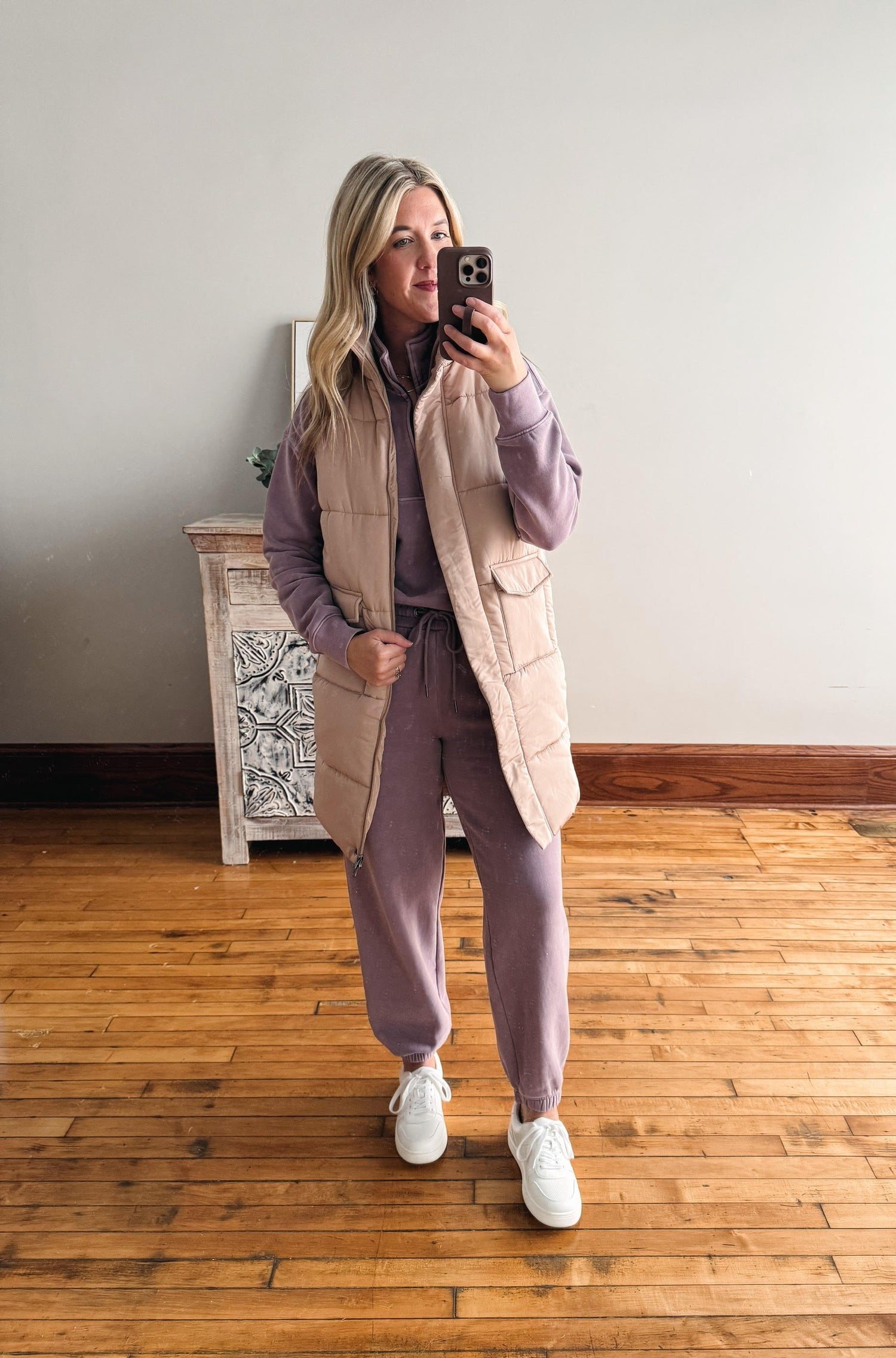 This tan long vest features a front zipper and snap closure for easy wear, plus two handy side pockets to stash your essentials. Perfect for layering with a fun twist!