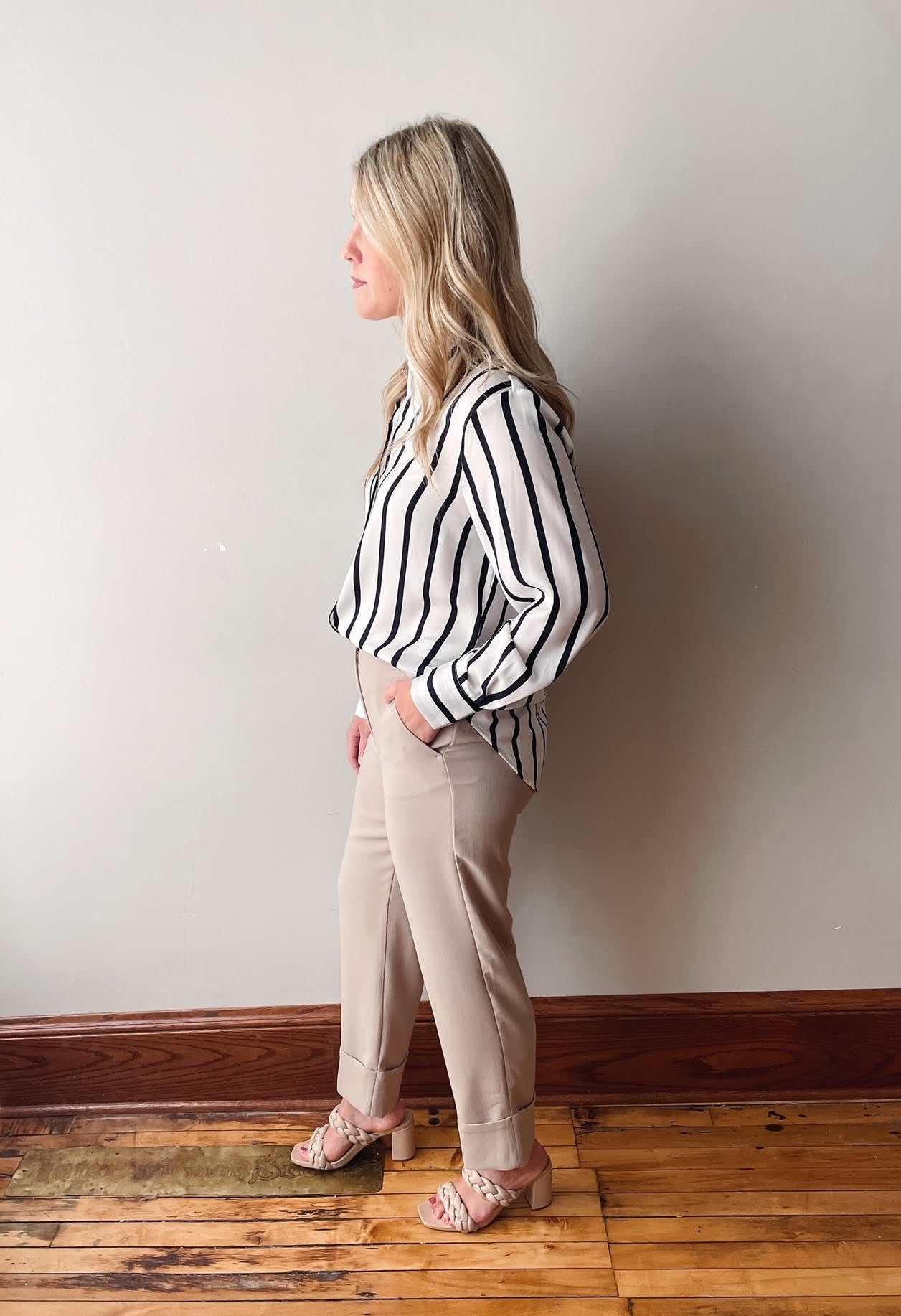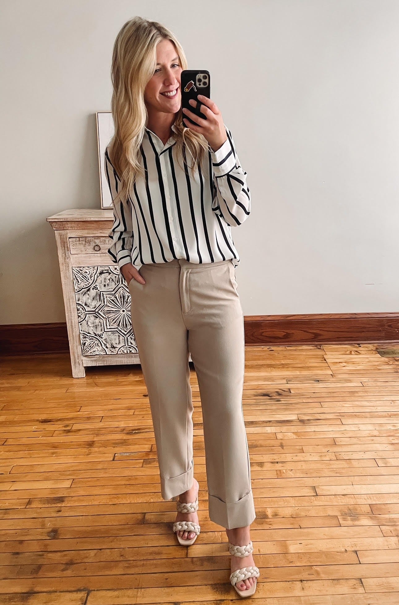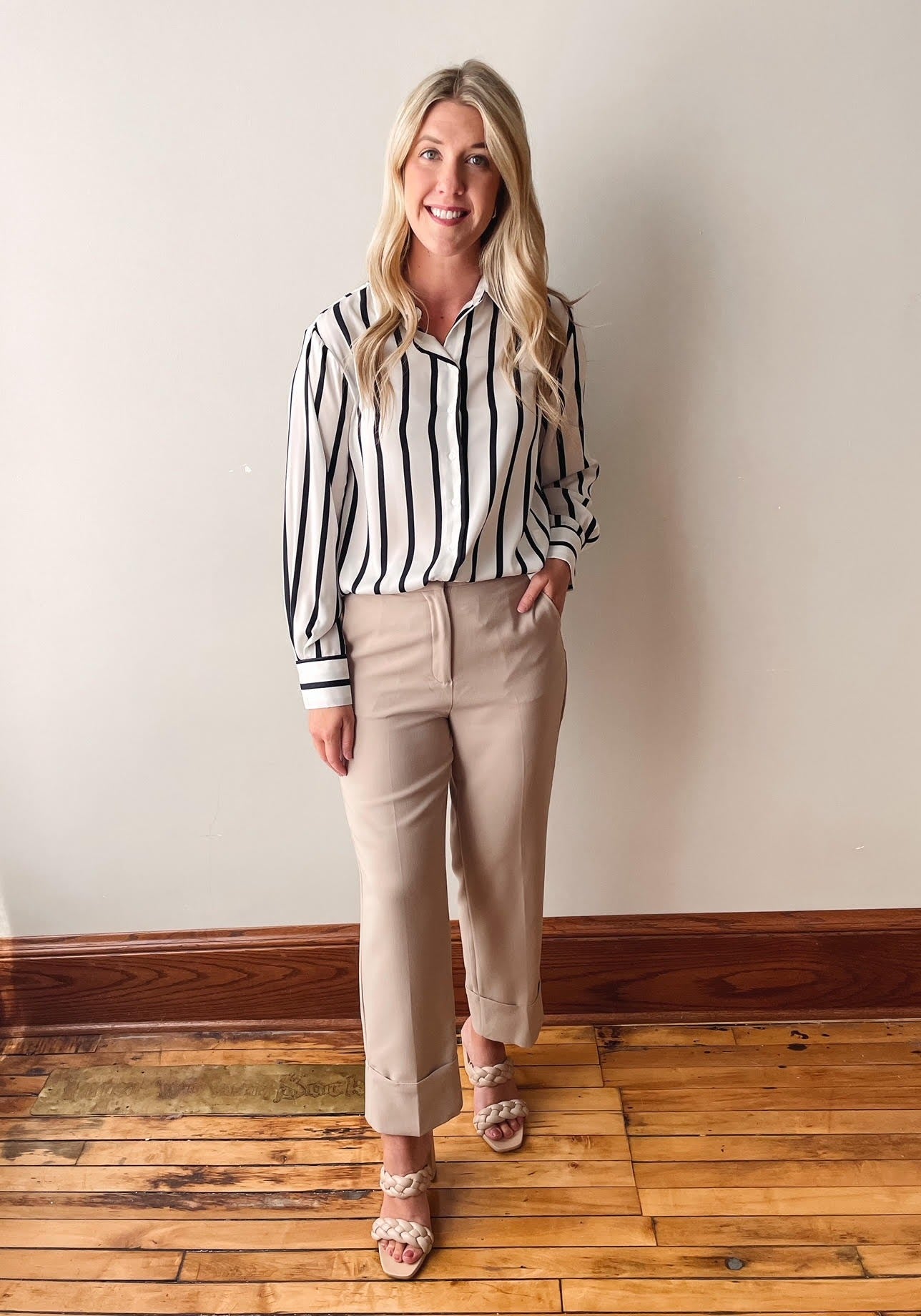 Light taupe dress pants with straight legs and a thick cuff at the bottom.
