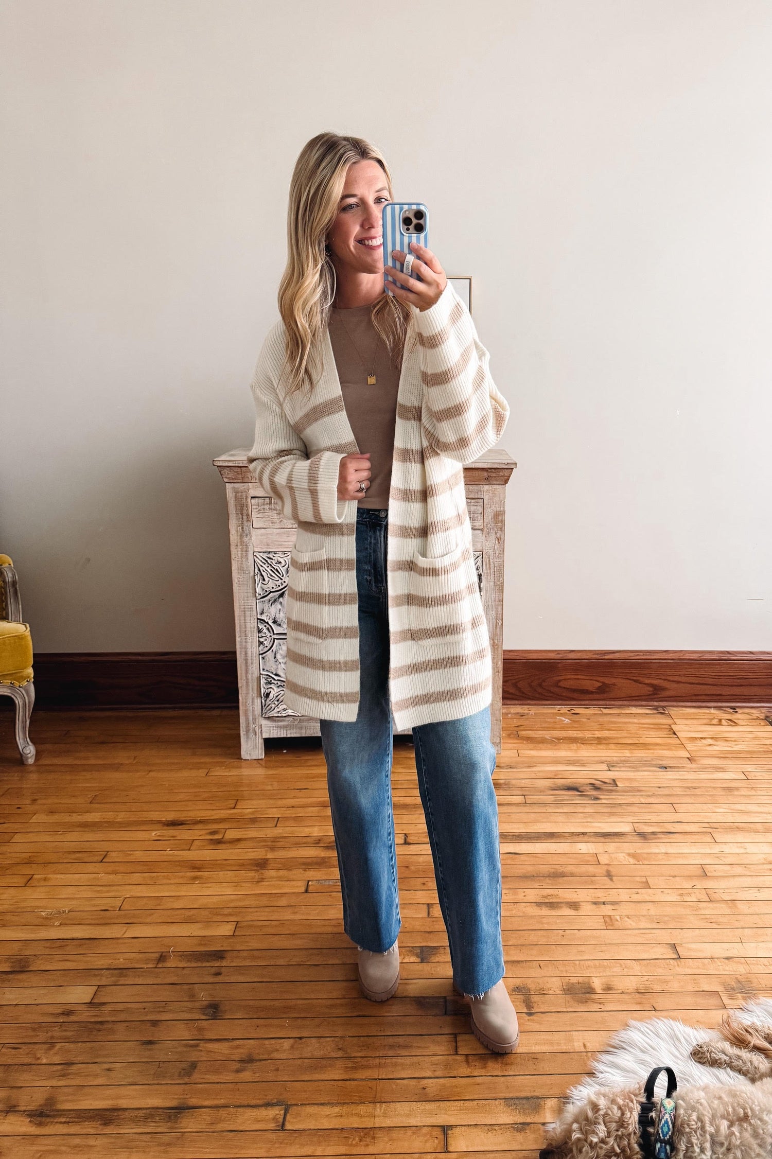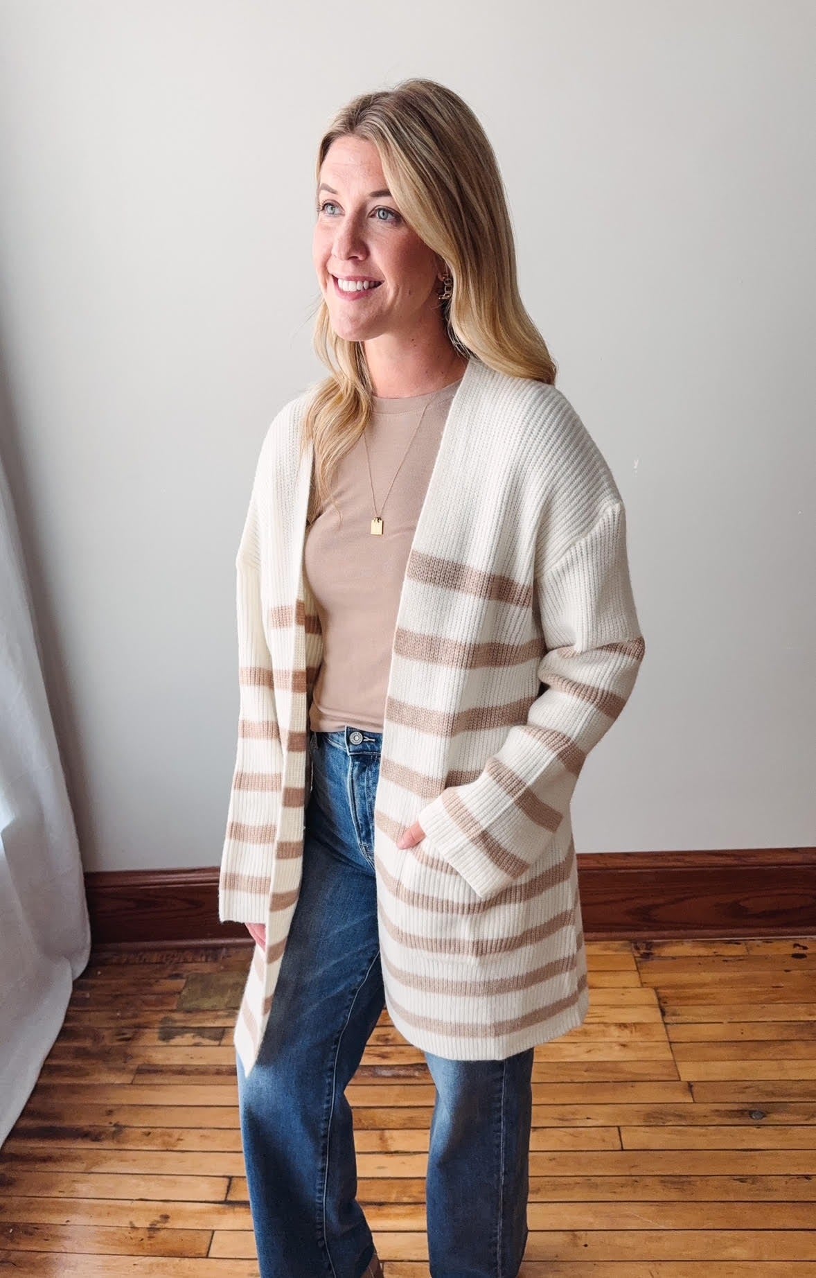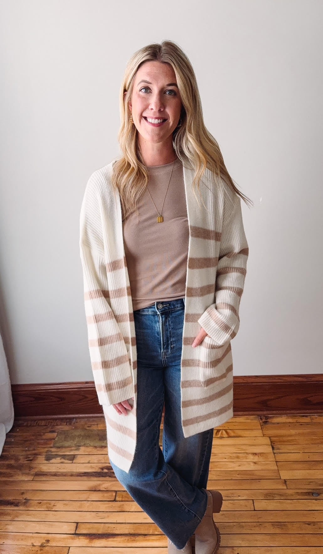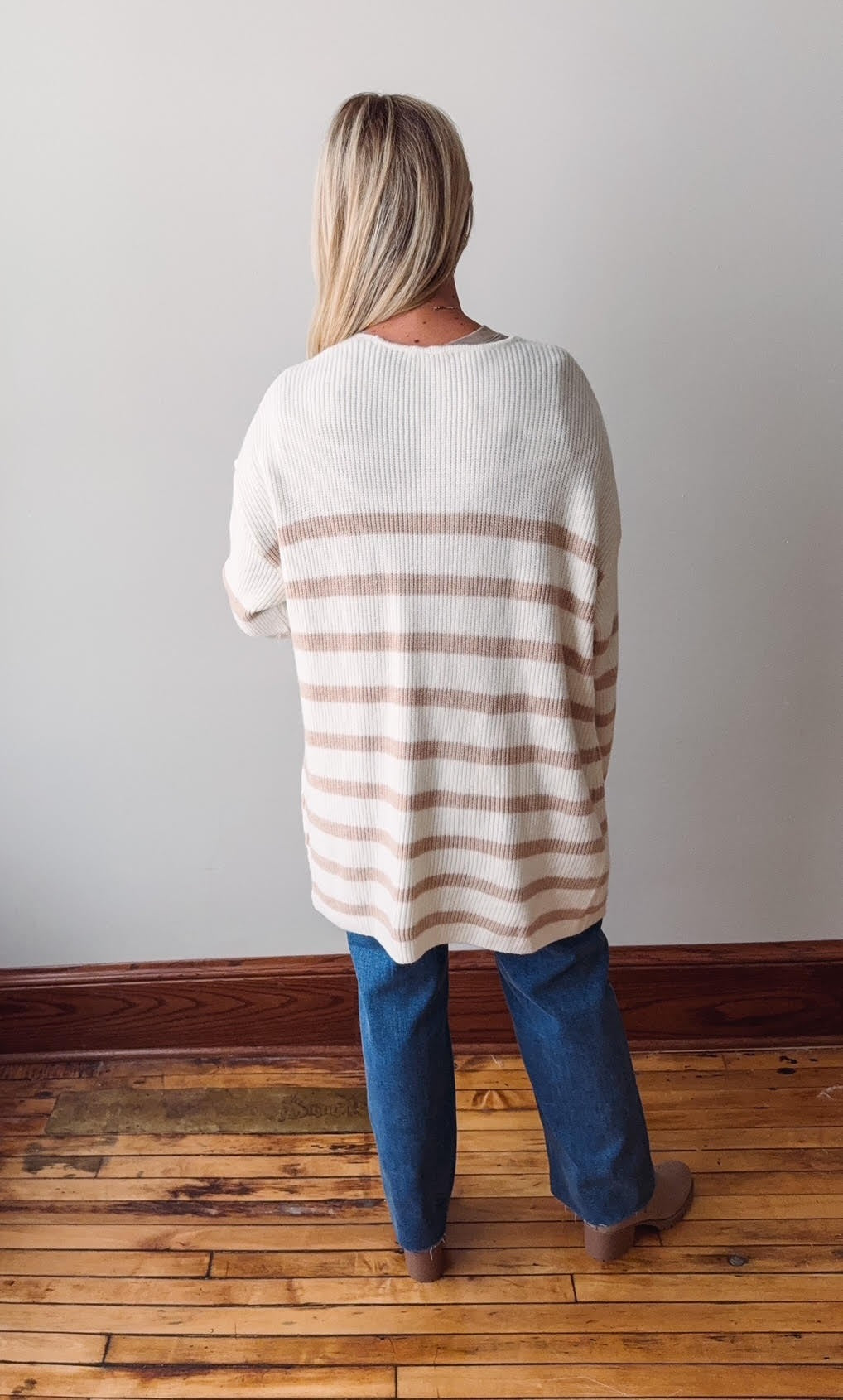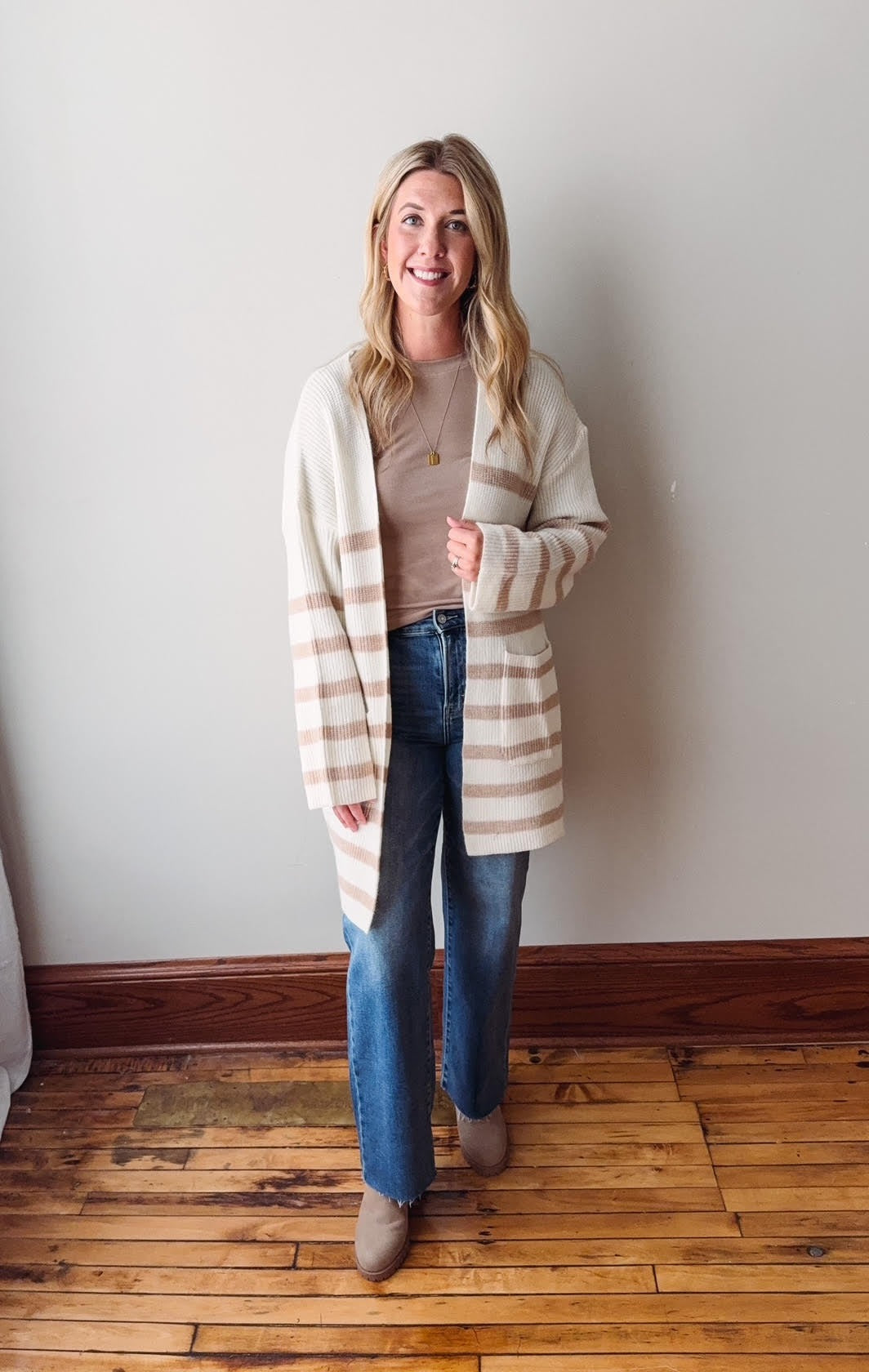 Taupe Striped Knit Open Cardigan