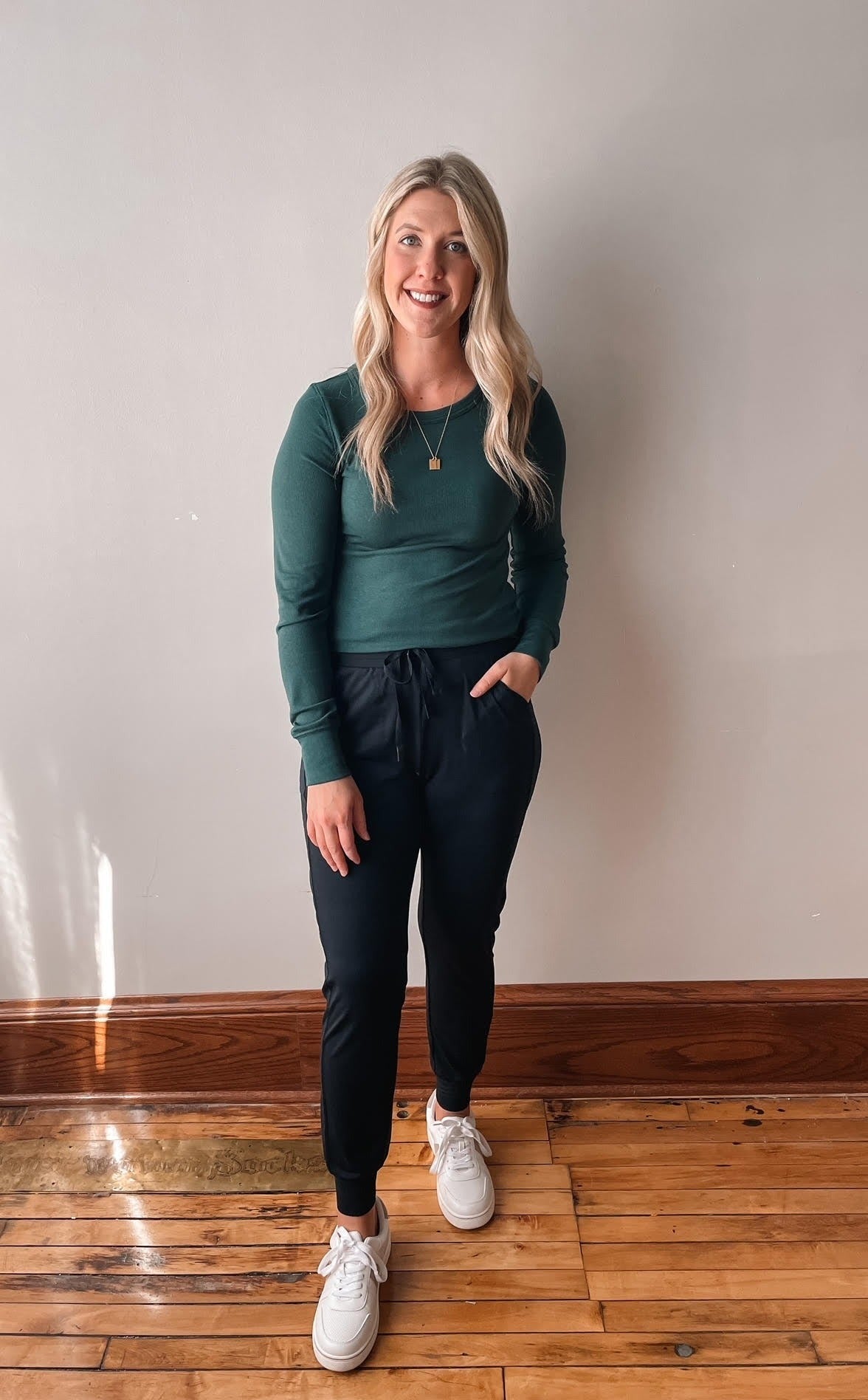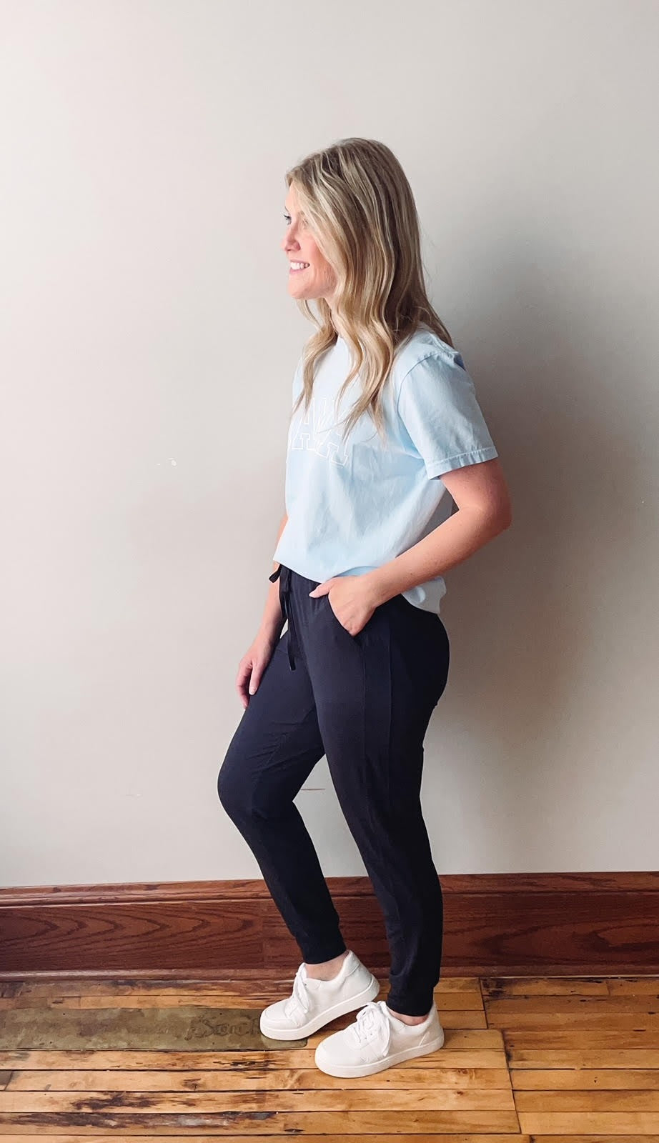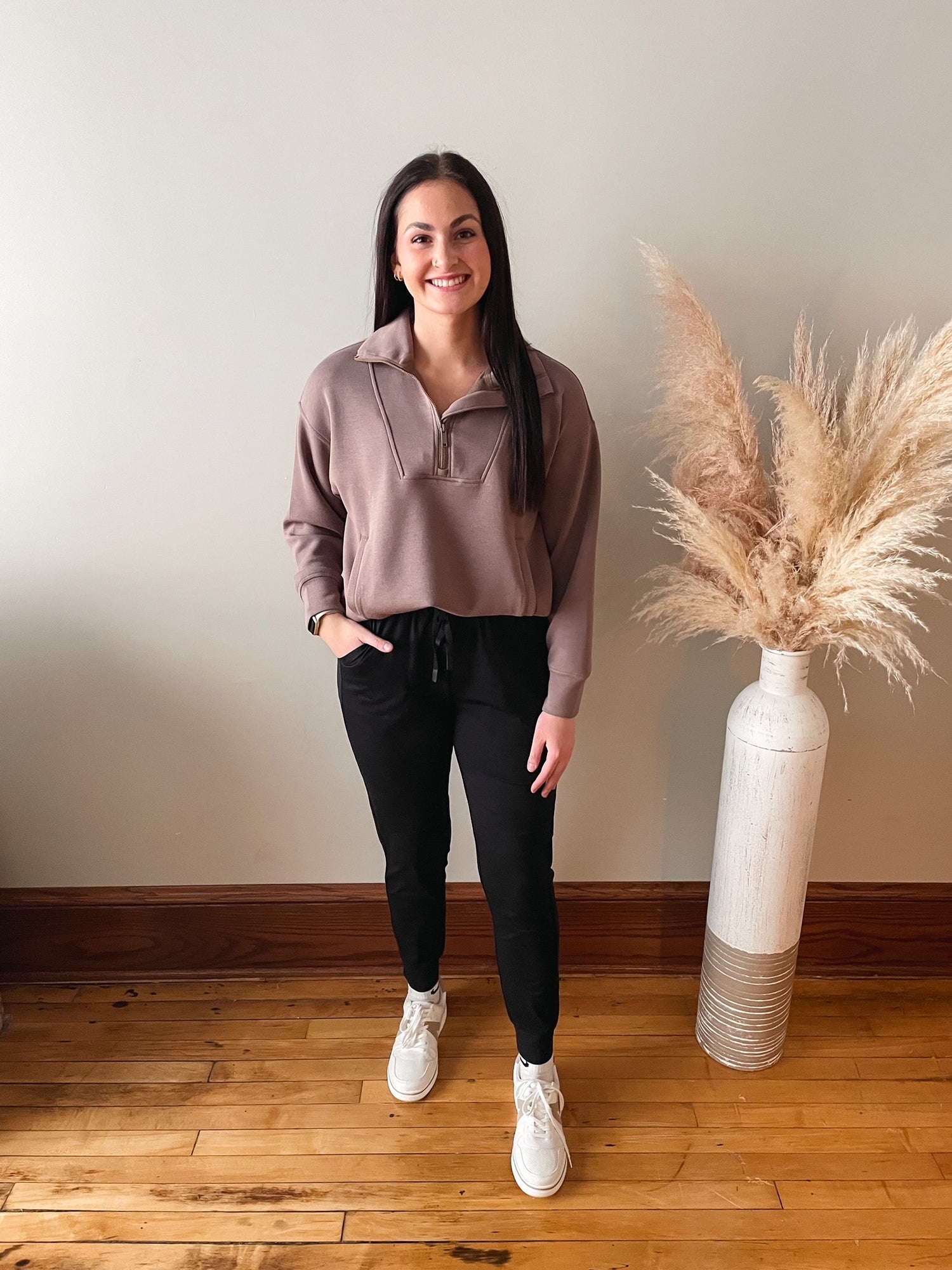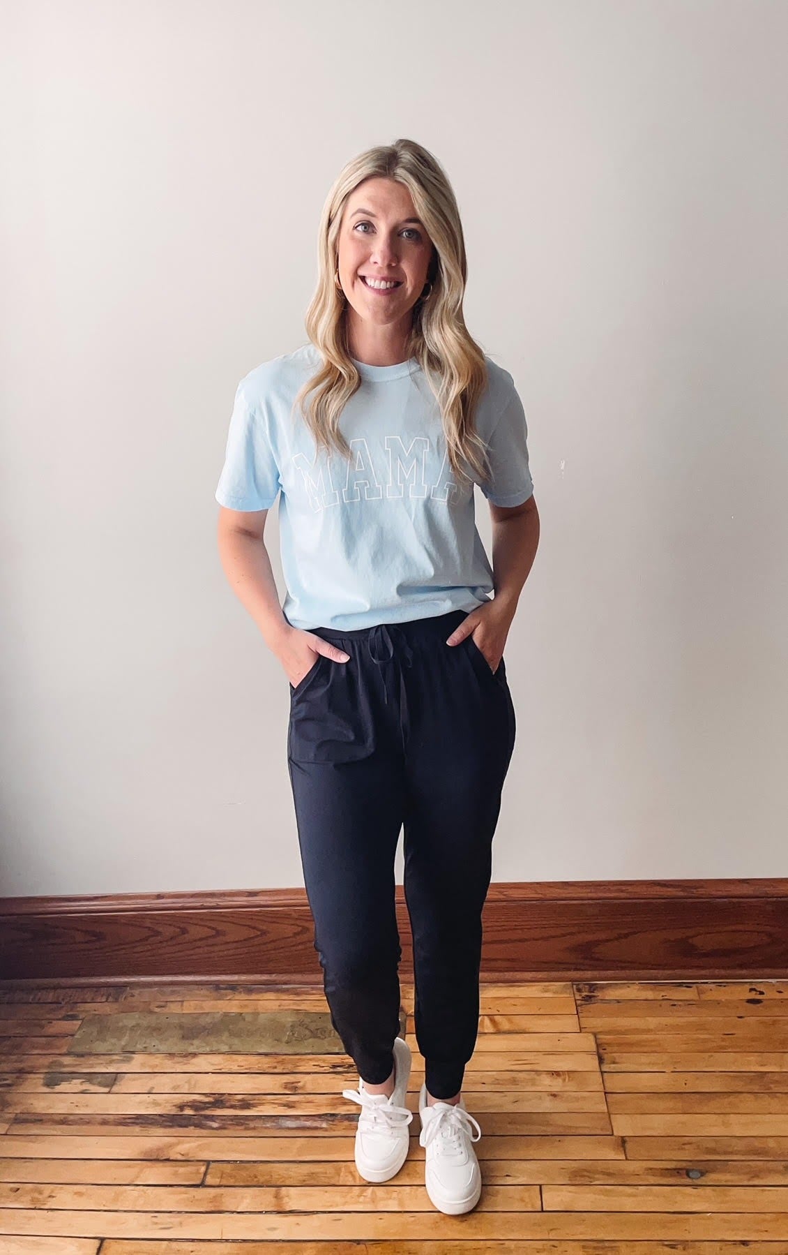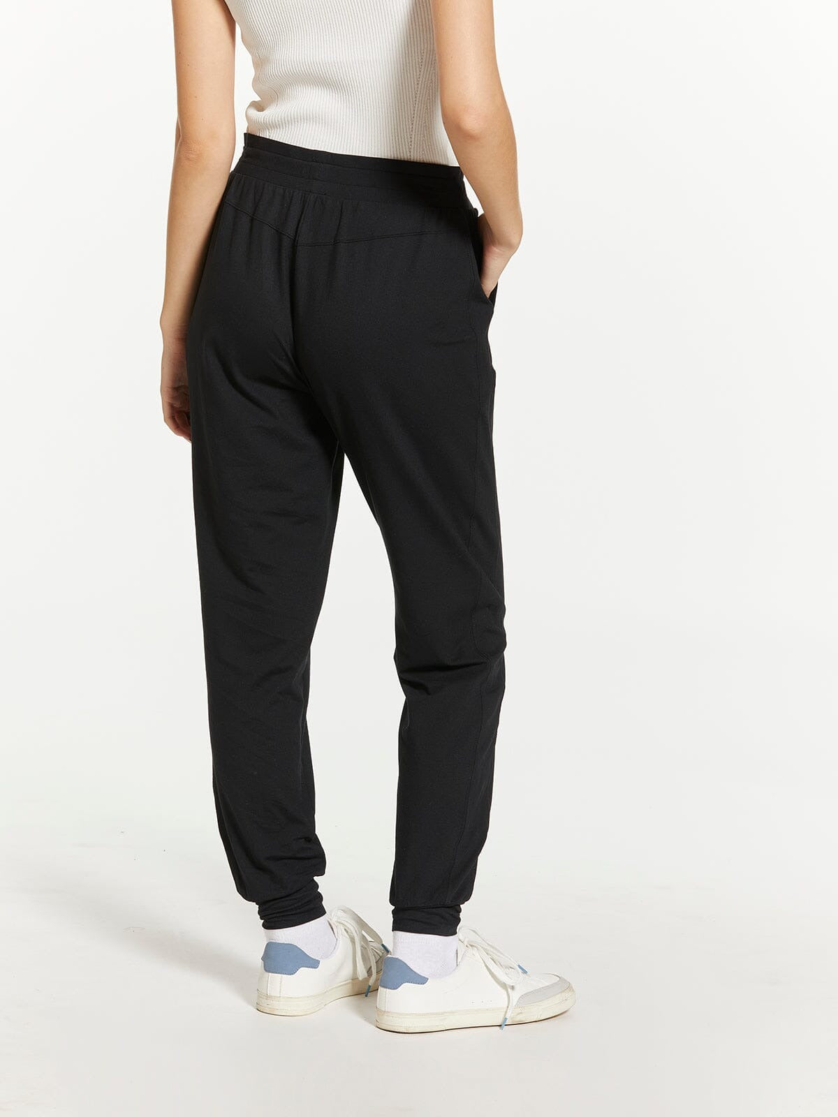 Black joggers with a drawstring elastic waist, pockets and cuffed ankles.