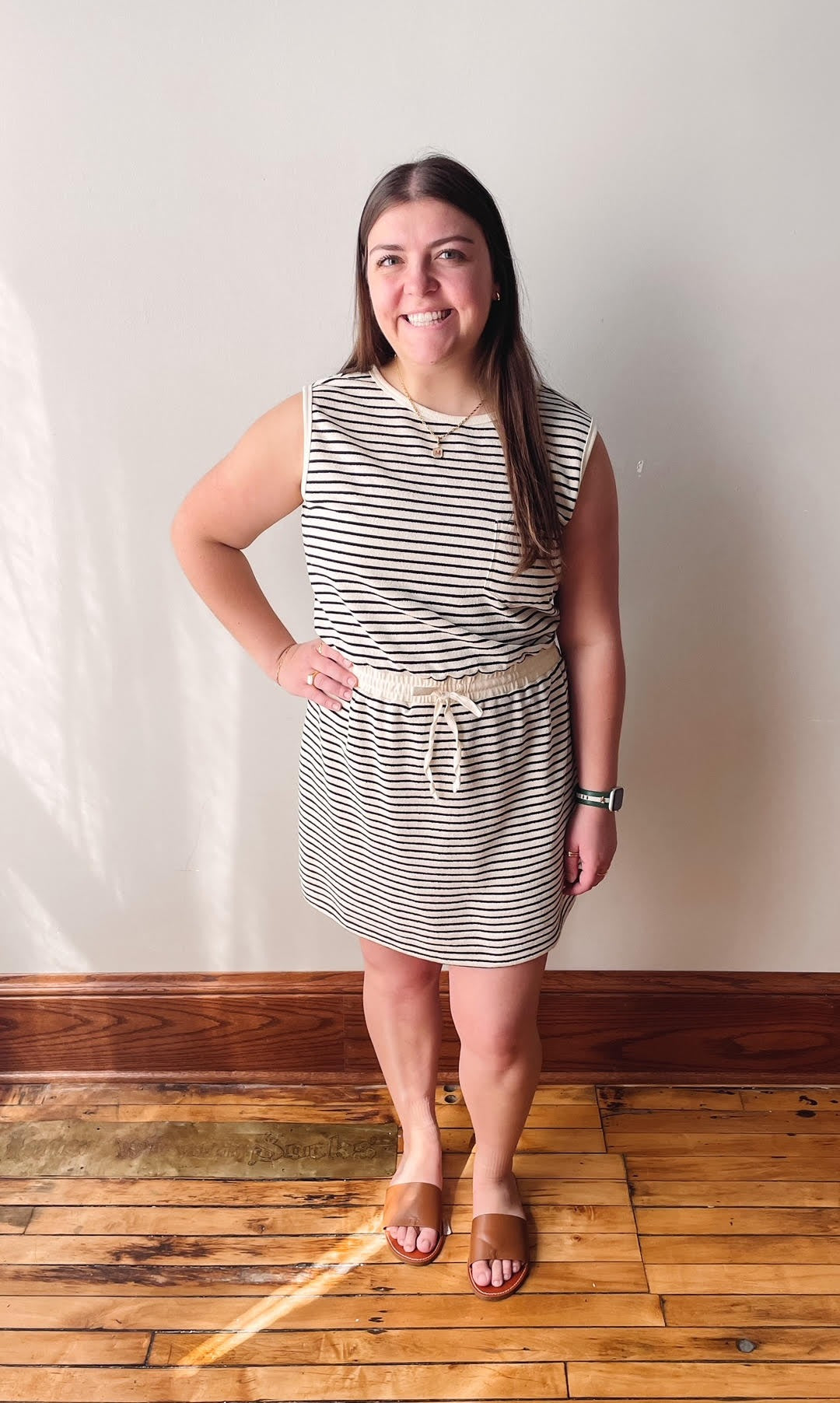 Knit Polyester Cotton Striped Round Neck Sleeveless Mini Dress With Front Pockets Back Slit And Drawstring Waist Band (No Lining)