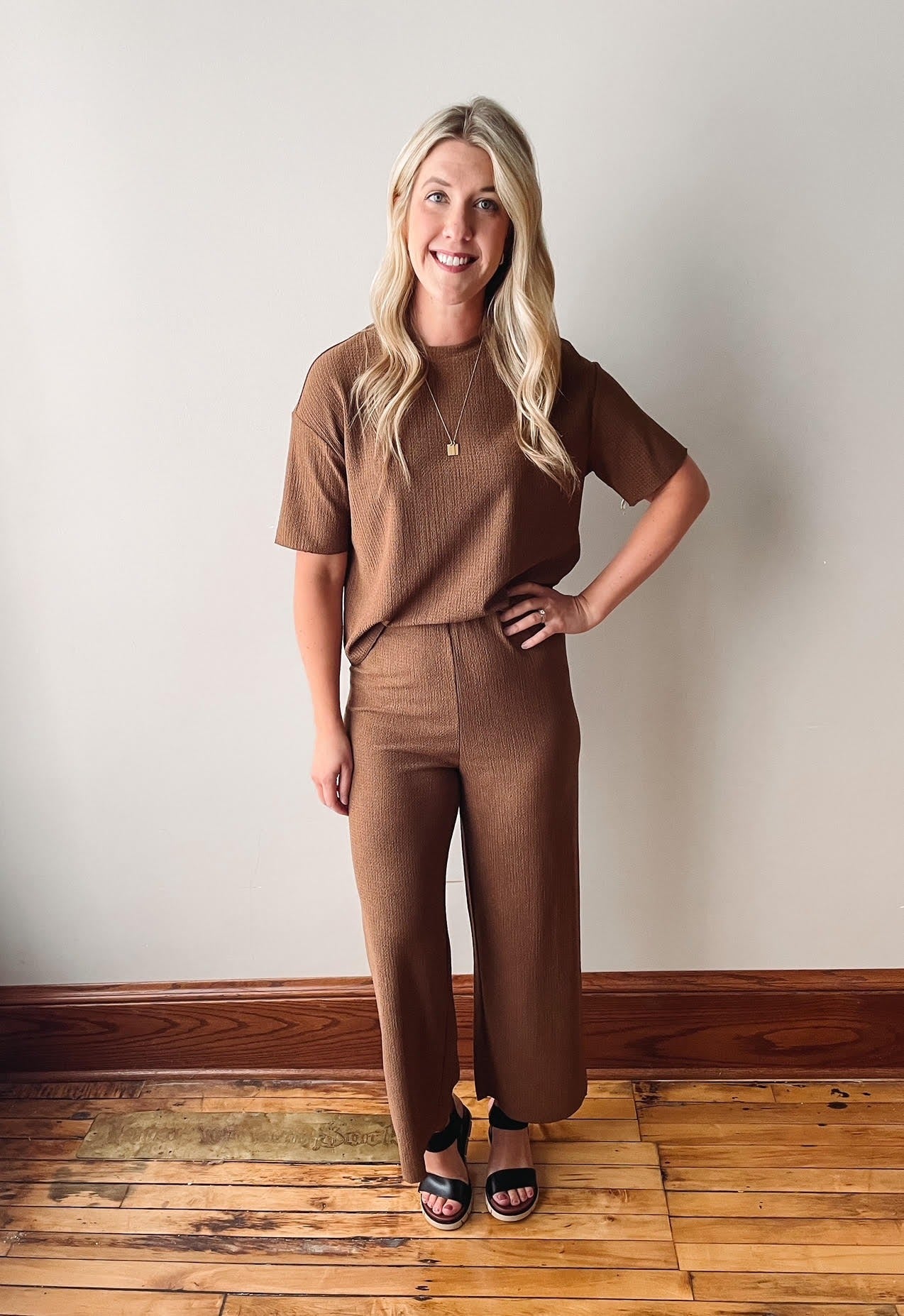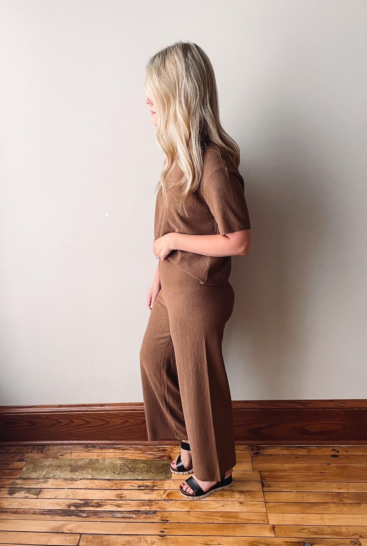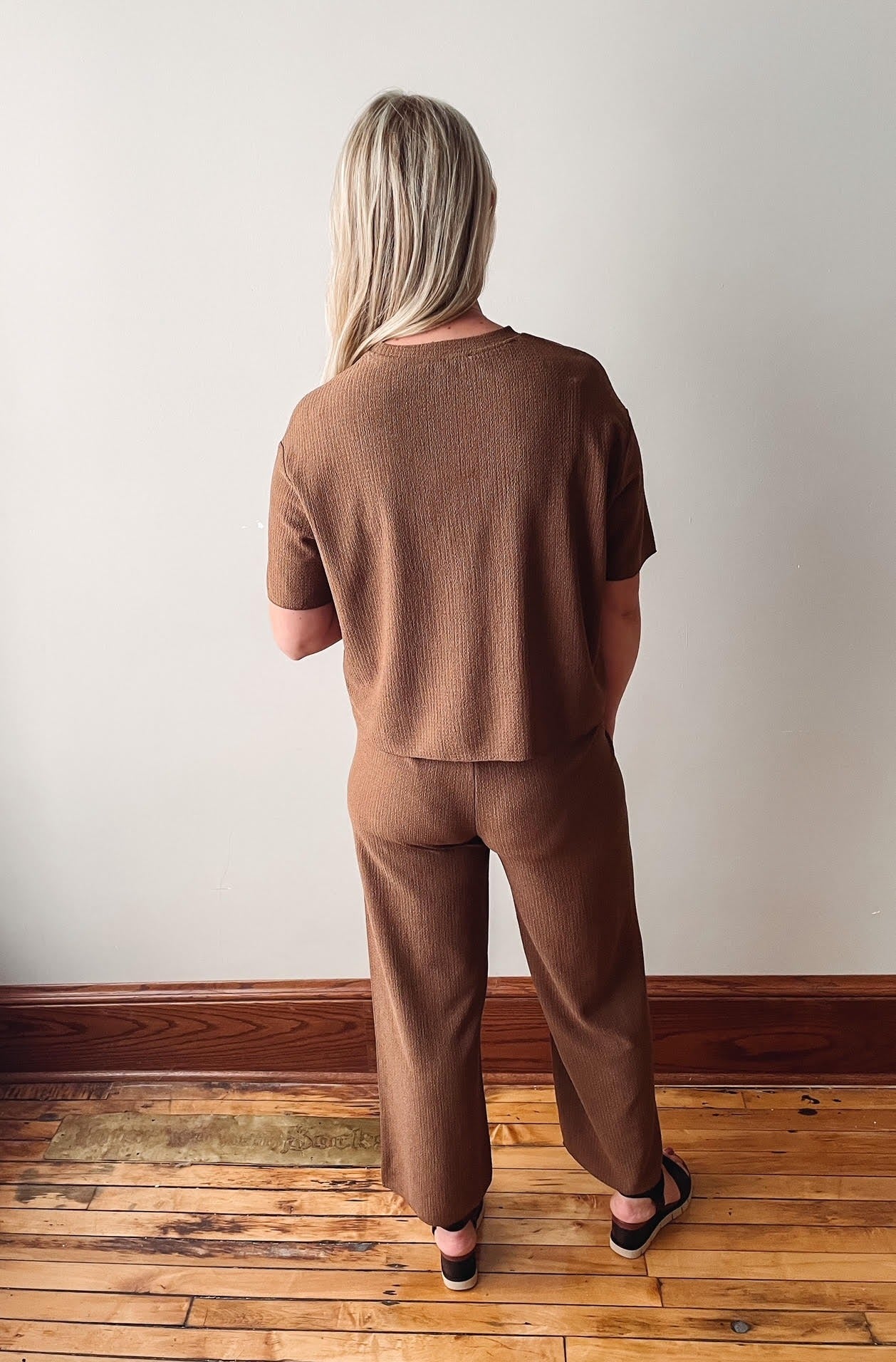 Textured brown pull on cropped pants.