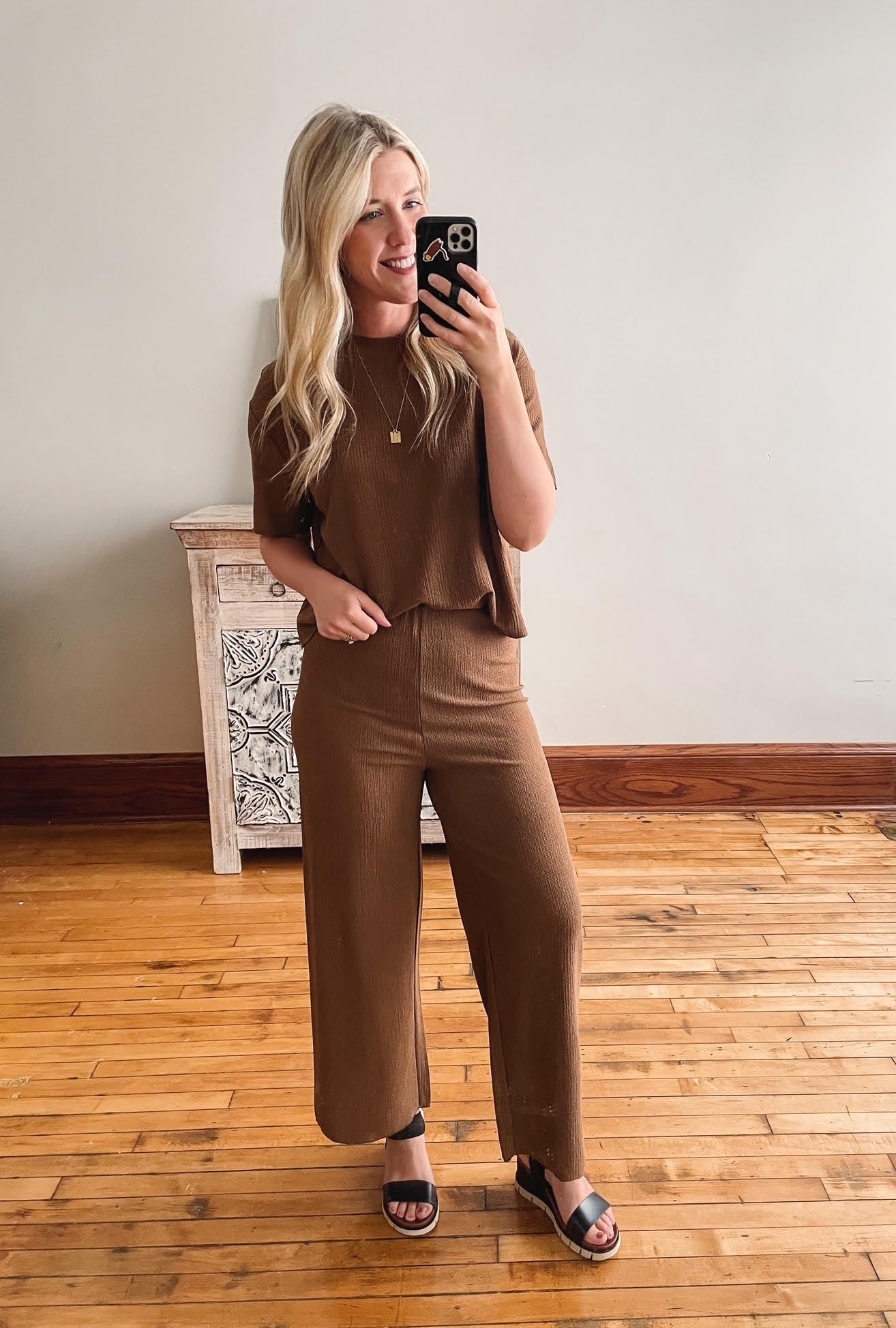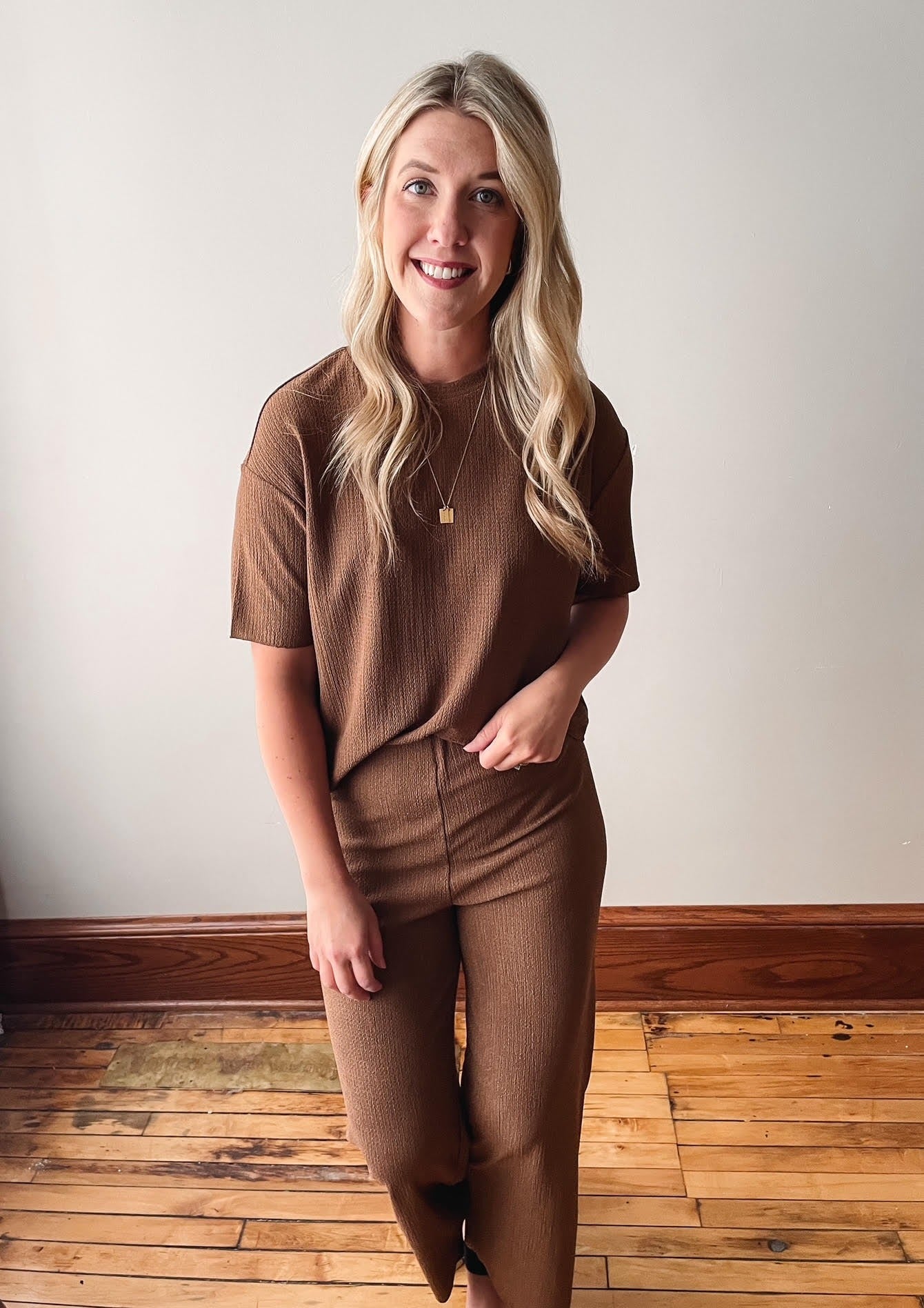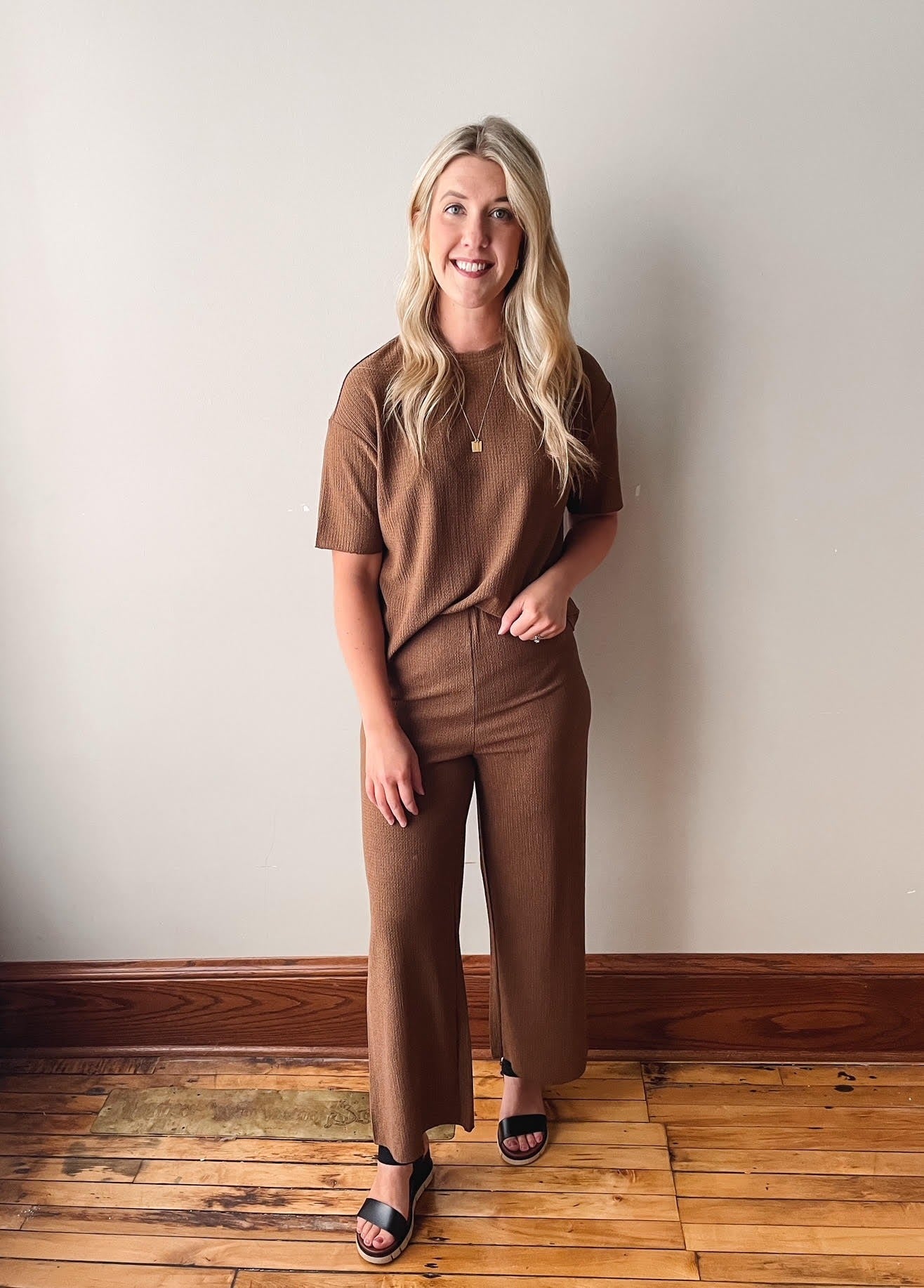 Textured brown pull on cropped pants.
