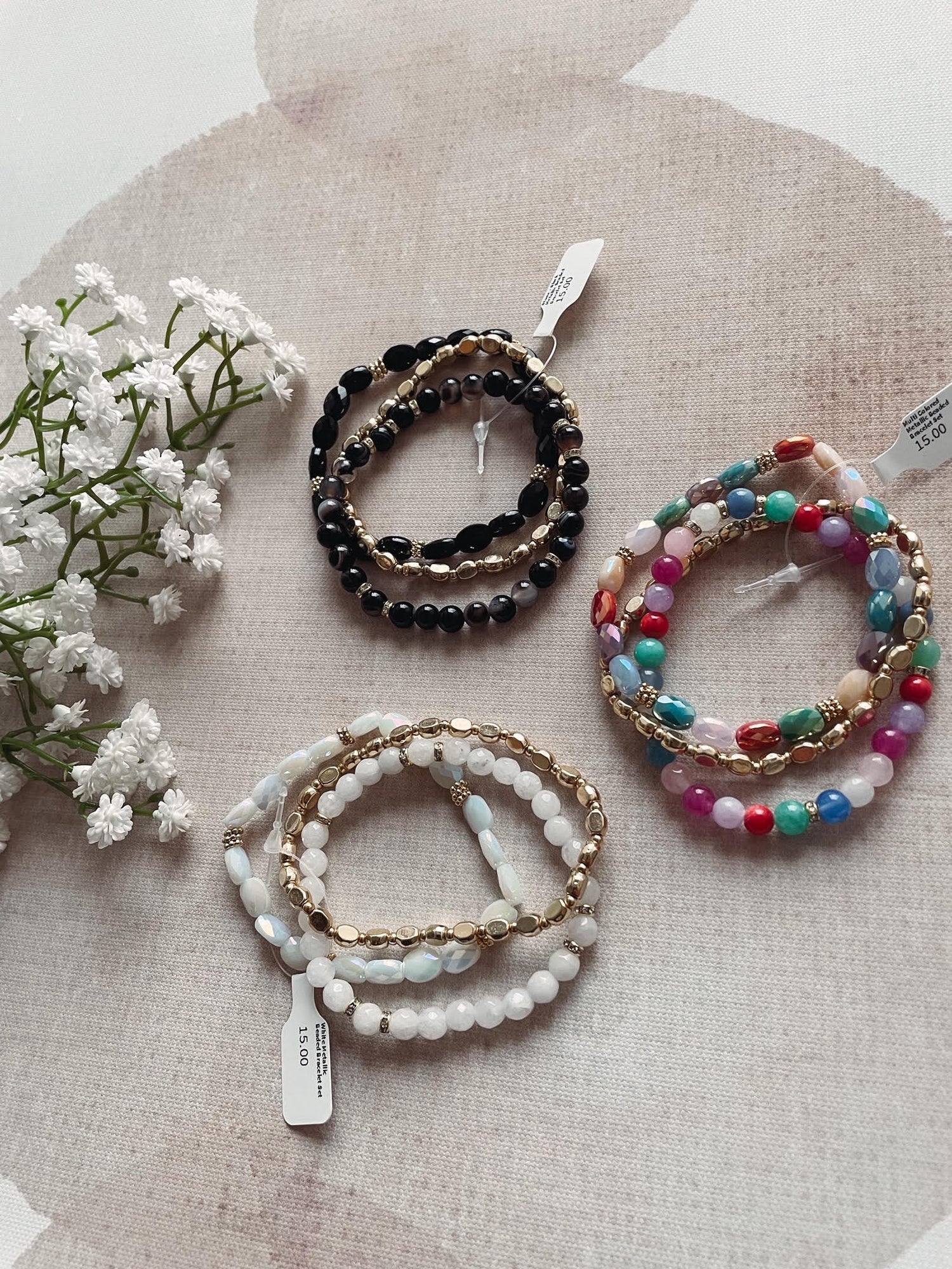 White Metallic Beaded Bracelet Set