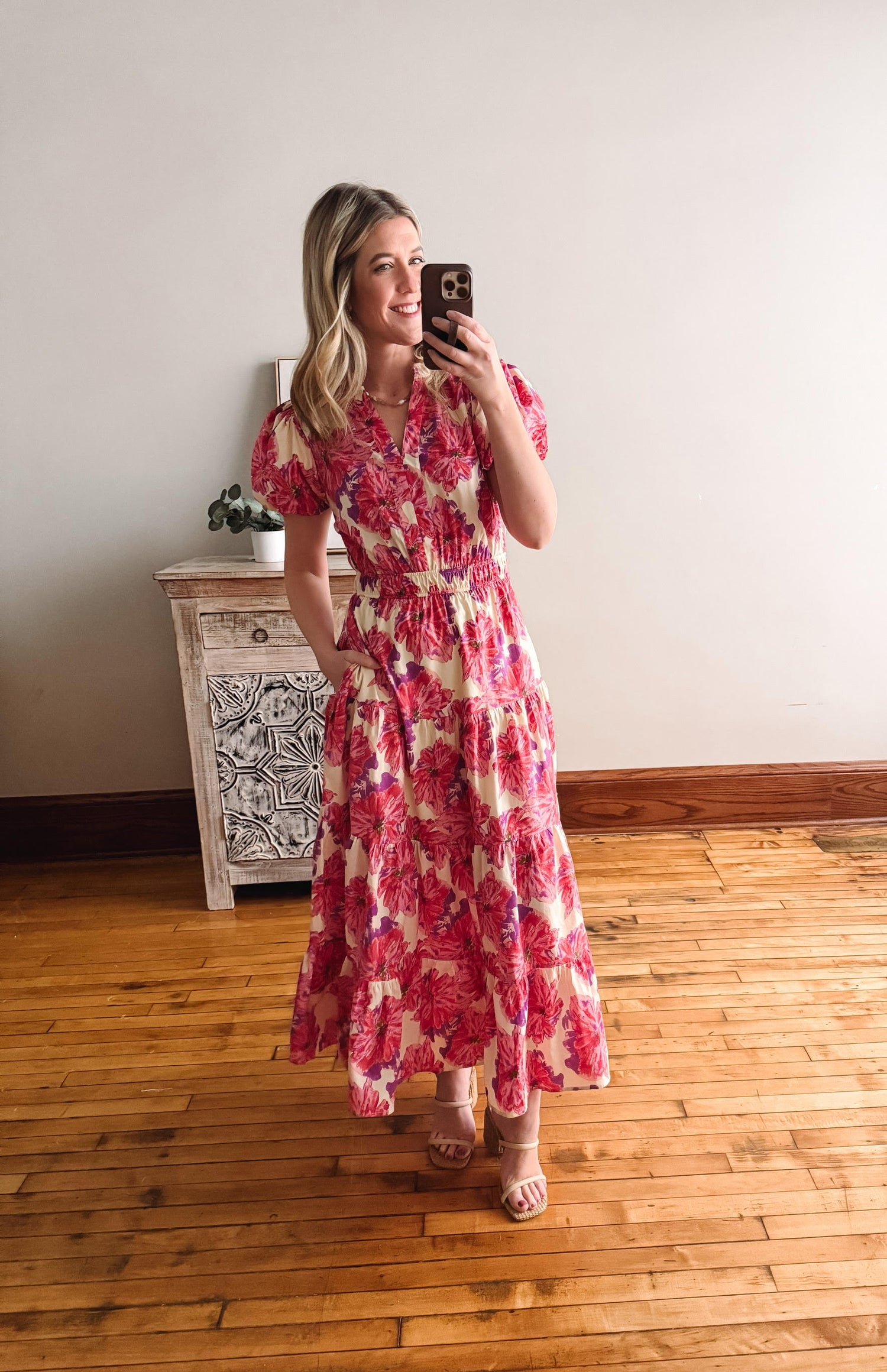 Step into spring with this charming red floral midi dress that's equal parts fun and fabulous. The soft cotton fabric drapes beautifully with a playful tiered skirt, while adorable bubble sleeves and a flattering V-neckline keep things flirty. An elastic waist ensures all-day comfort, and practical side pockets are the cherry on top. Fully lined and ready for any occasion, this dress brings effortless style with a cheerful botanical twist.